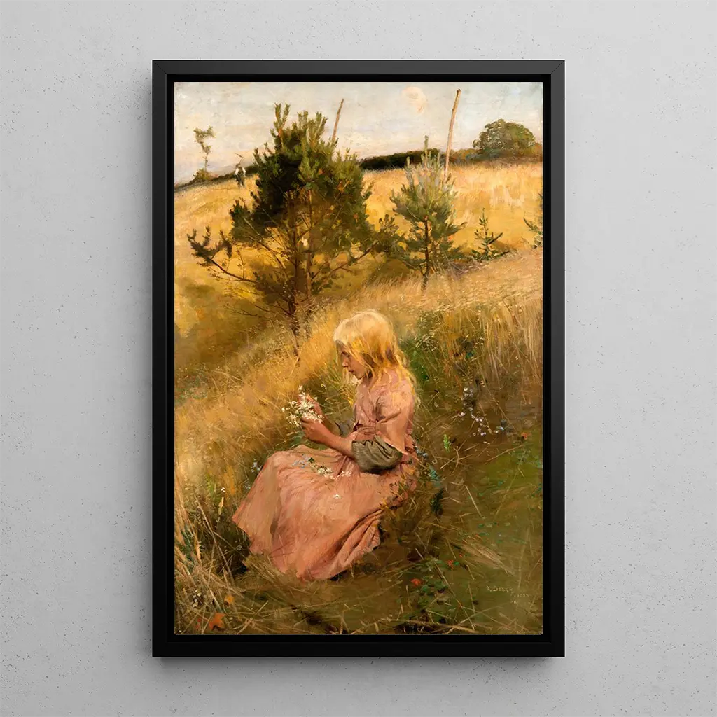 Richard Bergh, 1800-luvun ruotsalainen taiteilija, tunnetaan työstään, joka yhdistää realismia impressionistiseen kosketukseen. Aikansa taidesuuntauksilta vaikutteita saanut, hän onnistui vangitsemaan arkipäivän hetkiä erityisellä herkkyydellä. Bergh opiskeli Tukholman kuninkaallisessa taideakatemiassa ja oli esillä eurooppalaisessa taiteessa matkoillaan. Hänen teoksensa, usein keskittyen luonnon ja kodin elämän teemoihin, kertovat ajasta, jolloin taide pyrki ilmaisemaan tunteita yksinkertaisten mutta vaikuttavien kohtauksien kautta. "Fille cueillant des fleurs" on täydellinen esimerkki hänen taidostaan ikuistaa lapsuuden ohikiitävä kauneus.