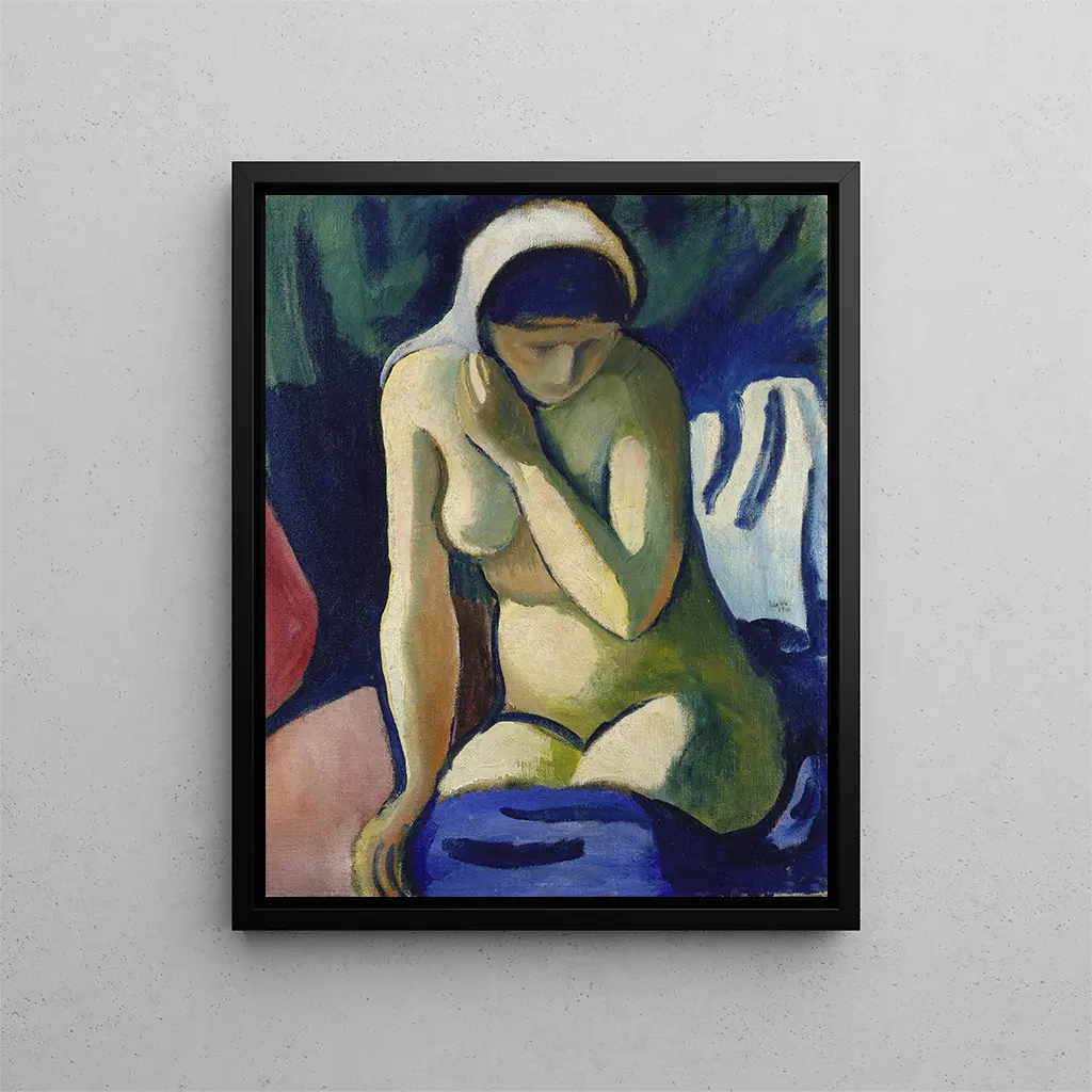Taidetuloste Fille nue avec foulard - August Macke – Kiehtova johdanto Modernin taiteen eloisassa universumissa teos "Fille nue avec foulard" August Mackelta erottuu rohkeudellaan ja kauneudellaan. Tämä 1910 valmistunut kangas vangitsee huomion mestarillisella värien ja valon käytöllä, kutsuen katsojan sukeltamaan maailmaan, jossa tunne ja herkkyys yhdistyvät. Nuoren naisen esittäminen, sekä haavoittuvainen että vahva, herättää vapauden ja intiimiyden tunteita. Macken herkkä koostumus, yhdistettynä hänen ainutlaatuiseen tyyliinsä, tekee tästä teoksesta todellisen mestariteoksen, joka jatkaa kiehtomista ja inspiroimista. Teoksen tyyli ja ainutlaatuisuus Macke, ekspressionismin liikkeen merkittävä hahmo, erottuu kirkkaalla väripaletillaan ja innovatiivisella lähestymistavallaan muotoon. "Fille nue avec foulard" ilmentää täydellisesti tätä estetiikkaa. Vivid värit, syvistä punaisista rauhoittaviin sinisiin, sekoittuvat harmonisesti luoden sekä iloisen että pohdiskelevan ilmapiirin. Nuoren naisen piirteiden hienostuneisuus, korostettuna hänen ympärilleen leijuvalla huivilla, antaa kokonaisuudelle keveyttä, joka on lähes ilmava. Tämä kontrasti alastomuuden ja tekstiilisen lisävarusteen välillä herättää kiehtovan dualismin, joka on altistumisen haavoittuvuudesta ja suojasta. Macke onnistuu vangitsemaan aiheensa ytimen harvinaisen emotionaalisen syvyyden kanssa, tehden tästä teoksesta sekä helposti lähestyttävän että salaperäisen. Taiteilija ja hänen vaikutuksensa August Macke, syntynyt vuonna 1887 Meschedessä, pidetään usein yhtenä saksalaisen ekspressionismin pioneereista. Hänen uransa, vaikka traagisesti lyhyt hänen ennenaikaisen kuolemansa vuoksi vuonna 1914, on jättänyt pysyvän jäljen taiteen maailmaan. Matkoilta Ranskassa ja kohtaamisistaan muiden aikalaistensa, kuten Henri Matisse ja Pierre Bonnard, kanssa Macke osasi sisällyttää fauvismin ja kubismin elementtejä omaan tyyliinsä. Hänen teoksensa erottuu jatkuvasta värin ja valon etsinnästä, ja "Fille nue avec foulard" on täydellinen esimerkki tästä. Tämä kangas todistaa hänen sitoutumisestaan