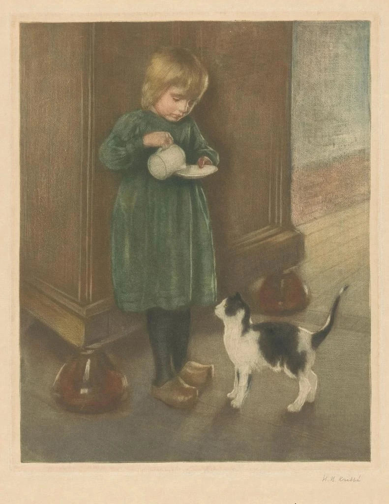 Tyttö ruokkii kissaa - Heinrich M. Krabbé
