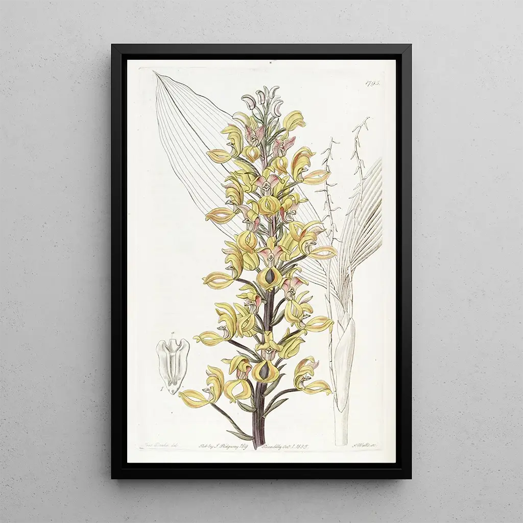 Sydenham Edwardsin taidegrafiikka Upea Govenia on teos, joka herättää hienostuneisuuden ja eleganssin kukkien maailmasta. Sen kirkkaat violetin ja valkoisen sävyt vetävät heti huomion puoleensa. Pienten terälehtien yksityiskohtainen ja tarkka kuvaus luo rauhallisen ja hienostuneen tunnelman. Edwardsin käyttämä vesiväritekniikka mahdollistaa valon hienovaraisen vangitsemisen, tuoden eloa tähän eksoottiseen kasviin. Jokainen teoksen elementti näyttää tanssivan lempeän auringonsäteen alla, kutsuen pidempään luonnon ihailuun.