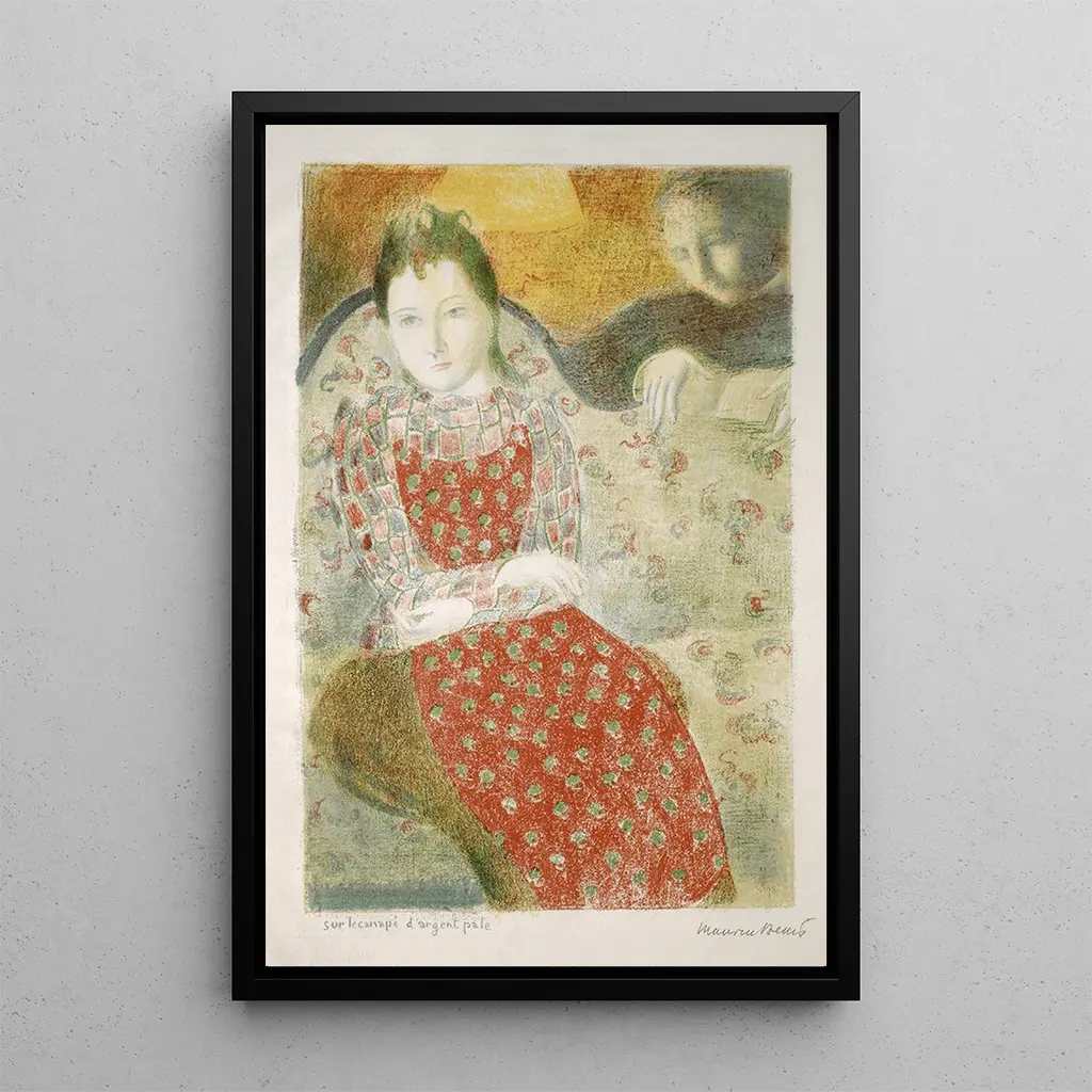 Dans cette œuvre, Maurice Denis nous plonge dans un univers délicat et poétique. Le tableau "Sur le canapé argenté pâle" évoque une atmosphère de tranquillité et de douceur. Les couleurs pastel, dominées par des nuances argentées et des touches de rose, créent un espace intime où la lumière semble caresser les formes. La composition, centrée sur une figure féminine assise, invite à la contemplation et à la rêverie. Les motifs floraux et les textures délicates renforcent cette impression de sérénité, faisant de cette toile un véritable havre de paix visuel.