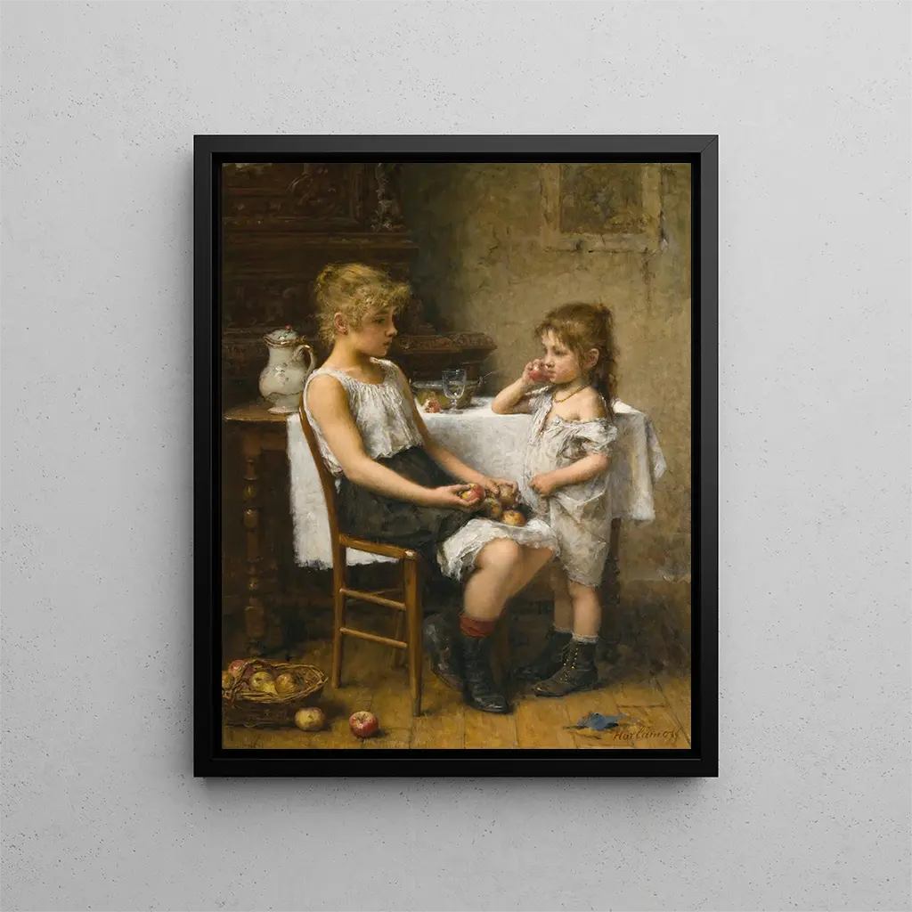 Valitse taidetuloste omenista - Alexei Harlamoff – Houkutteleva johdanto Hämmästyttävän taiteen maailmassa jotkut teokset onnistuvat vangitsemaan arkipäivän olemuksen samalla ylittäen ajan ja tilan. "Valitse taidetuloste omenista" Alexei Harlamoffilta on täydellinen esimerkki tästä. Tämä kangas, täynnä pehmeyttä ja hienostuneisuutta, tarjoaa sukelluksen yksinkertaiseen hetkeen, mutta täynnä merkityksiä. Tarkastellessaan tätä teosta katsoja siirtyy maailmaan, jossa luonto ja ihminen kietoutuvat harmonisesti yhteen, paljastaen tavallisten asioiden kauneuden. Kohtaus kuvaa nuorta tyttöä, keskittyneenä hedelmien valintaan, ja kannustaa pohtimaan pieniä päätöksiä, jotka täplittävät elämäämme. Hienovarainen valo, pastellisävyt ja yksityiskohtien hienostuneisuus tekevät tästä teoksesta todellisen mestariteoksen, kutsun mietiskelyyn. Tyylin ja teoksen ainutlaatuisuuden Alexei Harlamoffin tyyli erottuu kyvyllään yhdistää realismi ja impressionismi, luoden runollisen tunnelman. "Valitse taidetuloste omenista" -teoksessa taiteilija käyttää pehmeitä värejä, jotka viestivät lämpimästä iltapäiväauringosta. Lehtien vihreän sävyt, kirkkaanpunaiset omenat ja nuoren tytön herkkä iho sulautuvat luoden kiehtovan visuaalisen harmonian. Valo näyttelee keskeistä roolia tässä teoksessa, valaisten hienovaraisesti muotoja ja luoden hienovaraisia varjoja, jotka lisäävät syvyyttä kohtaukseen. Harlamoff onnistuu vangitsemaan paitsi esineiden ulkonäön myös niiden välittämän tunteen. Nuoren tytön tarkka asento, hänen keskittynyt katseensa, viestivät intiimistä yhteydestä valitsemiinsa hedelmiin, korostaen päivittäisten tekojen merkitystä. Taiteilija ja hänen vaikutuksensa Syntynyt Venäjällä vuonna 1840, Alexei Harlamoff on onnistunut vakiinnuttamaan asemansa yhtenä aikansa vaikutusvaltaisimmista taiteilijoista. Hän kouluttautui Pietarin taideakatemiassa ja kehitti ainutlaatuisen tyylin, joka yhdistää akateemisen perinteen ja uusimmat taidesuuntaukset. Harlamoffia kosketti erityisesti maaseudun kauneus ja arjen yksinkertaisuus, teemat, jotka toistuvat hänen teoksissaan.