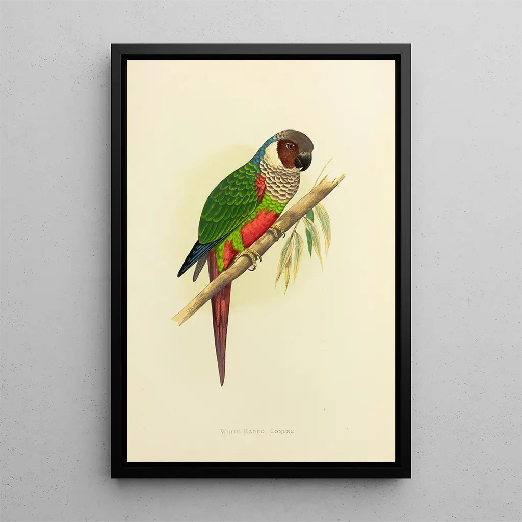 Taidegrafiikka Conure korvanvalkoisesta Alexander Francis Lydonista johdattaa meidät eloisaan maailmaan, täynnä värejä ja elämää. Tämä taulu, joka on täynnä yksityiskohtia, vangitsee tämän eksoottisen linnun olemuksen, sen kirkkaat vihreät ja keltaiset höyhenet, jotka vaikuttavat lähes värisevän valon alla. Lydonin tekniikka, yhdistäen vesiväriä ja kaiverrusta, antaa teokselle syvyyttä ja luo sekä iloisen että rauhallisen tunnelman. Jokainen sivellinvedos kuvaa linnun sulavaa liikettä, ikään kuin se olisi valmis lentämään, tarjoten katsojalle kutsun luonnonkauneuden ihailuun.