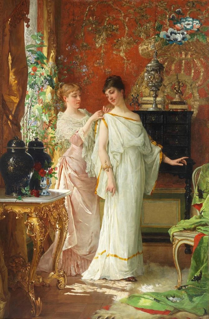 Kohdassa "Valmistelut" Jan Verhas johdattaa meidät intiimiin tunnelmaan, jossa pehmeä valo hyväilee hahmojen kasvoja. Kompositio, keskittyen naiseen, joka valmistautuu johonkin aktiviteettiin, herättää rauhan ja harmonian tunteen, jotka kutsuvat mietiskelyyn. Pastellivärit, pääasiassa lämpimissä sävyissä, luovat lämpimän ja kodikkaan tunnelman. Verhasin tekniikka, joka yhdistää realismia ja impressionistisia kosketuksia, herättää jokaisen yksityiskohdan eloon, olipa kyseessä vaatteiden laskokset tai kasvojen hienovaraiset ilmeet. Tämä teos on todellinen kunnianosoitus arjen elämälle, vangiten ohikiitävän hetken suurella herkkyydellä.