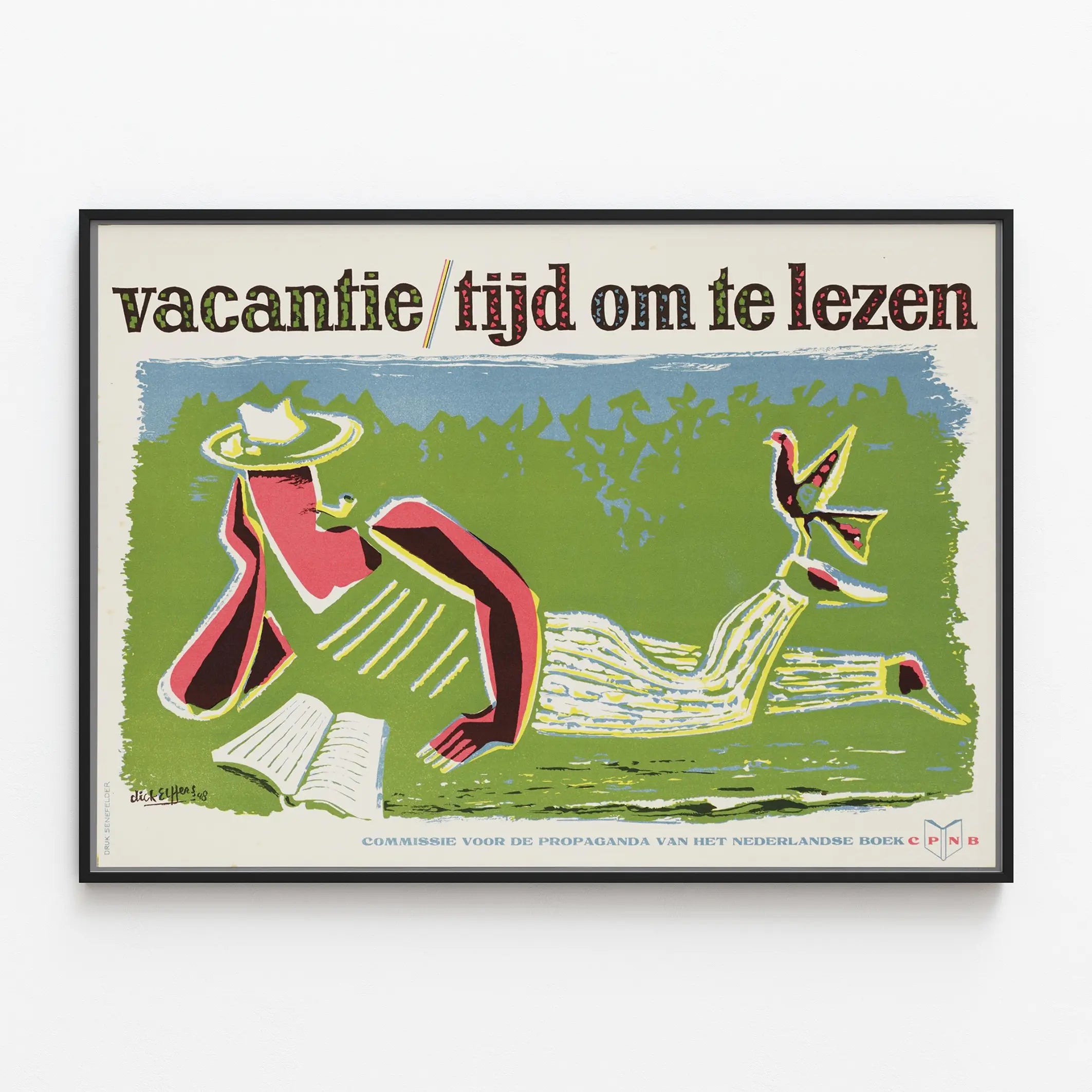 Tämä vintagejuliste nimeltä « Vacantie Tijd Om Te Lezen » on erinomainen teos tuomaan taiteellista ja värikästä vivahdetta seinäkoristeluusi. Tämä juliste esittää tyylitellyn siluetin makoilemassa nurmikossa lukien, savukkeella ja hatulla, graafisessa tyylissä, jossa on kirkkaita ja kontrastisia värejä. Vihreän ja sinisen hallitsevuus, johon on sekoitettu punaista ja keltaista, luo kesäisen ja rentouttavan tunnelman, täydellisen viestin lomien rauhallisuudesta. Tämä seinätaulu kutsuu hidastamaan tahtia ja nauttimaan vapaa-ajasta lukemisen parissa, runollinen ja ajaton viesti, joka resonoi sisustuksen ystävien kanssa. Täydellinen oleskeluun, makuuhuoneeseen tai rentoutumisalueelle, tämä juliste tuo kotiisi kulttuurin ja lempeyden sävyjä. Julisteen yläosassa olevat kirjaimet rohkeassa ja monipuolisessa typografiassa vahvistavat lomien lukutauon teemaa. Olipa se kehyksessä tai vain seinälle ripustettuna, tämä vintagejuliste muodostuu ainutlaatuiseksi osaksi seinäkoristeluasi, yhdistäen estetiikan ja mietiskelyn hengen.