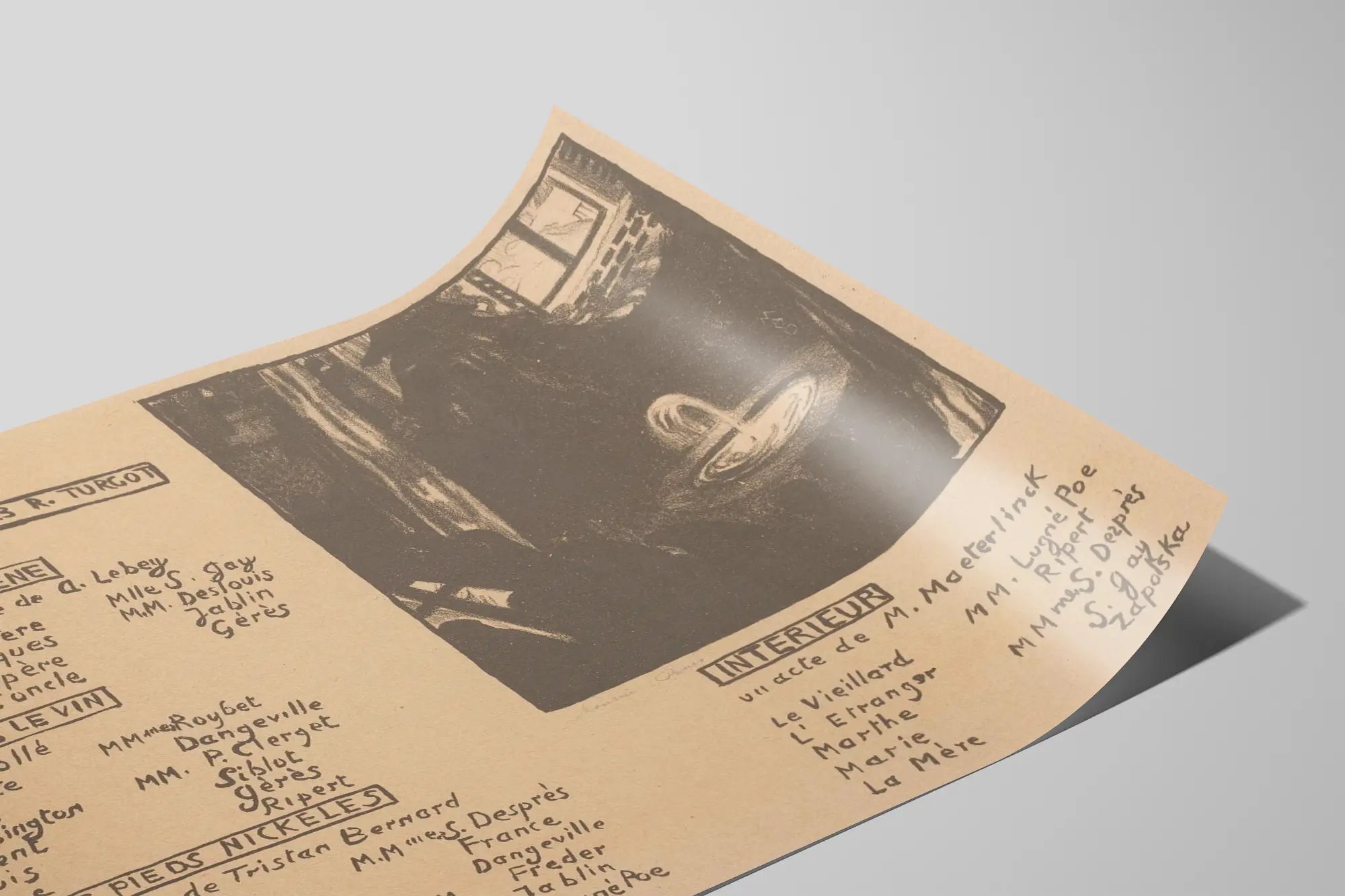 Löydä tämä ainutlaatuinen vintage- juliste, joka esittää vanhan teatteriohjelman nimeltä "L'Œuvre". Tämä juliste on täydellinen seinäkoriste teatterin, taiteen ja kulttuurihistorian ystäville. Vaalean beigen taustan päällä tämä kuva esittää käsin kirjoitettua esitysjärjestystä, jossa ovat näytösten otsikot ja hahmojen nimet, luoden tunnelman 1900-luvun alun teatteriohjelmasta. Julisteen oikealla puolella on herkkä ja vaikuttava kuva valaistusta suihkulähteestä hämärässä sisätilassa, mikä luo mielenkiintoisen visuaalisen kontrastin yhdistäen tekstiä ja kuvaa. Tämä tasapainoinen yhdistelmä tekstin ja graafisen kuvan välillä tekee tästä julisteesta aitoa ja nostalgista sisustuselementtiä. Olitpa teatterin harrastaja tai etsimässä retro- ja taiteellista seinäjulistetta, tämä vintage- juliste sopii täydellisesti olohuoneeseen, toimistoon tai kulttuuritilaan. Sen vanha ilme antaa sisustuksellesi tyylikkään ja ajattoman vivahteen, kerronnan kautta keräten tarinoita ja hahmoja. Panostamalla tähän seinäkoristeeseen valitset esteettisen ja omaleimaisen teoksen, joka korostaa seinäsi vanhan ajan charmilla.