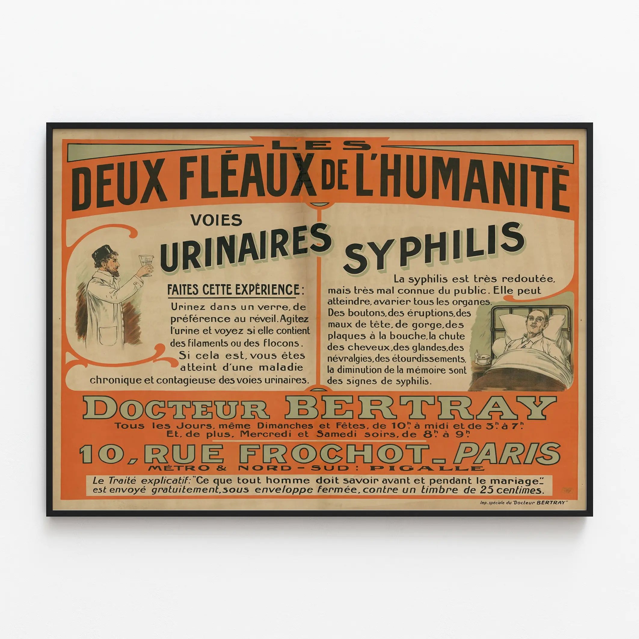 Tämä retro-tyylinen vintage juliste on ainutlaatuinen seinäkoriste, joka kiinnittää huomion vaikuttavalla viestillään. Nimeltään « Ihmiskunnan kaksi vitsaa », se korostaa kahta vakavaa sairautta: virtsateitä ja syfilistä. Suurilla mustilla kirjaimilla oranssitaustalla tämä juliste on vaikuttava esimerkki vanhasta lääketieteellisestä informatiivisesta julisteesta. Se kehottaa tekemään yksinkertaisen kokeen kroonisen ja tarttuvan virtsatieoireen havaitsemiseksi: riittää, että virtsaa lasiin ja tarkkailee mahdollisia säikeitä tai hiutaleita. Syfilistä käsittelevä osa selittää sen moninaisia oireita, kuten näppylöitä, ihottumia, kipuja, suun haavaumia, hiustenlähtöä, neurologisia häiriöitä, ja muistuttaa taudin vakavuudesta, joka on usein yleisön vähäisesti tunnettu. Tämä mainosjuliste esittää myös lääkärin Bertrayn muotokuvan, joka tarjoaa vastaanottoja Pariisissa, Frochot-kadulla 10. Julisteen muotoilu on tyypillinen vanhoille kansanterveysjulisteille, jossa käytetään runsaasti typografiaa, tarkkaa kuvaa ja rajallista mutta kontrastista väripalettia, joka kiinnittää katseen. Se on historiallinen seinäkoriste, joka sopii vintage-tiloihin, lääkärin vastaanottoihin, museoihin tai graafisen taiteen harrastajille. Tämä vintage-plakaatti lisää oppimisen ja sisustuksen ulottuvuuden jokaiseen sisätilaan, yhdistäen lääketieteen historian ja graafisen estetiikan. Se soveltuu kehystettäväksi ja esitettäväksi seinätauluna olohuoneessa, toimistossa tai odotustilassa, luoden aitoa ja omaleimaista tunnelmaa. Tämän julisteen lisääminen seinäkoristeeseesi on myös harvinaisen visuaalisen todistuksen säilyttämistä menneen ajan tiedonvälityksen ja ehkäisyn menetelmistä.