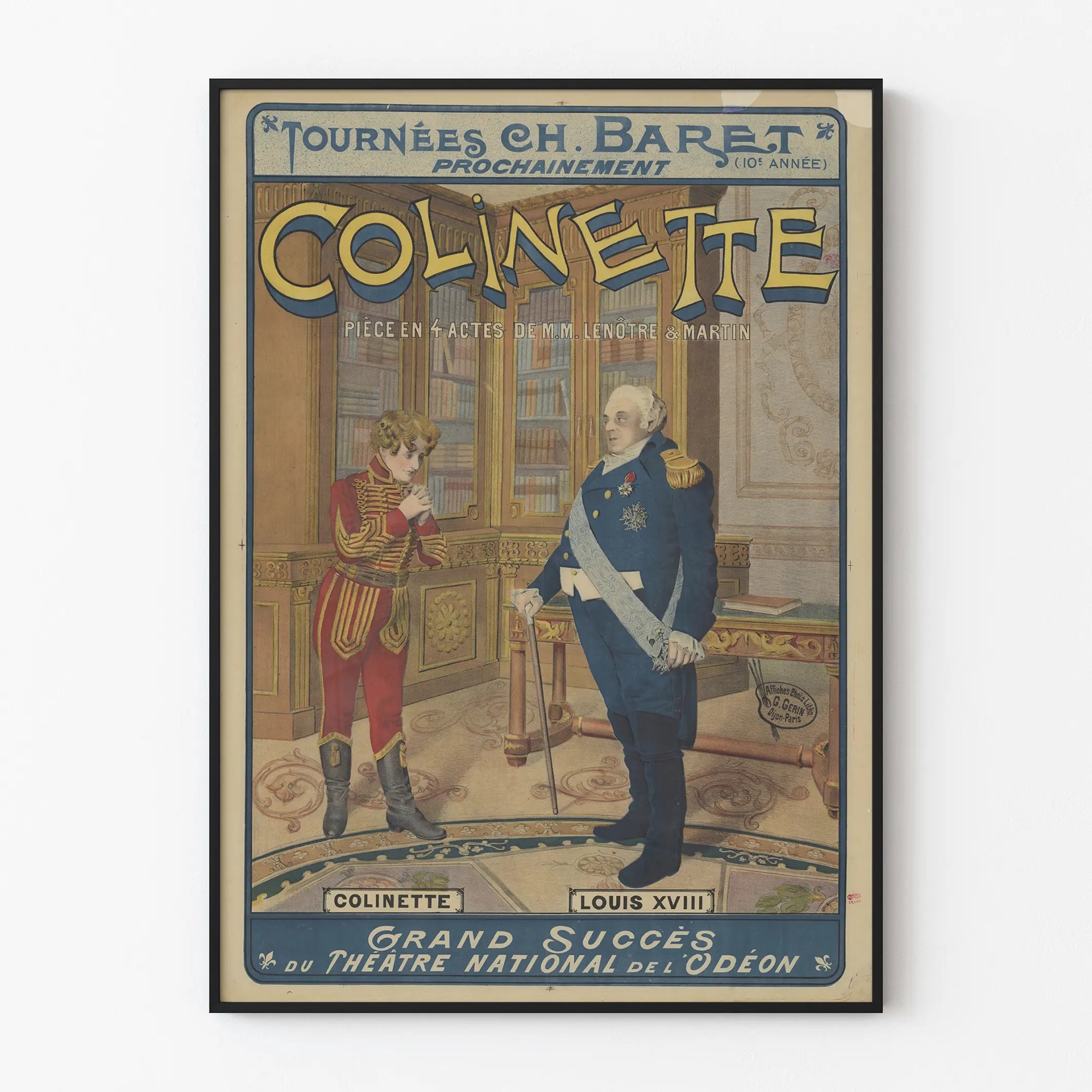 Tämä vanha juliste "Tournées Ch. Baret" -sarjasta esittelee näytelmän "Colinet" neljässä näytöksessä, jonka on signeerannut M.M. Lenôtre & Martin. Se erottuu retro-tyylillään ja koristeellisuudellaan, mikä on tyypillistä 1900-luvun alun teatterijulisteille. Kuvitus esittää kahta päähenkilöä, "Colinette" ja "Louis XVIII", rikkaasti koristellussa sisätilaympäristössä, taustalla kirjastohuone ja tyylikäs kalustus. Lämpimät värit ja huolellisesti yksityiskohtainen toteutus antavat tälle julisteelle taiteellisen arvon, sillä se juhlistaa näytelmän suurta menestystä Théâtre National de l'Odéonissa. Tämä historiallinen juliste on ihanteellinen seinäkoriste teatteritaiteen harrastajille, klassikkonäytelmien ystäville tai vintage-hengessä sisustettuun huoneeseen, toimistoon tai kulttuuritilaan. Sen vanha grafiikka ja vahva typografia tekevät tästä julisteesta keräilyesineen ja koristeellisen seinätaideteoksen, joka lupaa lisätä eleganssia ja historiaa mihin tahansa sisustukseen. Tämä juliste on täydellinen korostamaan tilaa taiteellisella ja kirjallisella ilmapiirillä, joka muistuttaa ranskalaisen teatterin suurista hetkistä.