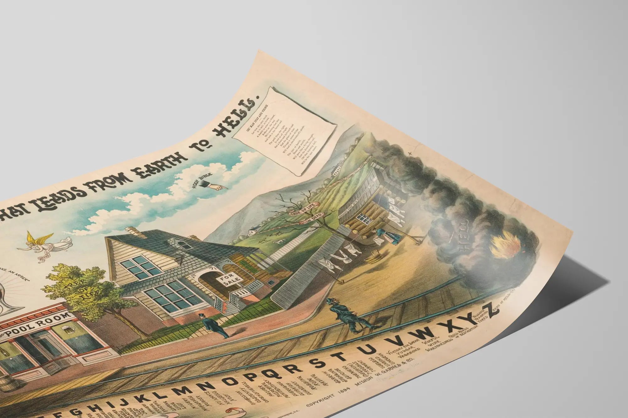 Tämä seinäkoriste esittää rautatietä, jonka varrella on kirjaimia, jokainen liittyen erilaisiin käyttäytymisiin tai mielentiloihin, kuvastaen metaforista etenemistä kohti helvettiä. Ympärillä olevat sanat ja lauseet kuvaavat elämän vaiheita ja moraalisia valintoja, vahvoine symboleineen kuten elämänpuu ja kuollut puu, houkutusta symboloiva baari ja biljardi, sekä myytävä talo, joka toimii visuaalisen keskuksena.