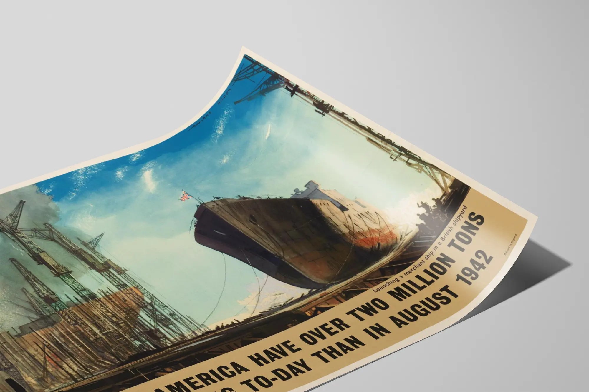 Tämä vintage-plakaatti kuvaa loistokkaasti kauppalaivan vesillelaskua brittiläisessä telakassa, korostaen Britannian ja Yhdysvaltojen merivoimien merkittävää kokoa. Tämä seinäkoriste herättää katseen sävyillään, jotka yhdistävät taivaan sinisen ja savunharmaan, symboloiden sekä teollista voimaa että merihistoriallista kontekstia. Juliste esittää suuren laivan vesillelaskussa, ylpeästi Britannian lipun liehuessa sen huipulla, ympäröitynä vaikuttavilla nostureilla rakennustelakalla. Tämä seinäkoriste sopii kaikille merihistoriasta, laivanrakennusteollisuudesta ja retro-taiteesta kiinnostuneille, jotka haluavat sisustaa tilansa aidolla julisteella, joka on täynnä vahvoja symboleita. Laivan majesteettisen siluetin ja yksityiskohtaisten nosturirakenteiden kontrasti muodostaa elävän taulun, joka kertoo sodan ponnisteluista ja molempien maiden teollisesta kyvystä. Täydellinen toimistoon, olohuoneeseen tai kirjastoon, tämä vintage-plakaatti luo sekä nostalgiaa että dynaamisuutta, täydellisesti korostaen seinää historiallisella vivahteella. Kuvassa on myös vahva typografia alareunassa, joka ilmoittaa 1943 vuoden laivamassan ylittävän 1942:n, antaen teokselle informatiivisen ja koristeellisen ulottuvuuden. Tämä seinäkoriste sopii erinomaisesti teolliseen, nykyaikaiseen tai klassiseen ympäristöön, tuoden merenkulun teemaan rohkeutta ja muistoa. Juliste erottuu huolellisesti suunnitellulla graafisella tyylillään, yhdistäen kuvituksen ja maalauksen realismin, tehden siitä sekä esteettisen että muistuttavan koriste-esineen. Se mahdollistaa persoonallisen seinän koristelun herättämällä eloon historian sivu ja samalla nauttien erinomaisesta visuaalisesta laadusta.