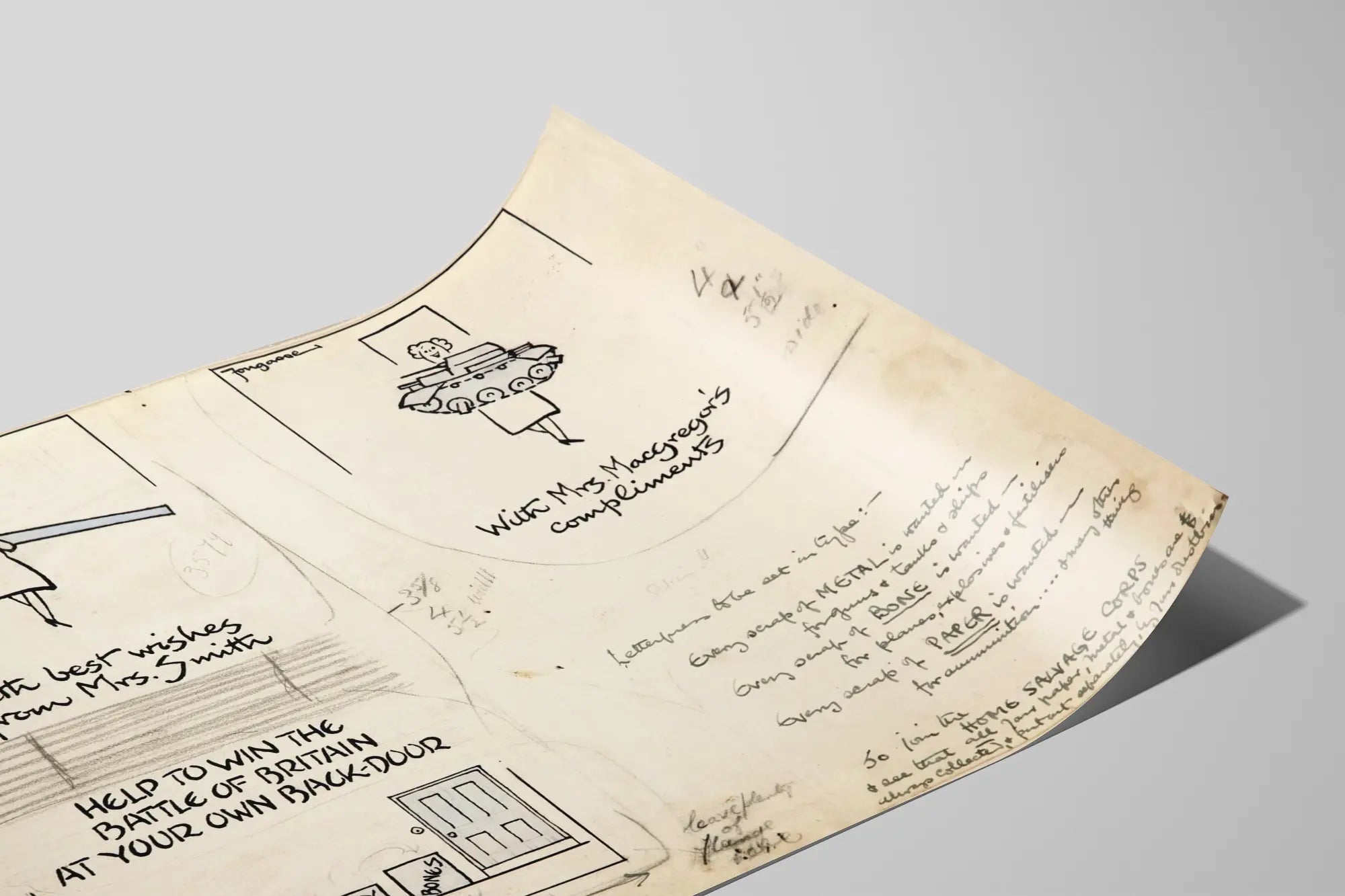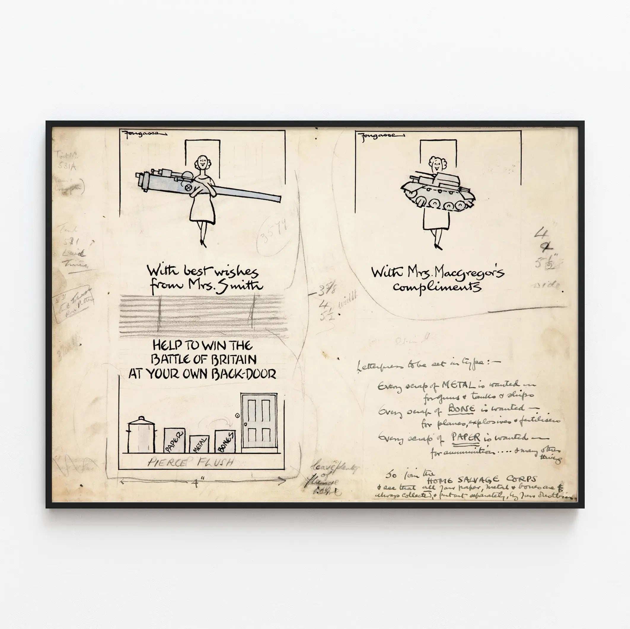 Tutustu tähän humoristiseen ja kantaaottavaan vintage-plakaattiin, joka kuvaa kutsua mobilisaatioon Home Salvage Corps -joukkojen puolesta Englannin taistelun aikana. Tämä juliste erottuu mustavalkoisella piirroksellaan, jossa on nainen, joka kantaa joko panssarintorjuntakanuunaa tai pienoista panssarivaunua, symboloiden materiaalien kierrätyksen keskeistä roolia sotaponnisteluissa. Kompositio on yksinkertainen ja suora, viestinä selkeä: "Auta voittamaan Englannin taistelu omalla takapihallasi". Alareunassa olevat astiat, joissa lukee "Paperi", "Metalli" ja "Luusto", korostavat kierrätysmateriaalien lajittelun ja keräyksen merkitystä aseiden, lentokoneiden, räjähteiden ja ammuksien valmistuksessa. Tämä juliste sopii täydellisesti retro- tai historiallisesti sisustettuun tilaan, tuoden ripauksen muistoa ja graafista suunnittelua 1900-luvun puolivälin tyyliin. Se sopii hyvin myös toimistoon, kirjastoon tai olohuoneeseen, erityisesti propagandajulisteiden ja kansantaiteen ystäville. Sen käsin kirjoitetut merkinnät lisäävät aitouden tuntua, mikä viehättää keräilijöitä ja historian harrastajia. Hanki tämä ainutlaatuinen juliste rikastuttaaksesi seinäkoristeitasi voimakkaalla visuaalisella ja symbolisella vaikutuksella.