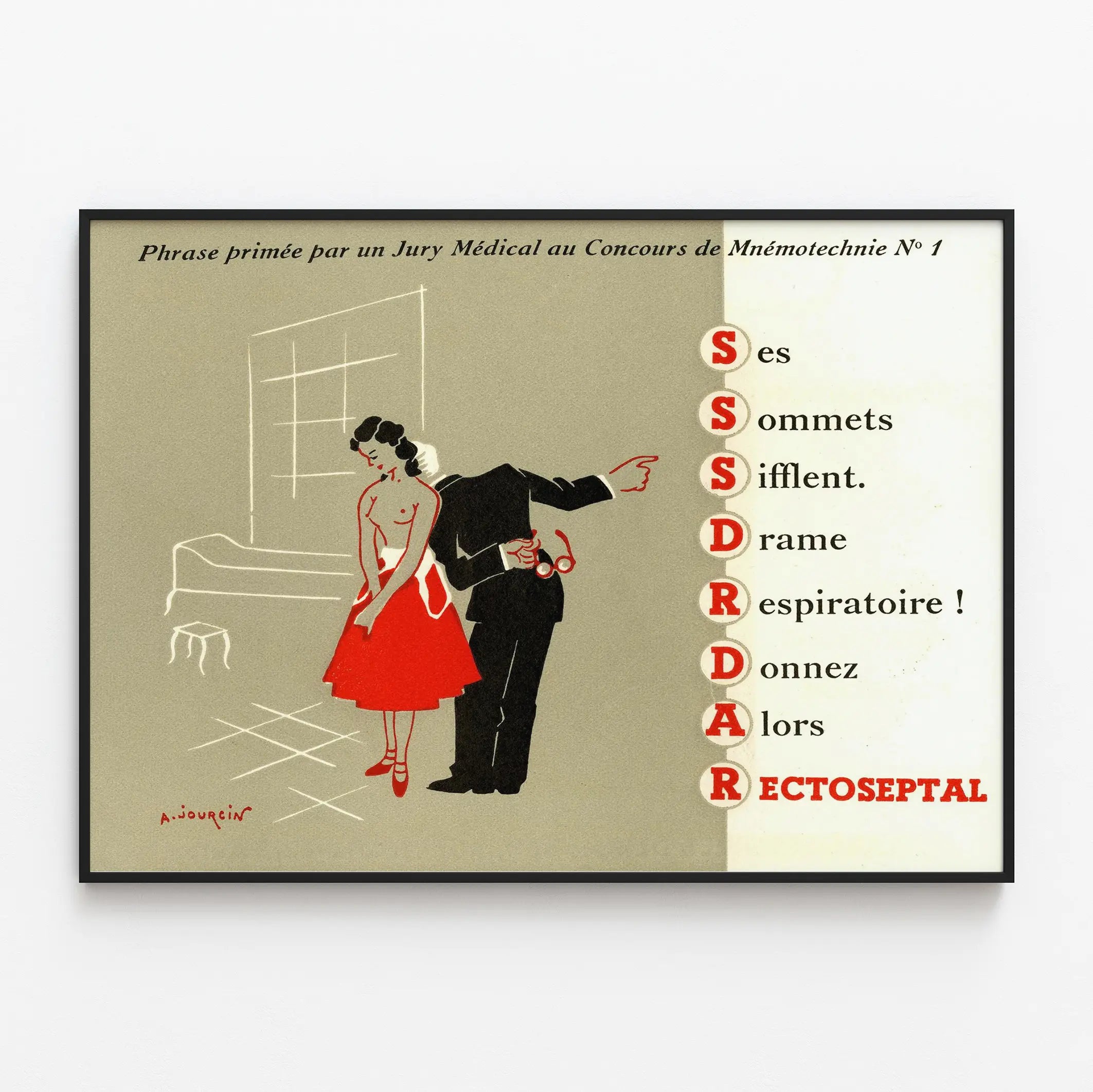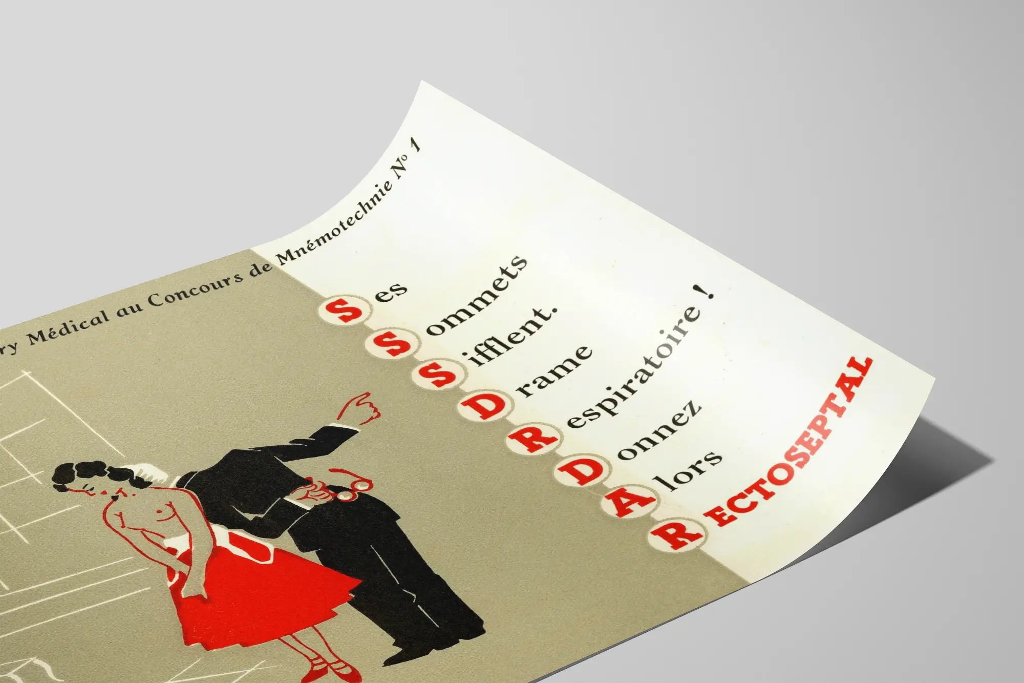 Tämä vintage-seinävaatejuliste, nimeltään « Voittanut lause lääkärijuryssä Mnemonistiikkakilpailussa N°1 », on ainutlaatuinen teos, joka viehättää retro-taiteen ja lääketieteellisen muotoilun ystäviä. Se esittää tyylitellyn kaksivärisen piirroksen punaisesta, mustasta ja beigestä, jossa on naisfiguuri punaisessa hameessa ja mies puvussa, joka aikoo ojentaa hänelle kätensä. Oikealla sijaitseva mnemoninen teksti leikkii punaisilla alkukirjaimilla, viitaten termiin "RECTOSEPTAL" lääketieteellisessä yhteydessä.