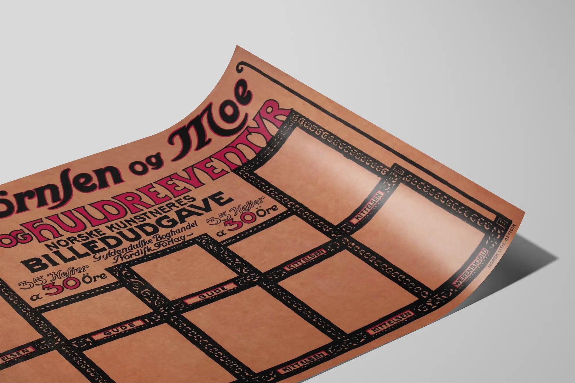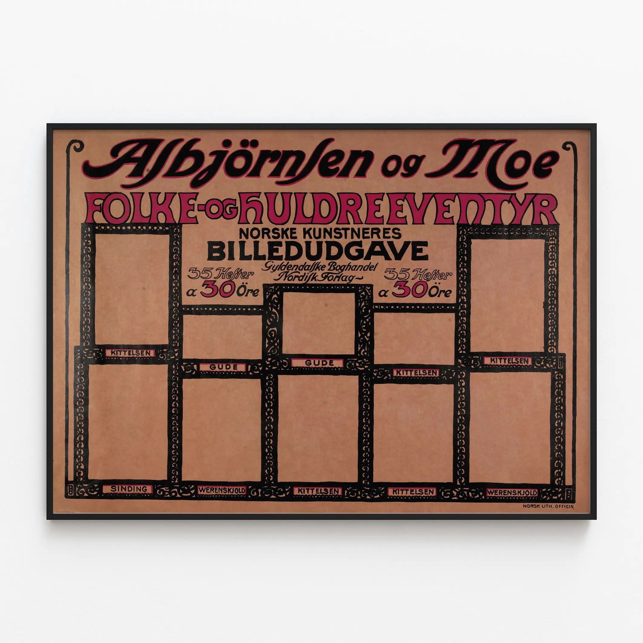 Tämä norjalainen vintage juliste „Asbjörnsen og Moe Folke-og Huldreeventyr“ on upea esimerkki typografisesta ja graafisesta taiteesta, joka on suunniteltu kirjallisen teoksen mainostamiseen. Tämä juliste korostaa suosittua norjalaista teosta, joka kokoaa kansantarinoita ja perinteisen kansanperinteen legendoja. Julisteen koostumus perustuu mustaan ja punaiseen piirrokseen, jossa on vahva typografinen tyyli, joka vangitsee heti huomion.