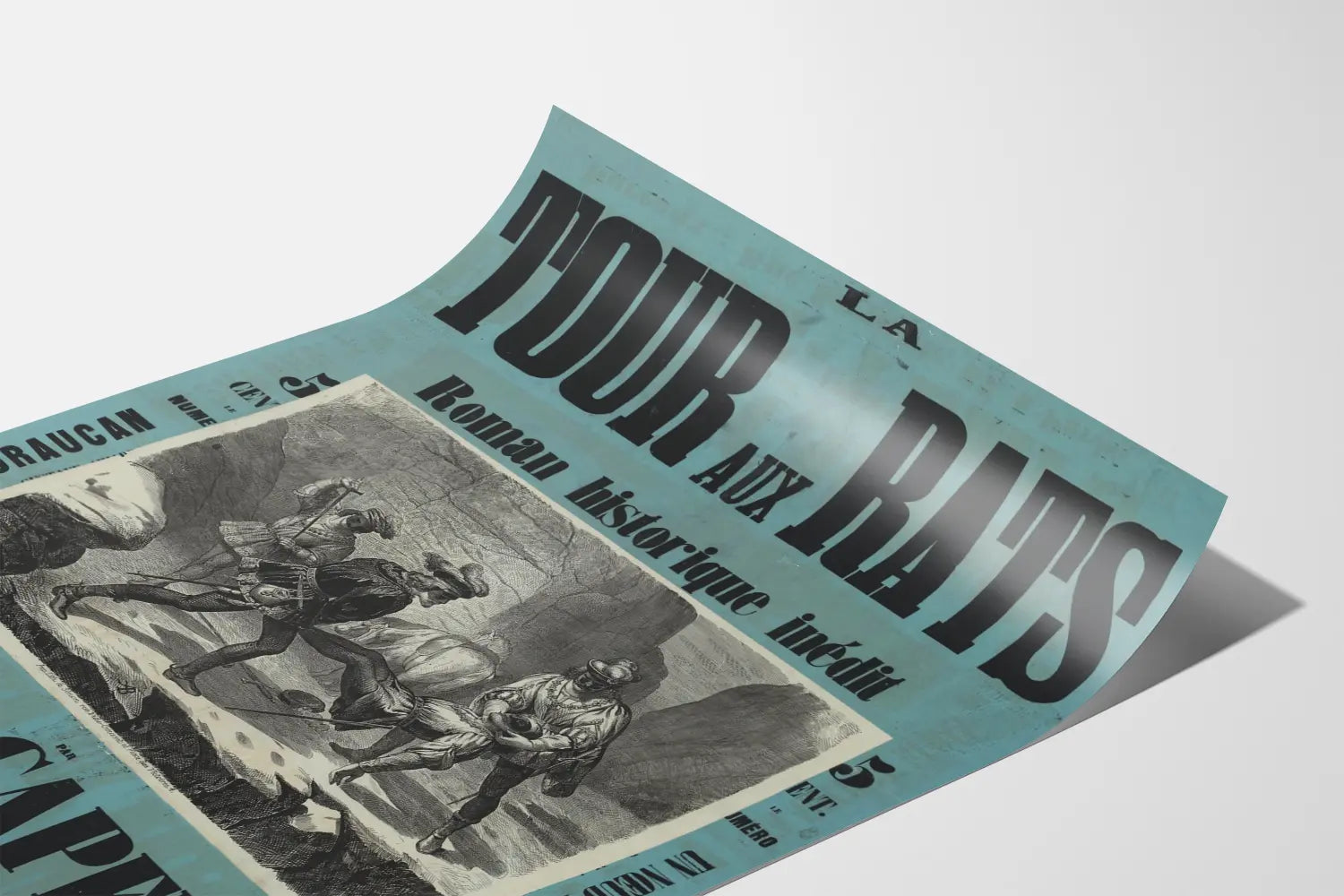 Löydä tämä alkuperäinen vanha juliste, joka juhlistaa ennen näkemätöntä historiallista romaania "La Tour aux Rats" Ernest Capendulta. Tämä vintage-seinäkoriste erottuu kirkkaansinisen taustansa ja kontrastin vuoksi mustalla tekstillään, jossa korostuu romaanin otsikko näyttävällä ja retrotyylisellä typografialla. Keskuskuva esittää mustavalkoisen kaiverruksen, joka kuvaa historiallista kohtausta, jossa kolme aikakauden vaatetettua henkilöä siirtää tajutonta tai loukkaantunutta miestä kallioisessa maisemassa, korostaen romaanin dramaattista tunnelmaa. Tämä vanha juliste on ainutlaatuinen kappale, täydellinen vintage-seinäkoristeiden ja historiallisten kirjallisuuden ystäville. Se tuo aitouden ja historiallisen eleganssin ripauksen mihin tahansa sisustukseen, olipa kyseessä olohuone, kirjasto tai toimisto. Valitsemalla tämän julisteen, saat typografisen ja kuvituksellisen teoksen, joka kertoo muinaisen tarinan ja antaa persoonallisuutta sisustukseesi. Se kuvastaa täydellisesti historiallista romaanimaailmaa ja on mysteerin ja viehätyksen täyttämä koriste-esine. Graafinen tyylinsä, jossa yhdistyvät teksti ja kaiverrettu kuva, tekee siitä myös upean esineen vanhojen julisteiden tai kirjallishistoriaan liittyvien asiakirjojen keräilijöille. Otsikon ilmeikäs esitys ja näkyvä tekijän maininta täydentävät tätä julistetta, joka lupaa ainutlaatuisen ja merkityksellisen seinäkoristeen.