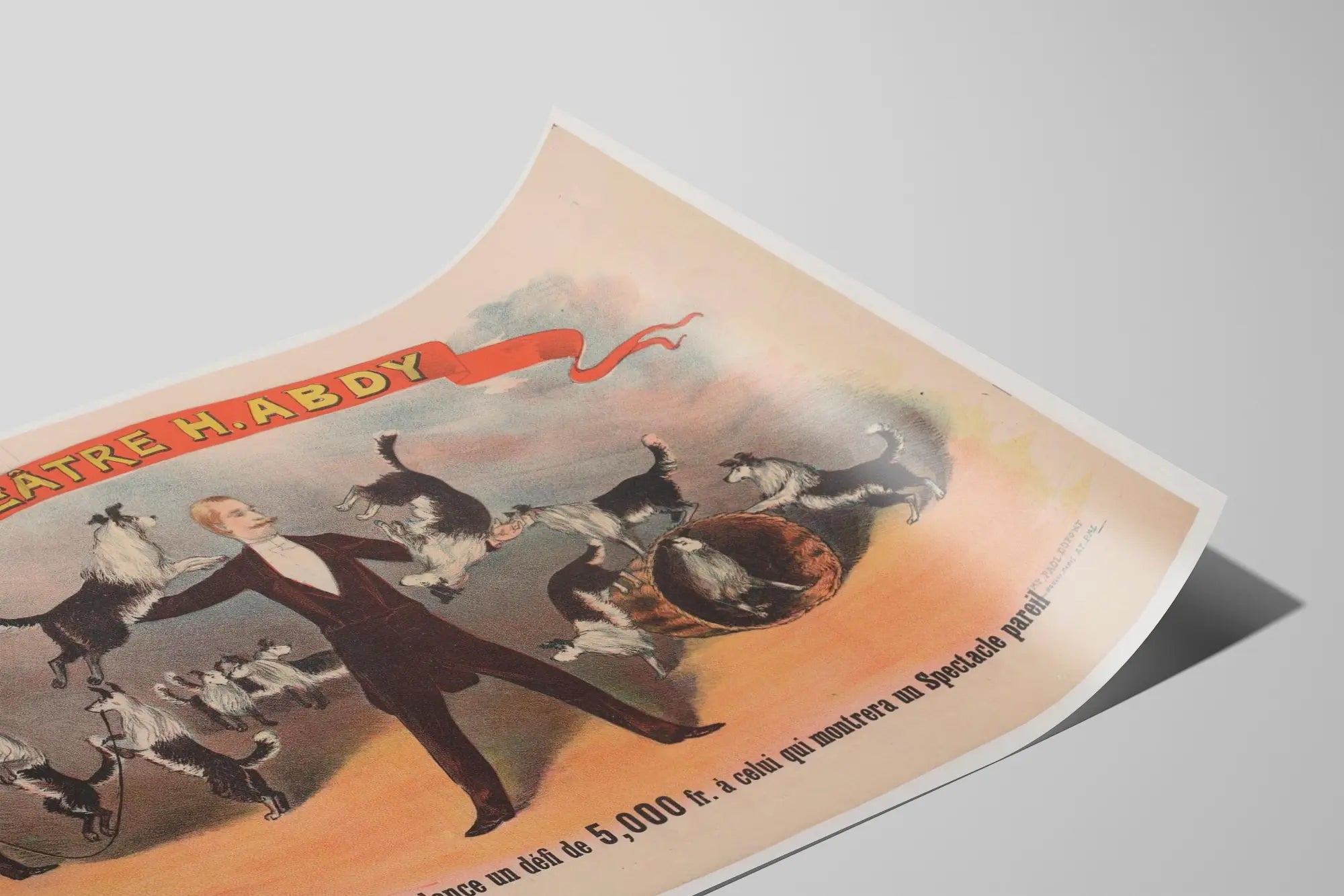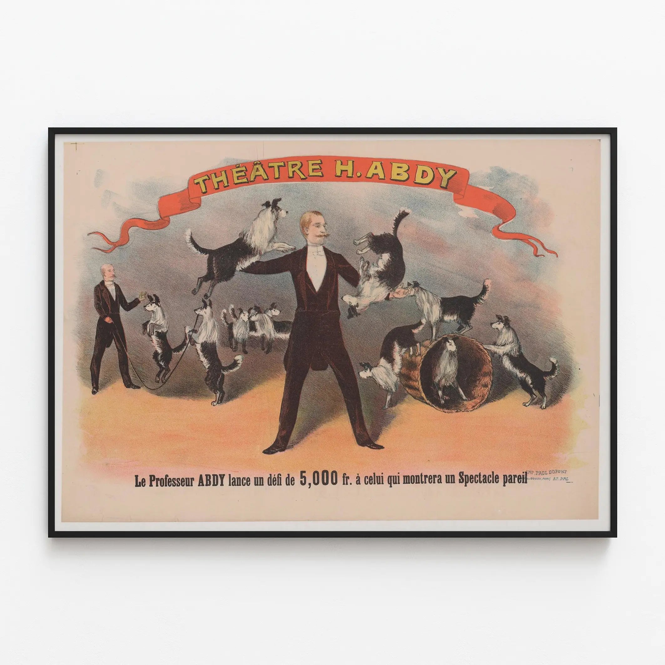 Tämä vintage juliste H. Abdy-teatterista esittelee merkittävän näytöksen älykkäistä koirista, joita ohjaa professori Abdy. Siinä nähdään värikäs ja elävä kuva, jossa taiteilija on keskellä, ympäröity useilla koulutetuilla koirilla, osa tasapainossa tai hyppäämässä vaikuttavia hyppyjä. Tämä mainosjuliste, teatterin ja viihdyttävän tunnelman täyttämä, vangitsee ajan koirailtojen olemuksen, joissa eläimet osoittivat poikkeuksellisia taitojaan isäntänsä ohjauksessa.
