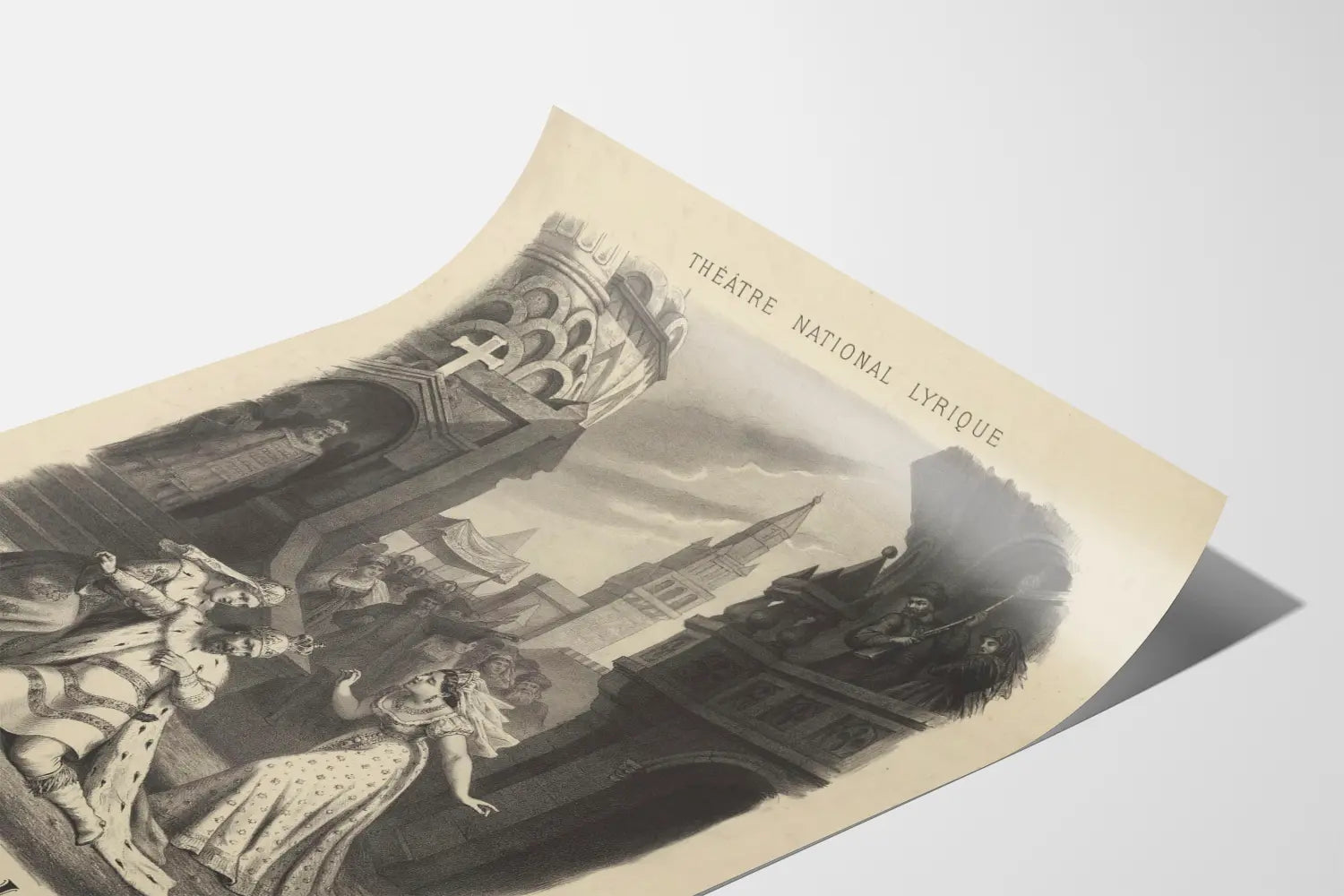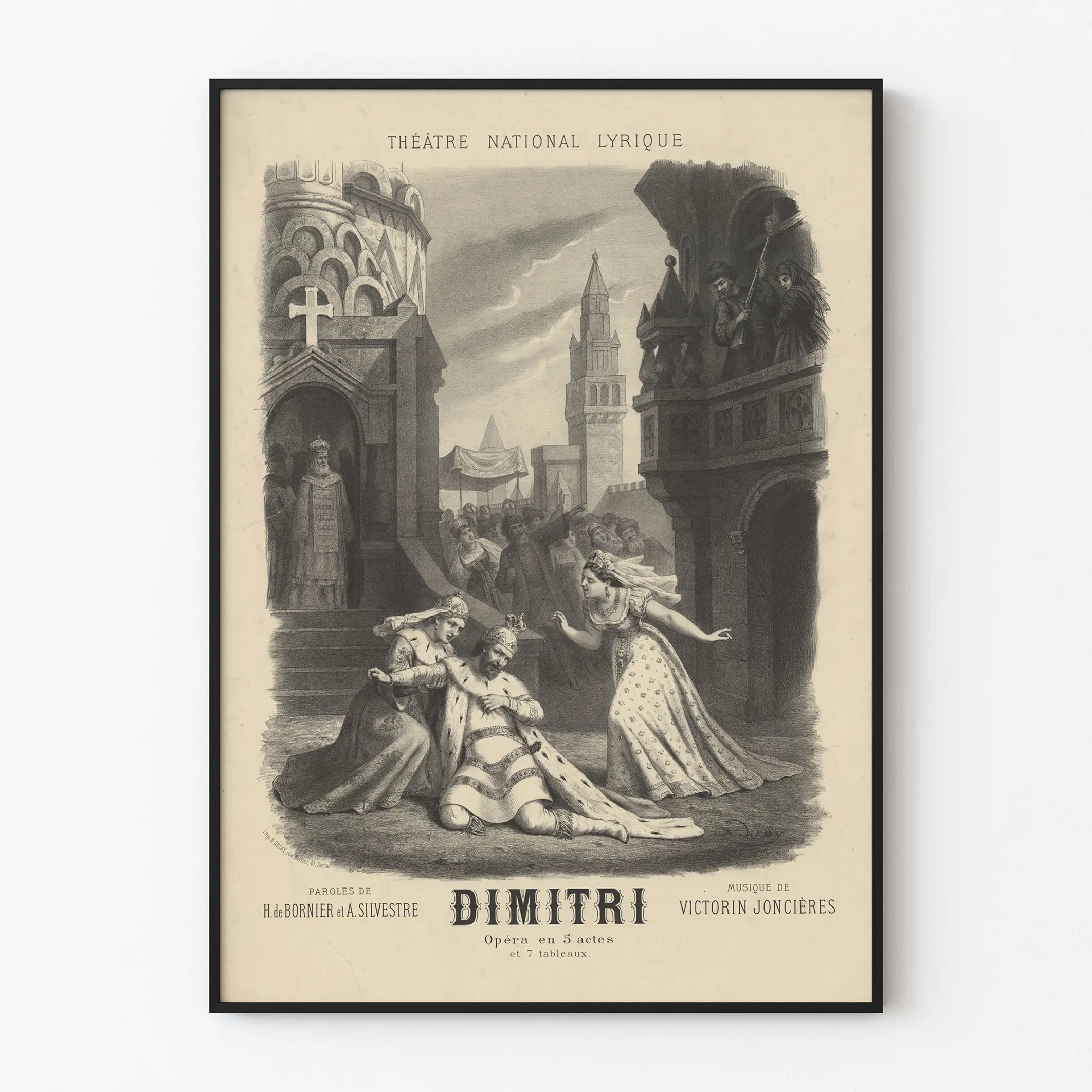 Tutustu tähän vanhaan julisteeseen, joka esittää kohtauksen oopperasta "Dimitri", lyyrinen mestariteos viidessä näytöksessä ja seitsemässä kuvassa, Kansallisoopperan teatterissä. Tämä seinäkoriste on täydellinen lyyrisen taiteen ja teatterihistorian ystäville. Juliste kuvaa dramaattista hetkeä, jossa keskellä on heikentynyt kuningas tai aatelinen hahmo, ympärillään aikakauden asuihin pukeutuneita naisia, ja taustalla on hahmoja, jotka lisäävät kuvituksen narratiivista syvyyttä. Huomataan mustavalkoisen piirtämisen hienostuneisuus, yksityiskohtaiset puvut ja keskiaikainen arkkitehtuuri, joka kehystää kohtauksen. Tämä vintage-juliste herättää esiin perinteisen teatteri- ja oopperatunnelman sekä menneiden lyyristen tuotantojen suuruuden. Niille, jotka haluavat rikastuttaa sisustustaan kulttuurillisella ja historiallisella vivahteella, tämä juliste on ainutlaatuinen kappale, joka koristaa seinäsi tyylikkäällä ja tunteita herättävällä ilmapiirillä. Täydellinen seinäkoriste olohuoneeseen, toimistoon tai taiteeseen omistettuun huoneeseen; tämä painettu taulu tuo klassisen ja taiteellisen sävyn, joka viehättää teatterin ja musiikin harrastajia. Harmaan sävyjen käyttö antaa tälle julisteelle hillityn ja hienostuneen estetiikan, joka sopii helposti erilaisiin sisustustyyleihin, klassisesta nykyaikaiseen. Tämä seinätaulu on erinomainen valinta korostamaan tilaasi taidokkaalla koriste-esineellä, jolla on rikas kulttuurinen historia.
