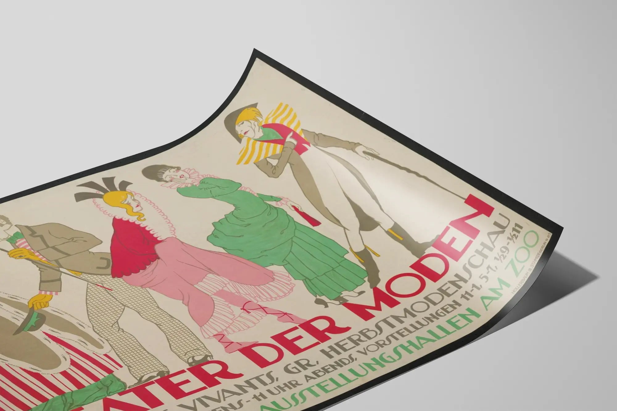 Tämä 1913 vuoden vintage juliste "Theater der Moden" on ikoninen seinäkoriste, joka yhdistää eleganssin ja teatterin sekä muodin historian. Sen pukuihin pukeutuneet hahmot, joissa on liioitellut ja värikkäät siluetit, tarjoavat ainutlaatuisen taiteellisen vaikutelman, joka viittaa 1900-luvun ensimmäisiin vuosikymmeniin. Juliste kuvaa teatterikohtausta, jossa elävät mannekiinit esittävät syksyn muotitrendejä teatteriesityksen muodossa. Graafinen suunnittelu erottuu sulavilla linjoilla, kirkkailta ja kontrastisilta väreiltä sekä aikakauden typografisella tyylillä, joka korostaa tämän teoksen aitoutta. Tämä juliste tuo ripauksen retro-tyyliä mihin tahansa sisustukseen, olipa kyseessä olohuone, toimisto tai odotustila. Teatteriin ja muotiin liittyvien visuaalisten elementtien käyttö tekee siitä myös ihanteellisen valinnan kulttuurin harrastajille tai alan ammattilaisille, jotka haluavat yhdistää estetiikan ja historian. Tämä seinäkoriste on täydellinen lisäys neutraalille seinälle, tuoden tilaan dynaamisuutta ja historiallista charmia. Sen runsaat mitat vangitsevat heti katseen ja kertovat samalla rikkaan visuaalisen tarinan. Julisteena se soveltuu hyvin kehystettynä korostamaan yksityiskohtia ja erottuvia värejä. Tämä vintage juliste Theatre der Moden on erinomainen valinta niille, jotka etsivät alkuperäistä, historian ja hienostuneisuuden täyttämää seinäkoristetta, joka viittaa esittävän taiteen ja muodin aikaan, joka on jo mennyt.