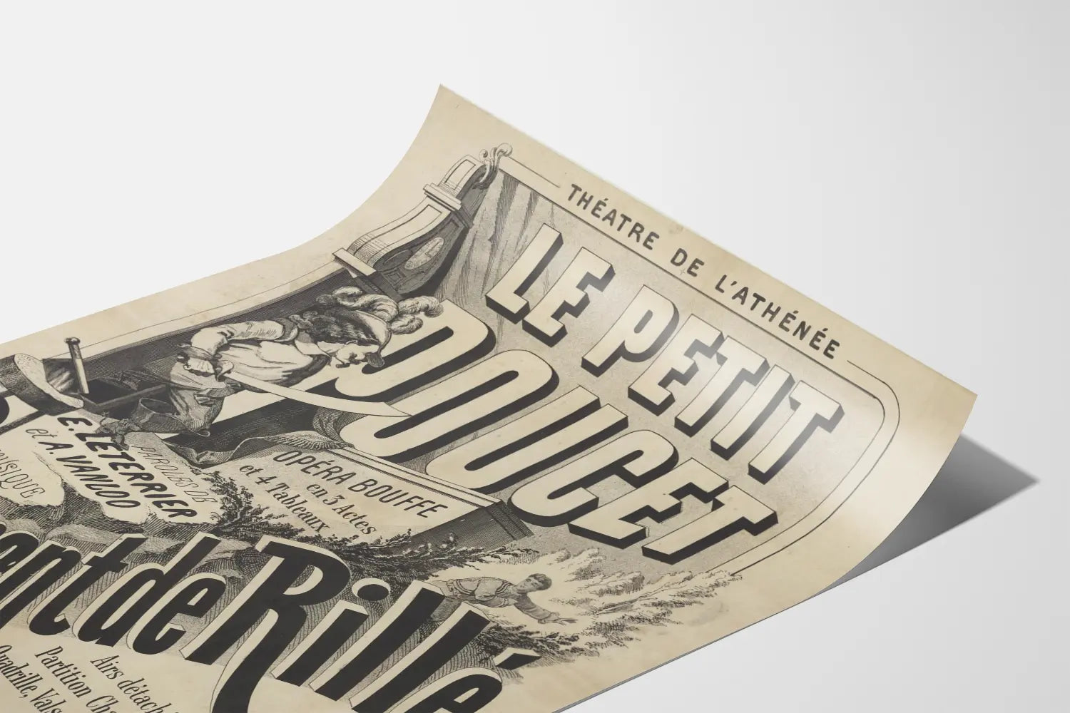 Löydä tämä vanha juliste, joka on peräisin Athénée-teatterilta ja kuvaa « Pieni Pukki » -operetin, kolmiosainen ja nelinäytöksinen satiirinen ooppera. Tämä mustavalkoinen seinäkoristelu esittää tyypillistä klassisten teatterijulisteiden graafista tyyliä, jossa on suuria typografisia kirjaimia ja yksityiskohtaisia kuvituksia. Sävellys esittää kahta hahmoa: toinen on muskettisoturin puvussa miekan kanssa, ja toinen näyttää pakenemaan tai piiloutuvan lehtien taakse, luoden tunnelman, joka muistuttaa kansantarinoita.