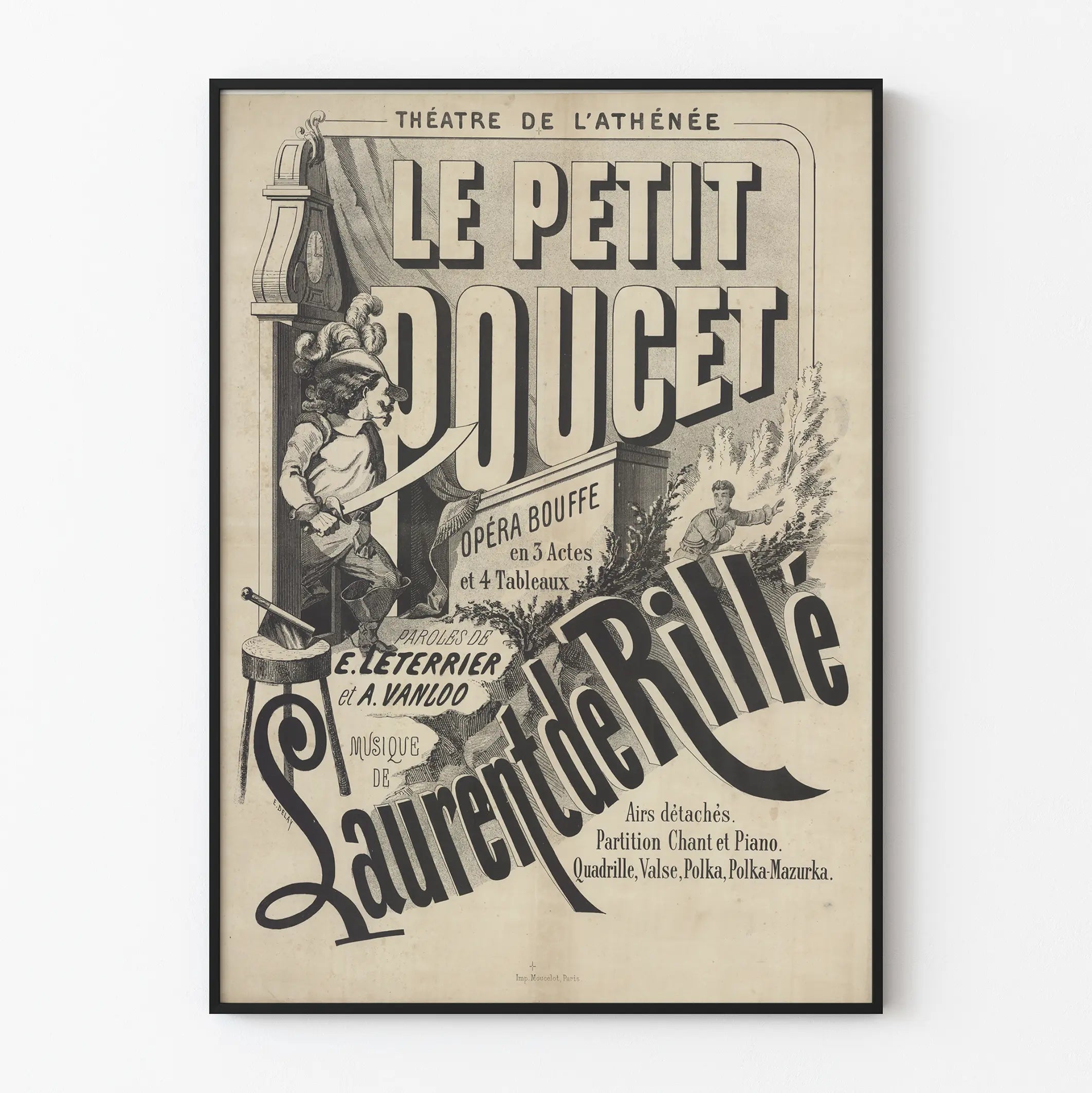 Tämä graafinen teos on painettu Moucelotin painotalossa Pariisissa, mikä näkyy julisteen alareunassa ja lisää autenttisuuden tuntua tähän vintage-seinäkoristeluun. Se sopii täydellisesti klassisen seinäkoristeen ystäville, teatterin ja musiikin harrastajille sekä vanhojen julisteiden keräilijöille.