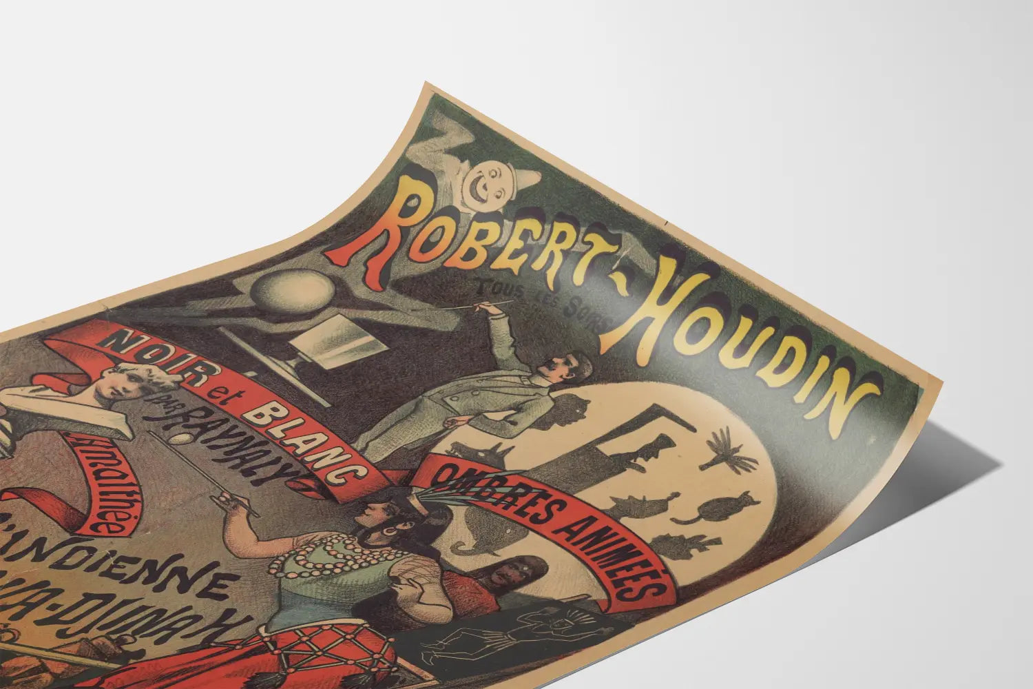 Tutustu tähän poikkeuksellisen vanhanaikaiseen julisteeseen, joka esittää Pariisin Robert-Houdin-teatteria ja esittää Raynalyn toteuttamaa liikkuvien varjokuvien näytelmää. Tämä graafinen teos, joka on tyypillinen vintage-teatterimainos, yhdistää mustavalkoisen tyylin lämpimiin väreihin luoden vangitsevan visuaalisen vaikutelman. Juliste kuvaa useita ikonisia esityksen elementtejä, kuten tyylikkäästi pukeutuneen taikurin, pyöreän näytön varjokuvia ja värikkäässä puvussa olevaa naisfiguuria, dynaamisesti sommiteltuna punaisiin nauhoihin, jotka sisältävät tekstin. Juliste mainitsee erityisesti "L intiaani Hawa-Djinah" -esityksen, jonka esittää Amalthée Florini, viitaten kiinalaisvarjoteatterin ja taikuuden varhaisiin 1900-luvun esityksiin. Tämä seinäkoristeen juliste on täydellinen vintage-klassikko teatterin, graafisen taiteen ja alkuperäisen seinäkoristeen ystäville. Aikakauden viehätys ja retro-tyyli mustavalkoisena, korostettuna väreillä, tuovat autenttisuuden ja eleganssin tuntua mihin tahansa sisustukseen. Täydellinen teemanmukaiseksi seinäkoristeeksi esityksistä, lavataiteista tai vintage-tyylistä, tämä taulu tarjoaa ainutlaatuisen estetiikan, joka viehättää graafisilla yksityiskohdillaan ja salaperäisellä tunnelmallaan. Anna seinillesi kutsu kiehtovaan varjoteatterin ja taikuuden maailmaan tämän harvinaisen ja persoonallisen julisteen avulla.