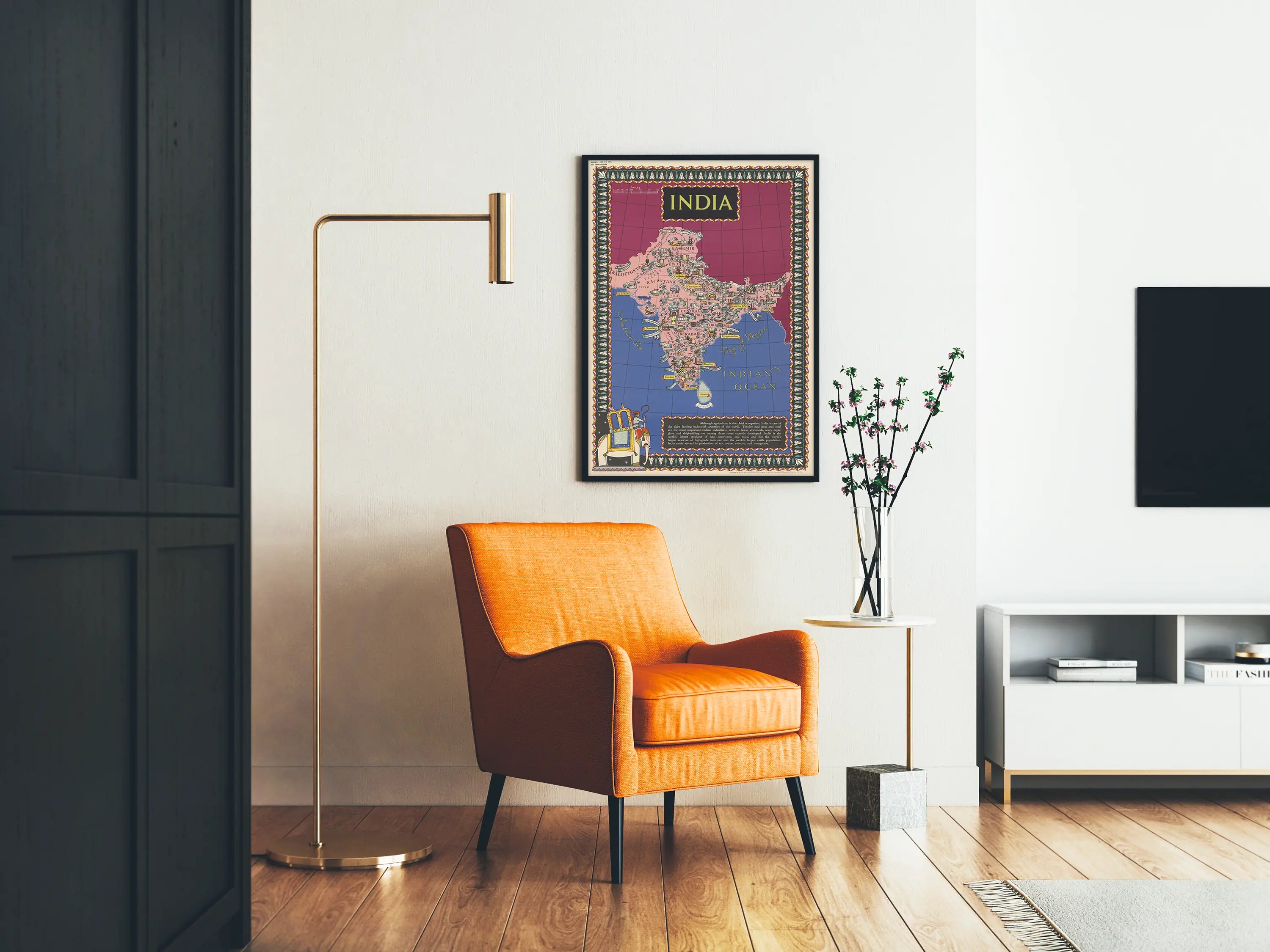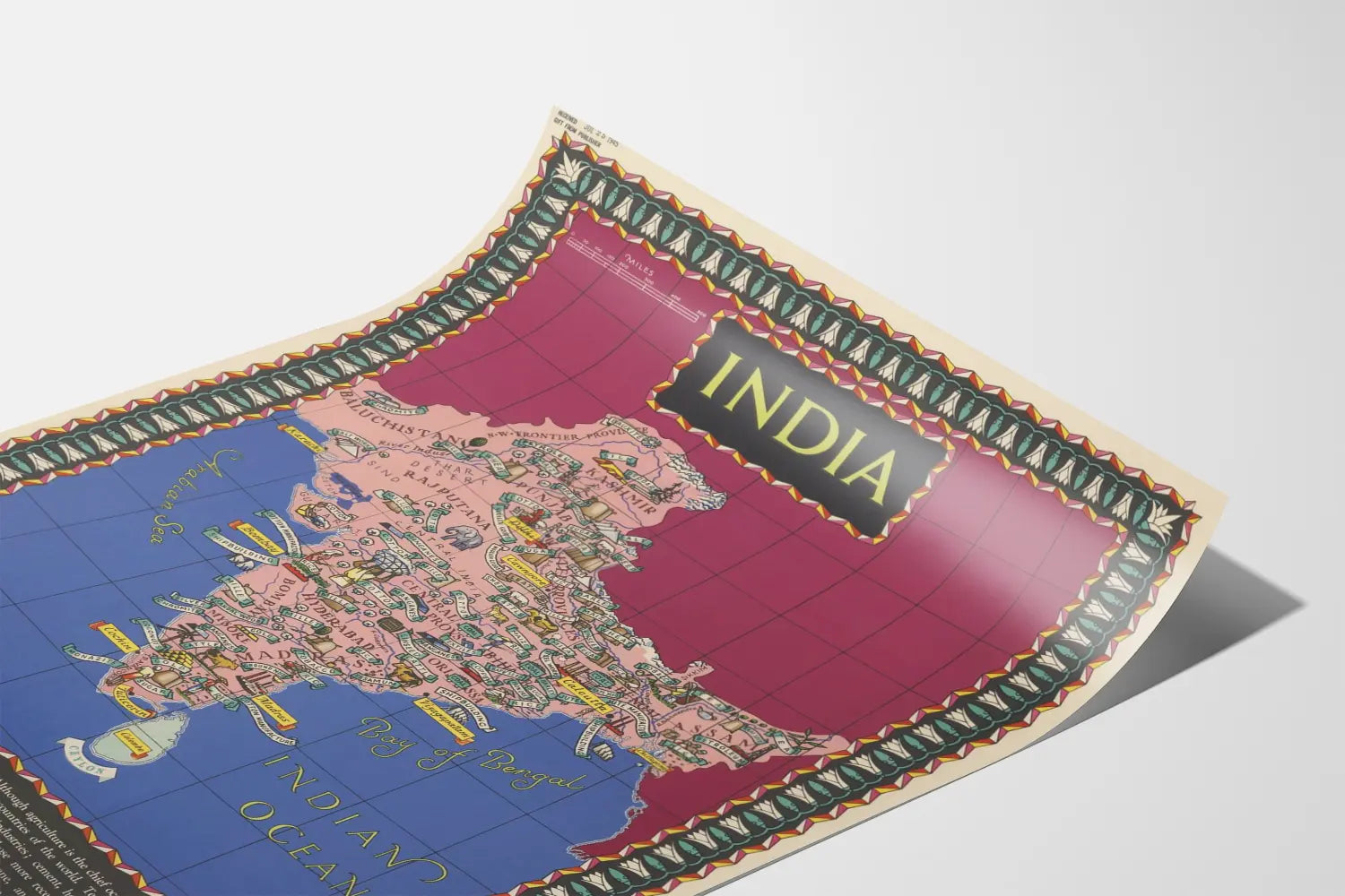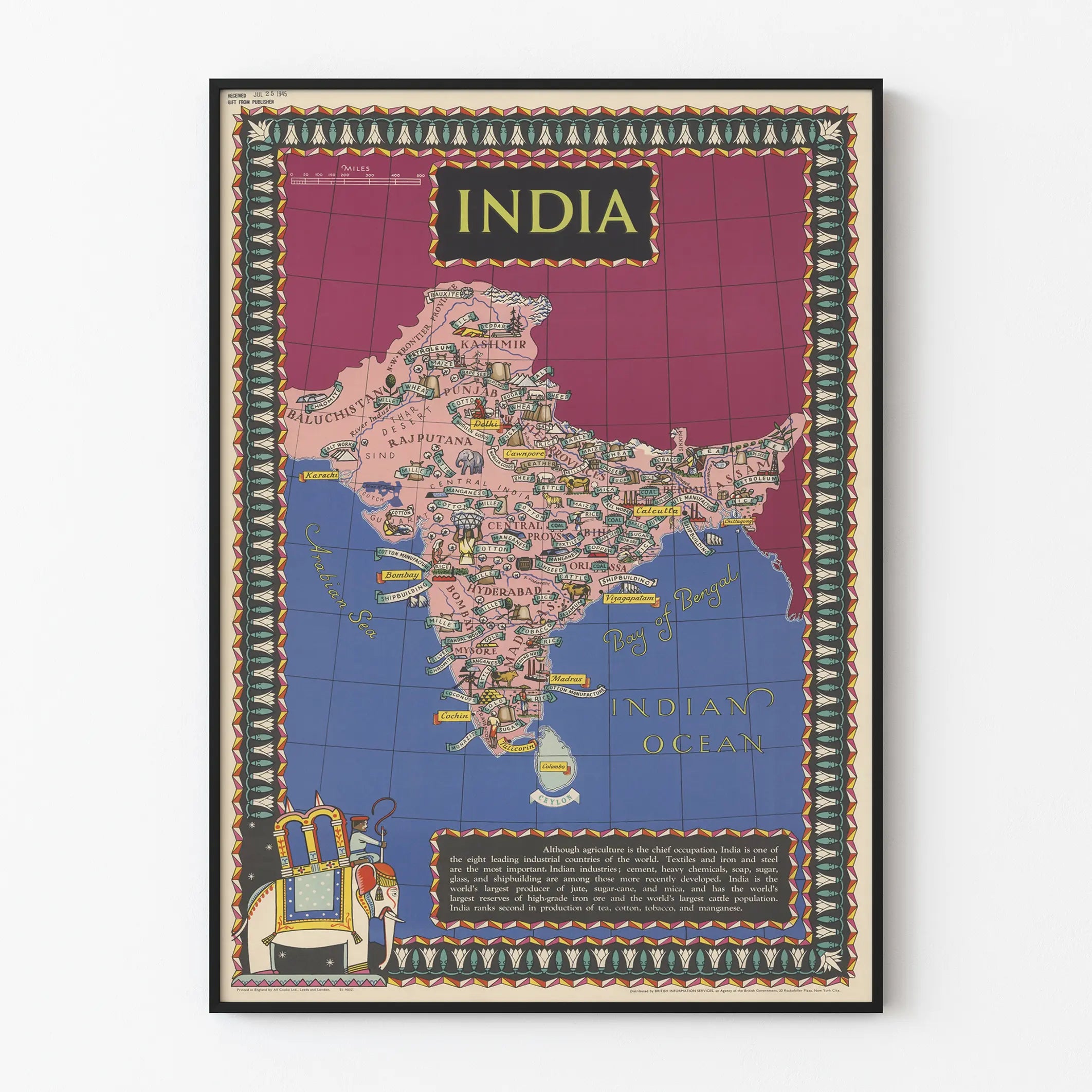 Tämä julisteformaatti on erinomainen valinta seinäkoristeeksi, kun halutaan lisätä vaikuttava teos, joka herättää uteliaisuutta ja kutsuu matkalle. Alareunan selittävä teksti täydentää visuaalista sisältöä, korostaen Intian maatalous- ja teollisuusmerkitystä, kuten jute-, sokeriruoko-, mica-, rauta- ja naudanlihan tuotantoa. Tämä seinäkoriste on ihanteellinen rikastuttamaan sisustusta historiallisella ja opetuksellisella kartalla, tuoden samalla ripauksen eleganssia ja omaleimaisuutta.