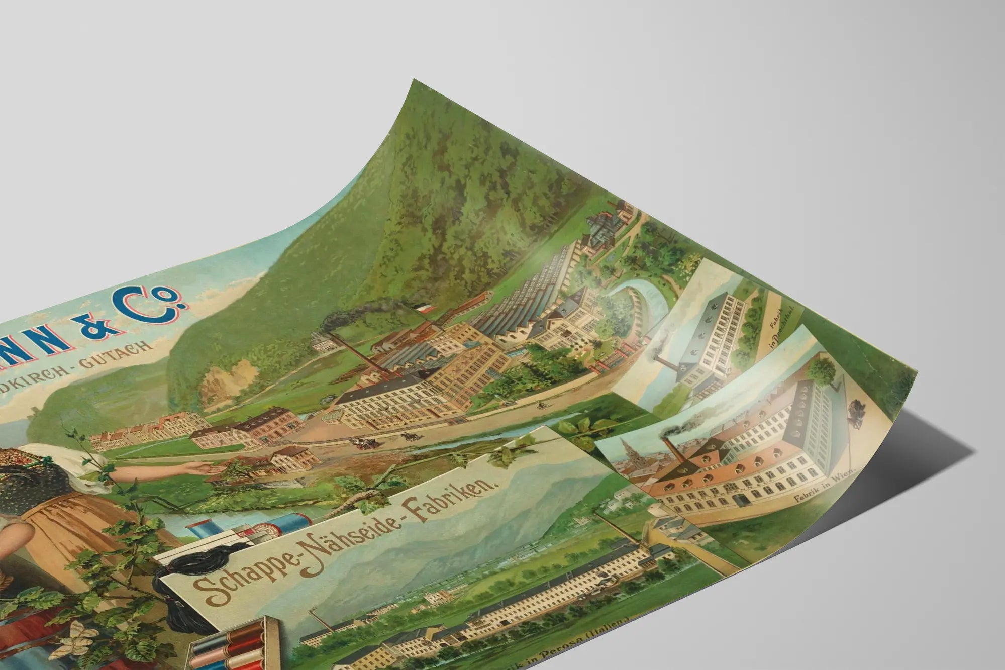 Tämä vintage- juliste esittää Gütermann & Co:n tehtaan, joka on kuuluisa ompelukuitujen valmistaja, sijaitsee Waldkirchissä ja Gutachissa Baijerissa. Kompositio kuvaa useita tehtaita vuoristomaisemassa, sisältäen tyypillisiä teollisuusrakennuksia 1800-luvun lopulta tai 1900-luvun alulta. Kaksi perinteisiin pukuisiin naista etualalla lisää ihmiskohtauksen tähän tekstiiliteollisuuden kohtaukseen. Juliste korostaa myös yrityksen lippulaivatuotteita, kuten värikkäitä kääreitä ja mustaa lankaa, korostaen historiallista osaamista ompelukuitujen ja silkki-tuotteiden alalla. Mainitaan useita valmistuksia, muun muassa Perosan kaupungissa Italiassa, Prechthalissa ja Wienissä, mikä vahvistaa laajaa teollista läsnäoloa Euroopassa. Aitona seinäkoristeena tämä teollisuusjuliste tuo ainutlaatuista retro- charmia mihin tahansa sisustukseen. Se sopii niin teollisen historian harrastajille kuin vintage-seinäkoristeiden ystäville, tarjoten nostalgisen ja elegantin tunnelman. Tämä juliste on täydellinen sisustukseen olohuoneeseen, toimistoon tai käsityö- tai tekstiililiikkeeseen. Lämpimissä väreissä painettu taulu korostaa taitavaa yhdistelmää luonnosta, alueellisesta perinteestä ja teollisuudesta, luoden esteettisen ja historiaa täynnä olevan koriste-elementin. Tämä seinäkoriste on kunnianosoitus teolliselle aikakaudelle ja eurooppalaiselle tekstiiliperinnölle, ihanteellinen niille, jotka arvostavat vintage-seinäjulisteita historiallisilla ja teollisilla kuvioilla.