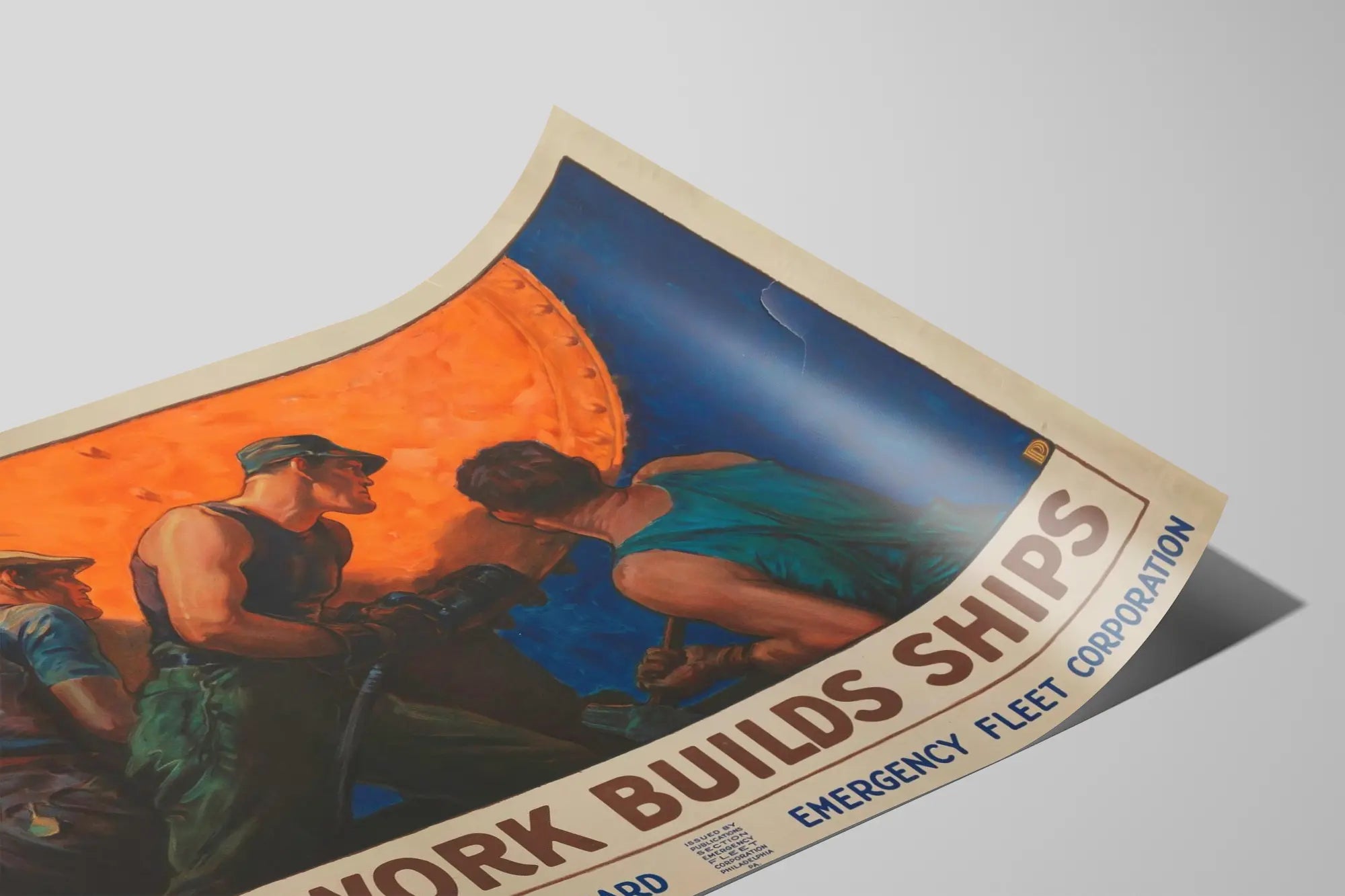 Tämä vintage-plakaatti ilmentää tiimityön voimaa ja yhteenkuuluvuuden tunnetta kuvaten laivanrakennustyömaalla työskenteleviä ammattilaisia. Kuva korostaa kolmea keskittynyttä työntekijää, jotka pukeutuneina perinteisiin työvaatteisiin työskentelevät suuren metallirakenteen ympärillä, jota valaisee lämmin oranssi valo. Tämä sommittelu heijastaa täydellisesti yhteistyön henkeä ja vaadittavaa tarkkuutta merenkulkualalla, mikä symbolisoituu tässä laivan rakentamisessa. Voimakkaiden lämpimän ja kylmän sävyjen kontrastilla tämä vintage-plakaatti tuo autenttisen ja dynaamisen estetiikan sisätilojen tai työtilojen seinäkoristukseen. Se on ihanteellinen korostamaan toimistoa, kokoushuonetta tai työpajaa, ja se herättää motivaatiota ja kollektiivista voimaa. Tekstit ”TEAMWORK BUILDS SHIPS” sekä viralliset merkinnät kuvan alareunassa lisäävät teokseen retro- ja historiallista vivahdetta, korostaen yhteisön merkitystä teollisissa ympäristöissä. Tämä vintage-plakaatti on täydellinen valinta aitouden ja designin ystäville, merenkulun harrastajille tai niille, jotka haluavat tuoda seinäkoristukseensa vahvan ja inspiroivan viestin. Sen graafinen laatu ja taiteellinen tyyli tekevät tästä julisteesta motivoivan ja esteettisen sisustuselementin, joka on helppo sovittaa erilaisiin sisustustyyleihin, teollisesta nykyaikaiseen.