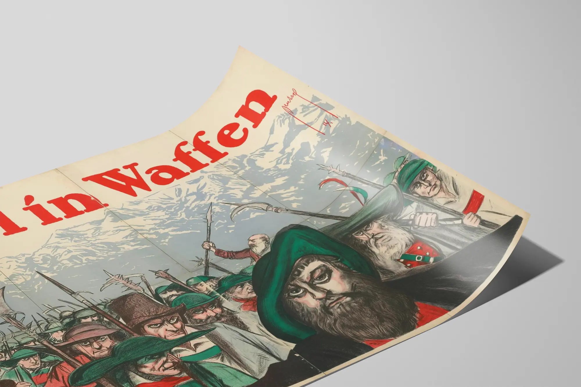 Käytetyt värit suosivat hillittyjä ja luonnollisia sävyjä, pääasiassa tummanvihreitä ja punaisia, jotka kontrastoivat tyyliteltyyn harmaaseen ja valkoiseen vuoristotaustaan. Tämä taustalla oleva vuori viittaa Tirolin alueeseen, korostaen sen maantieteellistä ja historiallista kontekstia tässä graafisessa esityksessä. Julisteen yläosassa oleva kirkkaanpunainen teksti "Tirol in Waffen" lisää eloa ja dynaamisuutta, vahvistaen visuaalista vaikutusta ja viestin välittymistä seinäkoristeen kautta.