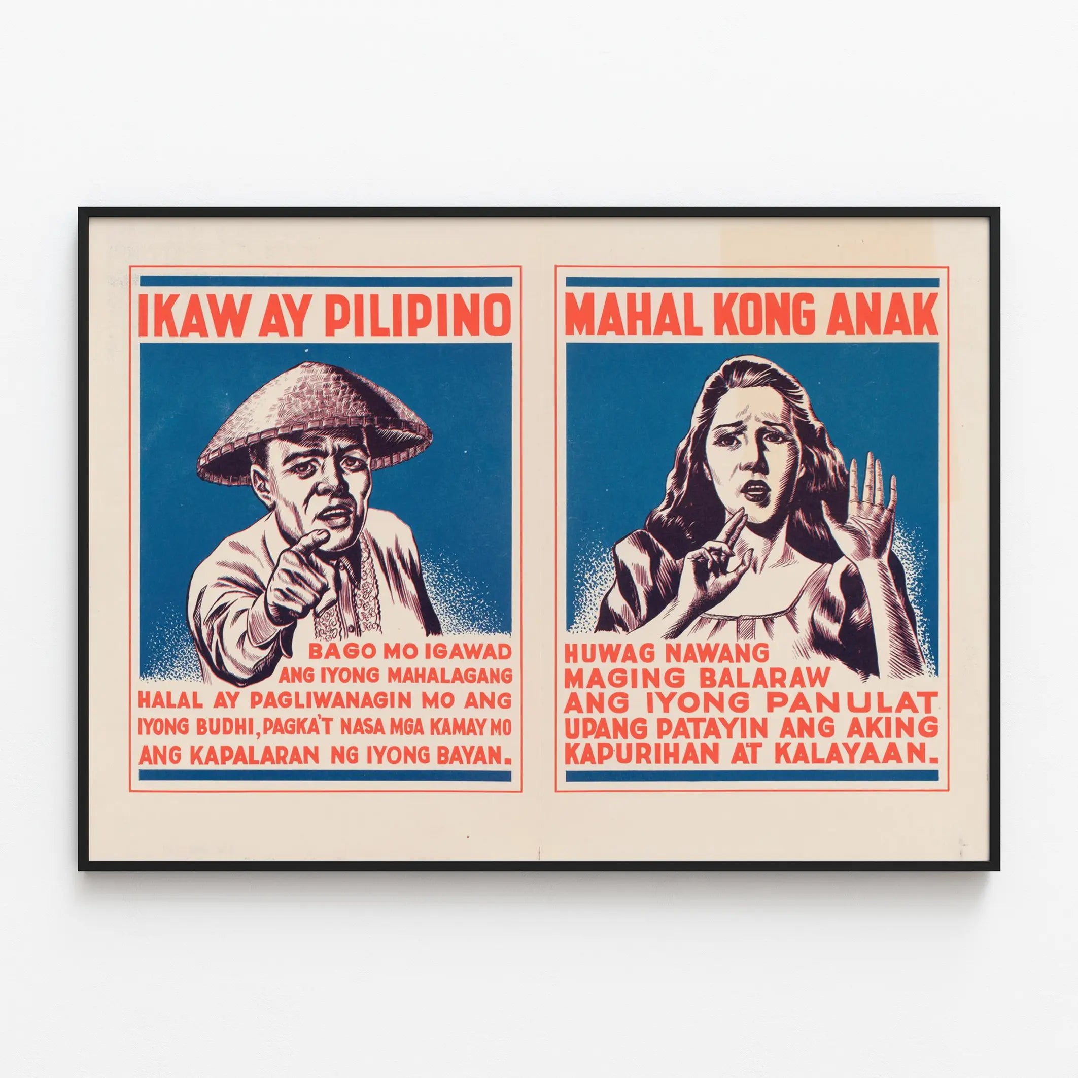 Tämä vanha filippiiniläinen juliste, jaettu kahteen erilliseen osaan, on vaikuttava teos täynnä merkitystä ja historiaa seinäkoristeena. Vasemmalla mies, pukeutuneena perinteiseen hattuun, osoittaa sormellaan katsojaa, ja siihen liittyy filippiininkielinen teksti, joka käsittelee henkilökohtaista vastuuta ja tietoisuuden merkitystä kansakunnan kohtalossa. Oikealla nainen ilmaisee voimakasta tunnetta, jota korostaa viesti, varoittaen petoksesta ja korostaen kunnian ja vapauden arvoa. Värit sininen, punainen ja valkoinen sekä hyvin tyypillinen graafinen tyyli antavat tälle julisteelle aitouden, joka viehättää kansantaiteen ja sitoutuneiden teosten ystäviä. Tämä seinäkoriste kiinnittää huomion voimakkaalla ja universaalilla viestillään, mutta myös retro-tyylillään, joka muistuttaa 1900-luvun puolivälin propagandajulisteita tai kansalaiskasvatuksen julisteita. Julisteen koko on julisteformaatti, ja se sopii täydellisesti sisätiloihin, joissa halutaan yhdistää historiaa, kulttuuria ja muotoilua. Olipa kyse olohuoneesta, toimistosta tai paikasta, joka on omistettu historian muistelulle, tämä juliste luo dynaamisen ja pohdiskelevan ilmapiirin. Ihanteellinen vanhojen julisteiden, poliittisten viestien tai selkeän ja syvällisen graafisen taiteen ystäville, tämä seinäkoriste tuo ainutlaatuisen lisän seinillesi. Tämän teoksen lisääminen kokoelmaasi on kutsu tuoda osanen filippiiniläistä perintöä, täynnä symboliikkaa, osaksi elinympäristöäsi.