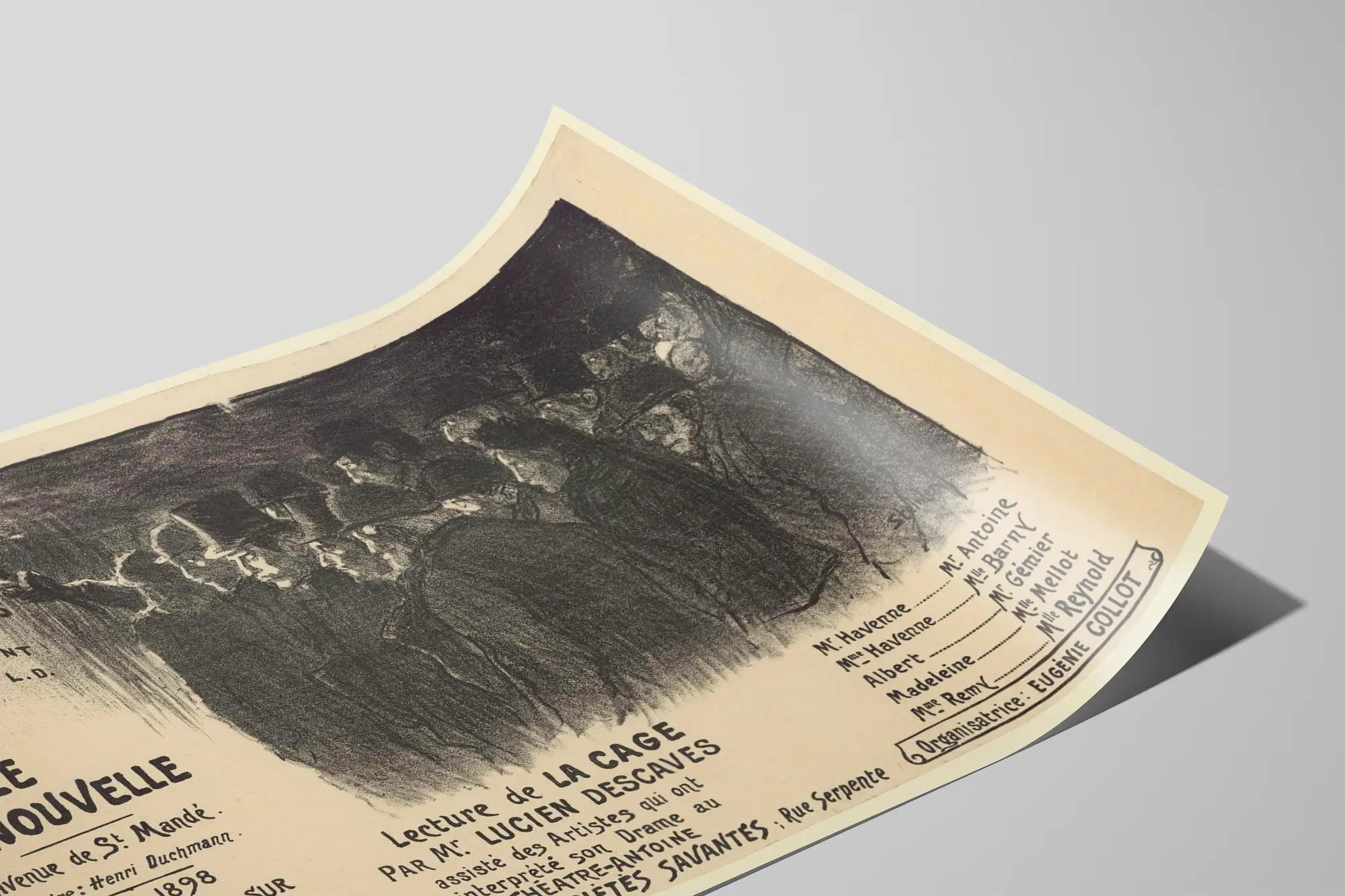 Tämä vintage-juliste viittaa 1800-luvun lopulla pidettyyn Leopold Lacourin luentoon, mikä lisää autenttisen viehätyksen tähän seinäkoristukseen. Käsin kirjoitetut merkinnät ja vanha typografia osaltaan vahvistavat retro-estetiikkaa, joka miellyttää historiallisten taiteen ystäviä ja aikakauden litografioiden harrastajia. Se sopii hyvin yksinkertaiseksi julisteeksi tai kehyksissä lasin alla, ja se soveltuu niin olohuoneeseen, toimistoon kuin lukusaliin tai vanhojen julisteiden keräilytilaan.