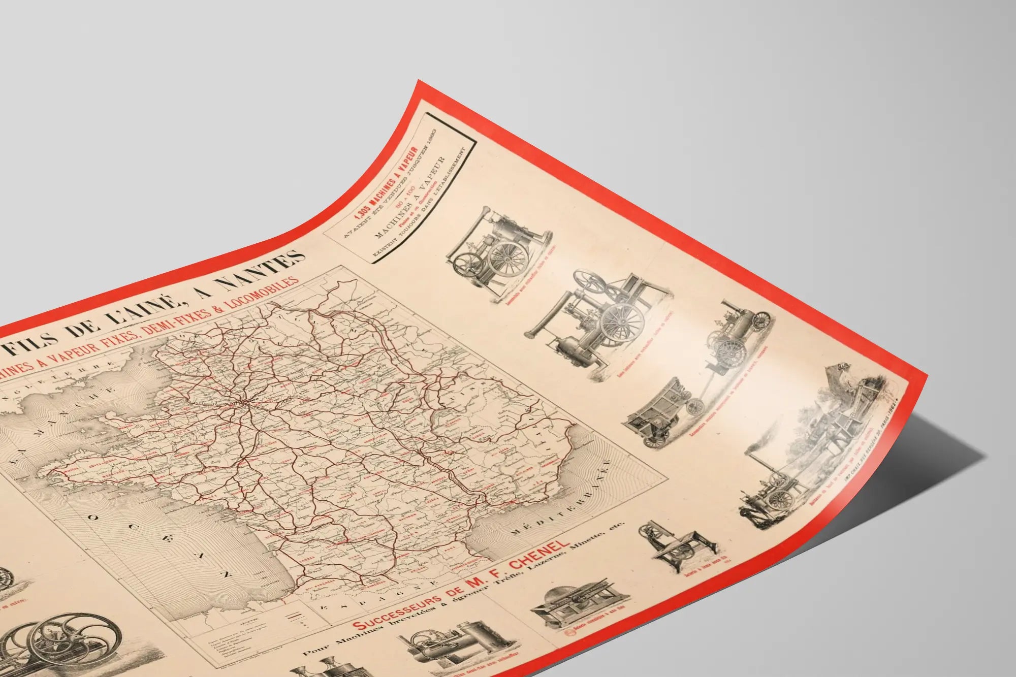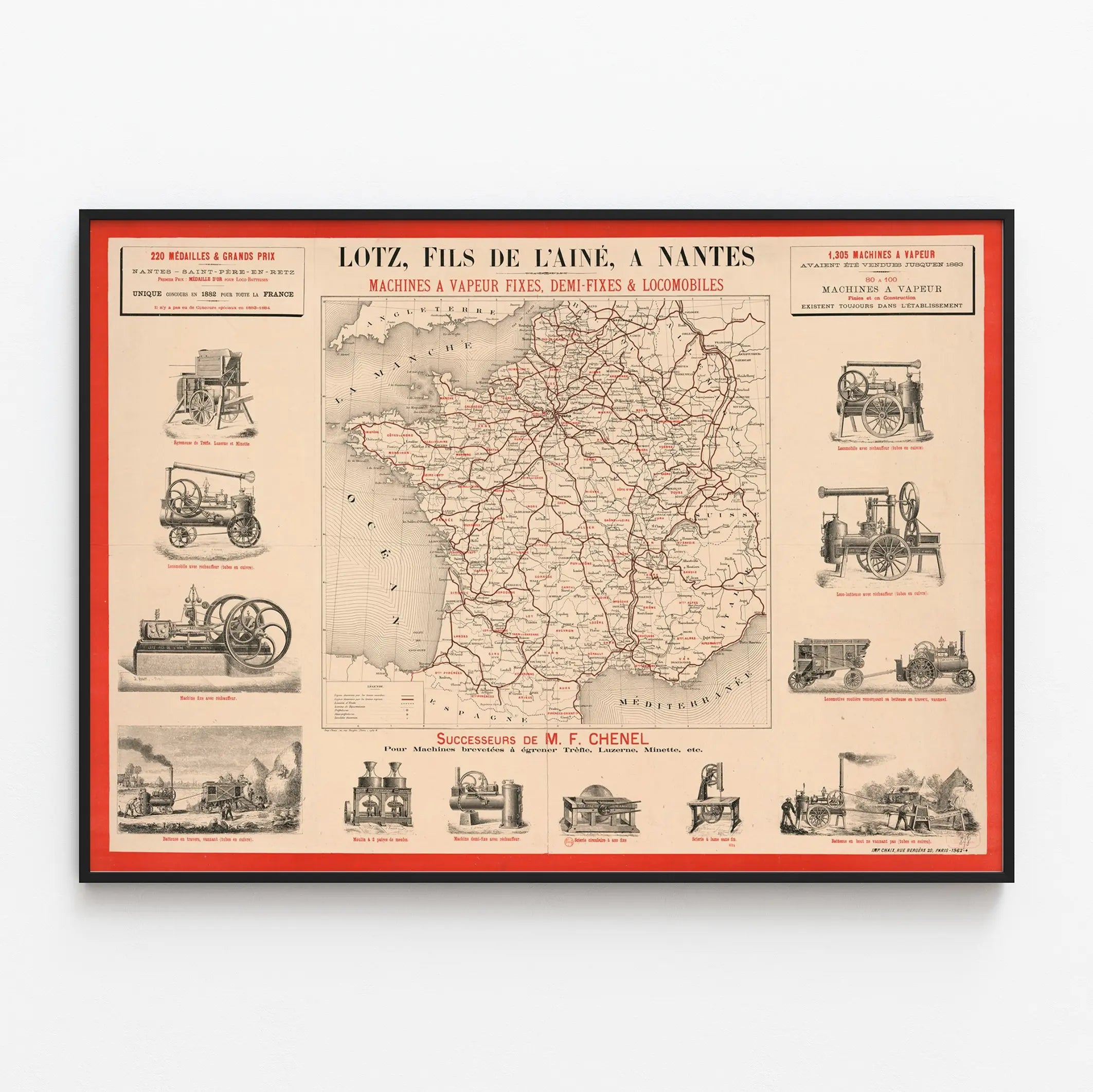 Tämä vintage- juliste esittää kartan Ranskasta, johon on liitetty yksityiskohtaisia kuvia erilaisista höyrykoneista, kiinteistä, puolikiinteistä ja veturimaisista, jotka on valmistanut Lotz, vanhemman poika, Nantesissa sijaitseva yritys. Tämä juliste on täydellinen seinäkoriste industrialistin ja retro-tyylin ystäville. Kartan keskellä korostuvat jakelualueet ja reitit, joilla tämän yrityksen höyrykoneita on myyty, tarjoten mielenkiintoisen maantieteellisen näkymän ja tehden tästä koriste-esineestä sekä opettavaisen että esteettisen.