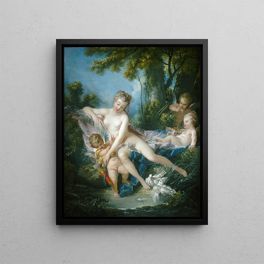 Rokokoon loistavassa universumissa "Le bain de Vénus" François Boucherista erottuu ikonina, jossa sensuellisuus ja kauneus yhdistyvät täydellisessä harmoniassa. Tämä 1700-luvulla maalattu taulu upottaa katsojan nautintojen ja eleganssin maailmaan, jossa rakkauden jumalatar paljastaa koko loistonsa. Hienovaraiset sävyt ja hienostuneet sommitelmat Boucherissa vangitsevat paitsi mytologian ytimen, myös ajan hengen, jolloin taide heijasti elämän mielihaluja. Katsellessamme tätä teosta, meidät viedään välittömästi unelmien puutarhaan, jossa luonto ja jumaluus kietoutuvat sulavasti yhteen.