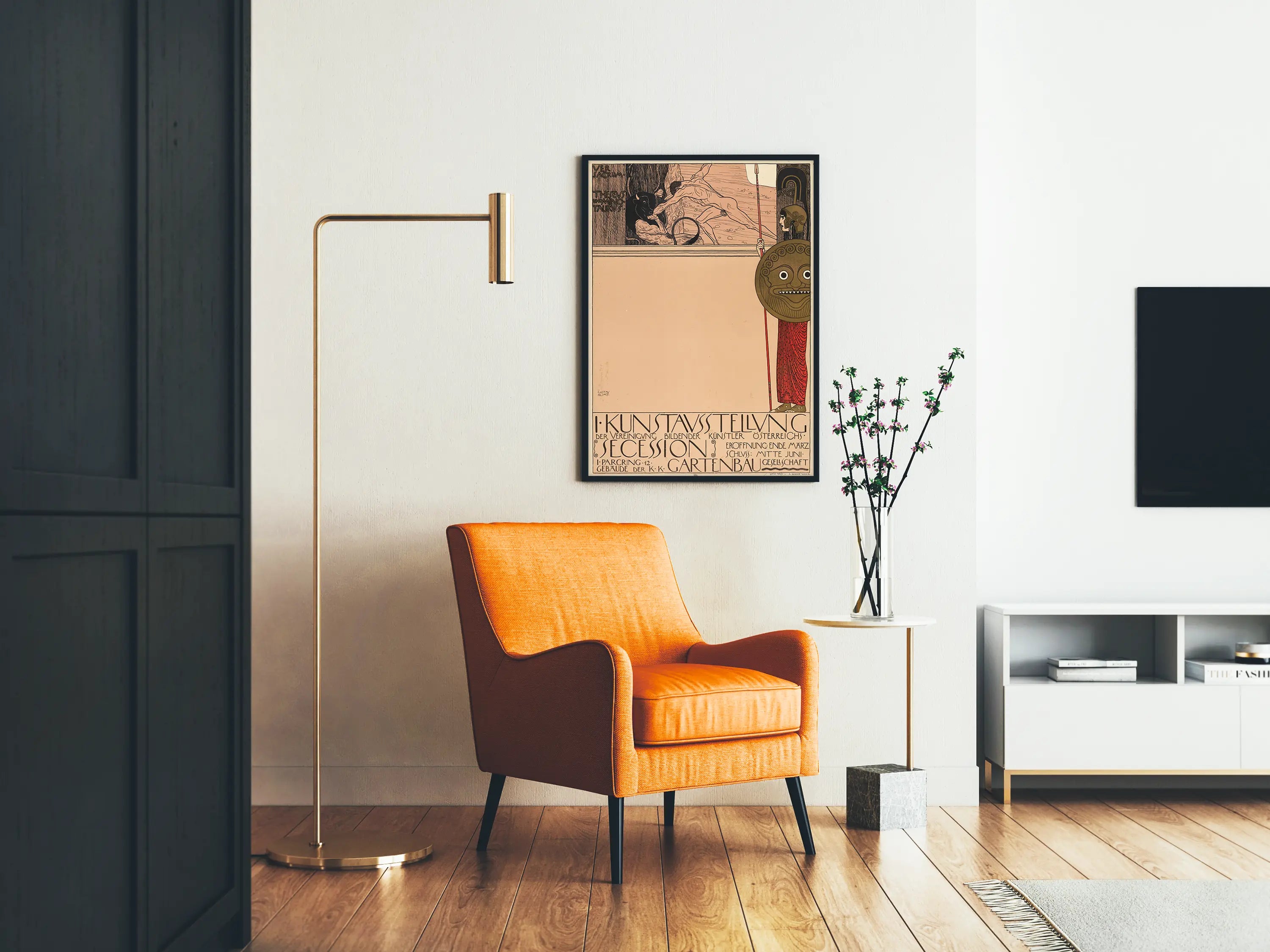 Tämä koristeellinen juliste esittää ikonisen postikuvan, joka on omistettu Wienin Secessionin ensimmäiselle näyttelylle, merkittävälle taiteelliselle liikkeelle 1800-luvun lopulla Itävallassa. Se yhdistää hienostuneen graafisen tyylin ja huolellisesti suunnitellun sommittelun, joka on tyypillistä Art Nouveau -estetiikalle, sekä symbolisen lavastuksen, joka on saanut inspiraationsa kreikkalaisesta mytologiasta. Tämän seinäkoristeen huipulla voi nähdä mytologisen kohtauksen, jossa sankari taistelee Minotauruksen kanssa, kuvastaen voimaa ja rohkeutta. Oikealla puolella seisoo antiikin kreikkalaisessa asussa oleva naisfiguuri, joka vartioi, pitäen keihästä ja kilpeä, jossa on sekä tyylitelty että ilmeikäs kasvokuvio. Graafinen työ korostaa selkeitä linjoja ja hienovaraista kontrastia tummien alueiden ja väripintojen välillä, mikä korostaa tämän alkuperäisen teoksen koristeellista luonnetta. Keskitetty tila, joka on jätetty vapaaksi tekstiltä tai koristeilta, mahdollistaa viestin tai henkilökohtaisen sisällön lisäämisen, tehden tästä postikuvasta ihanteellisen personointiin säilyttäen samalla sen vahvan taiteellisen luonteen. Sen tyylikäs graafinen muotoilu tekee siitä keskeisen osan sisäseinien koristelua, tuoden tilaan historiallisen ja hienostuneen esteettisen vivahteen. Tämä seinätaulu, joka on L-kokoisena, on täydellinen valinta taiteen ja muotoilun ystäville, jotka haluavat tuoda sisätiloihinsa ikonisen teoksen Secession-liikkeestä. Sen yhdistelmä klassista ja modernia tunnelmaa mytologisen ikonografian ja ainutlaatuisen tyylillisen toteutuksen ansiosta mahdollistaa harmonisen sovittamisen erilaisiin sisustustyyleihin, vintage-klassikosta nykyaikaiseen. Graafinen ja typografinen vanha sommittelu vahvistavat sen asemaa sekä historiallisesti rikkaana että hienostuneena seinäkoristeena. Tämä teos on ihanteellinen niille, jotka etsivät ainutlaatuista, hienovaraisesti historiallista seinäkoristetta, joka yhdistää taiteen ja kulttuurin korkealaatuisessa painatuksessa.