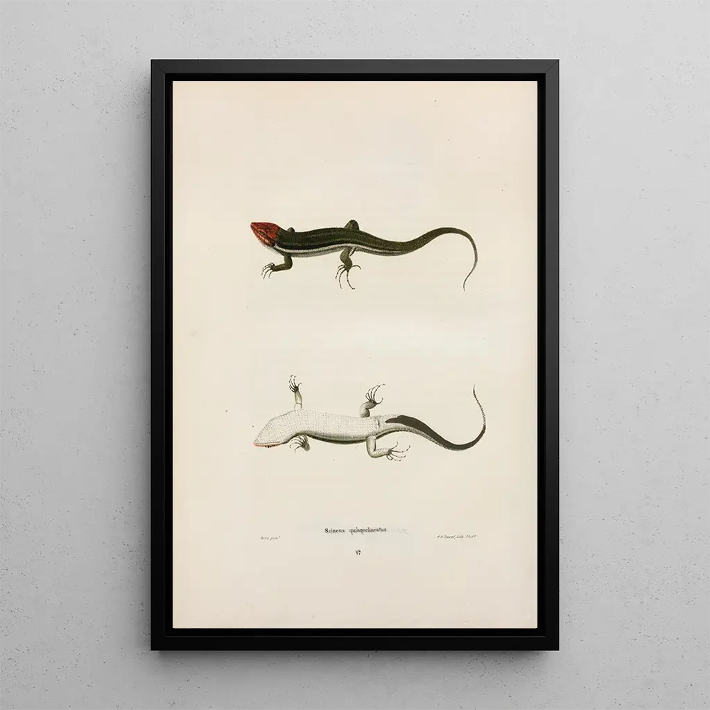 Le taidegrafiikka "Scinque à cinq lignes" John Edwards Holbrookilta vangitsee tämän ainutlaatuisen liskon olemuksen poikkeuksellisen tarkasti. Kompositio korostaa viittä erottuvaa linjaa, jotka kulkevat skinkkikroppaa pitkin, luoden vaikuttavan kontrastin ympäristön maanläheisiin sävyihin. Värit, jotka vaihtelevat beigestä vihreään, on levitetty hienovaraisesti, mikä korostaa anatomian yksityiskohtien hienostuneisuutta. Teoksen tunnelma herättää syvän yhteyden luontoon, kutsuen katsojan arvostamaan usein unohdettuja olentoja.