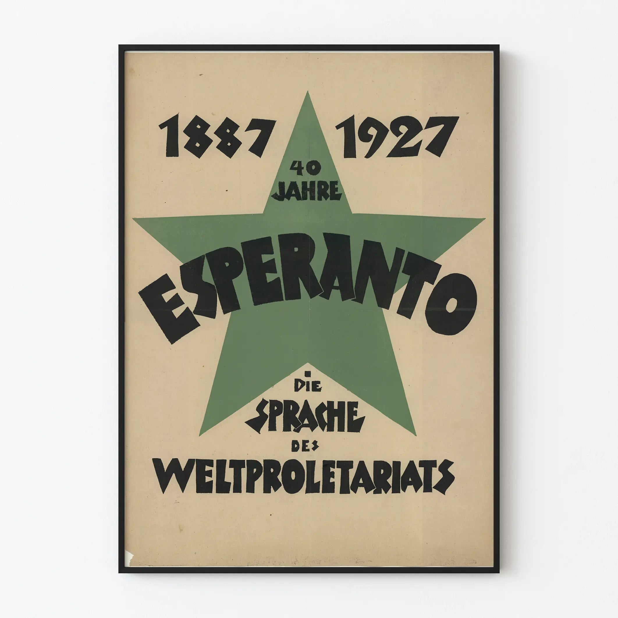 Tämä vintage- juliste juhlistaa esperanton 40-vuotisjuhlaa, maailmanlaajuista kieltä, joka luotiin vuonna 1887. Vaaleanbeigeen taustaan suuri vihreä tähti hallitsee suurta osaa koostumuksesta. Sen keskellä on sana "ESPERANTO" paksuilla mustilla kirjaimilla, graafisesti vahvasti ja kulmikkaasti piirretty, mikä antaa julisteelle sekä modernin että sitoutuneen ilmeen. Tähden huipulla teksti "40 VUOTTA" korostaa neljän vuosikymmenen merkkipaalua. Julisteen yläosassa päivämäärät "1887" ja "1927" kehystävät tähteä, osoittaen tarkasti juhlistettua ajanjaksoa. Pääsanan alla on saksankielinen teksti "DIE SPRACHE DES WELTPROLETARIATS" (maailman proletariaatin kieli), joka vahvistaa esperanton yhteiskunnallista ja poliittista viestiä, usein nähtynä yhtenäistämisen välineenä kansainvälisesti. Tämä minimalistinen juliste käyttää rajoitettua väripalettia, jossa hallitsevat vihreä, musta ja beige, korostaen sen retroa ja aitoutta. Ihanteellinen seinäkoriste kielten, kielihistorian tai historiallisten julisteiden ystäville, tämä juliste on voimakas koriste-elementti, joka herättää huomiota kirjastossa, toimistossa tai opiskeluhuoneessa. Sen graafinen tyyli, yksinkertainen mutta vaikuttava, tekee tästä vintage-julisteesta ajattoman, samalla muistuttaen esperanton kulttuurista ja poliittisesta merkityksestä 1900-luvun alussa. Se on suunnattu niille, jotka arvostavat seinäkoristeita, joissa on voimakas viesti, yhdistäen historiaa, kieltä ja yhteiskunnallista sitoutumista.