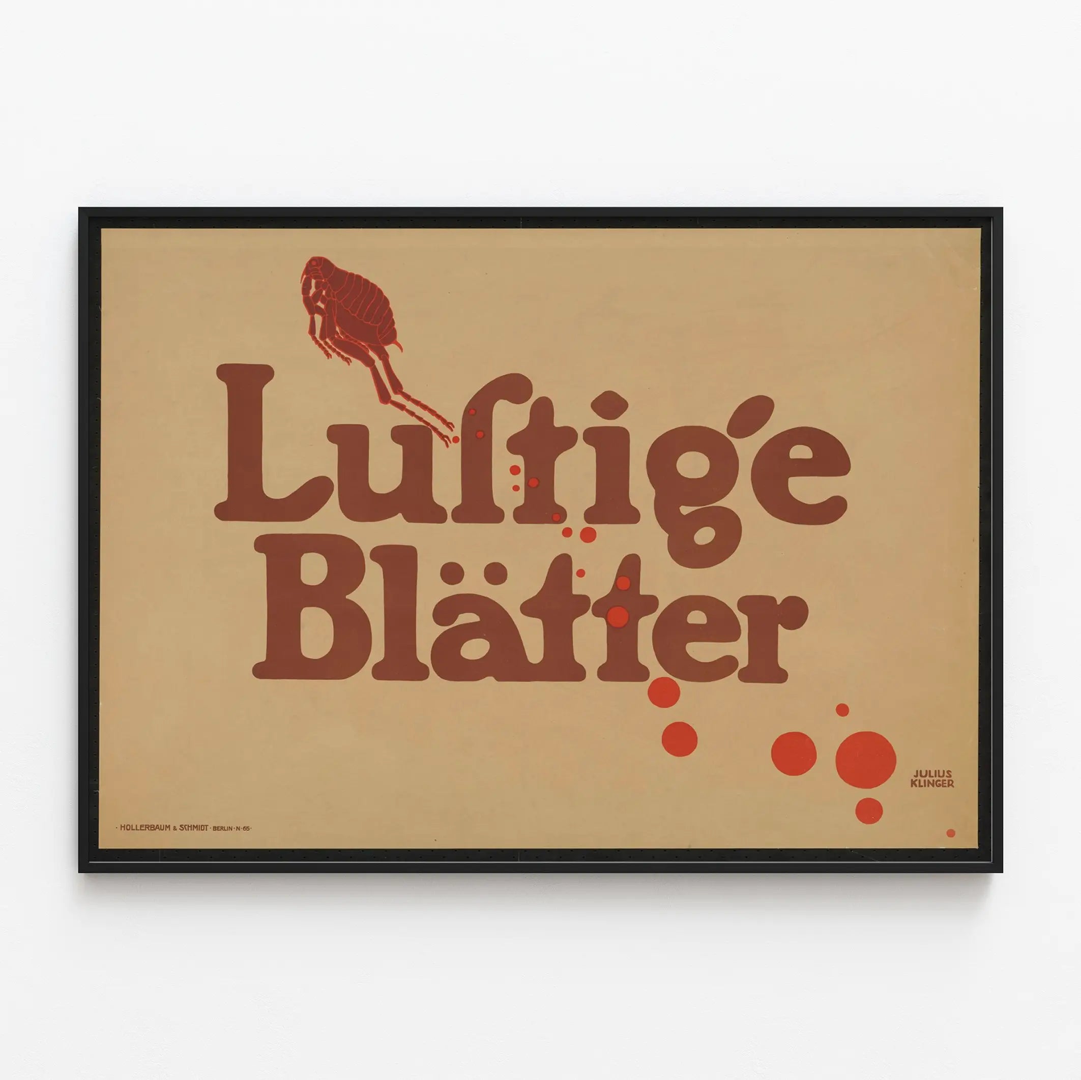 Ota ripaus alkuperäisyyttä ja retro-tyyliä seinäkoristeluusi tämän vintage- julisteen, nimeltä "Lustige Blätter", jonka on suunnitellut taiteilija Julius Klinger. Juliste korostaa minimalistista ja rohkeaa muotoilua, jonka väripaletti on hallitsevasti beigen ja ruskean sävyjä, joita elävöittävät oranssinpunaiset vivahteet tuoden dynaamisuutta ja kontrastia. Graafinen koostumus esittää tyyliteltyä hyönteistä tekstin "Lustige Blätter" yläpuolella, jonka paksut ja pyöreät kirjaimet luovat vahvan ja tasapainoisen visuaalisen läsnäolon. Tämä juliste on ihanteellinen seinäkoriste nykyaikaisessa tai vintage-tyylisessä sisustuksessa, tarjoten taiteellisen kohokohtansa, joka hienovaraisesti viittaa eurooppalaiseen retro-ilmapiiriin. Olitpa graafisen taiteen harrastaja tai etsimässä erottuvaa kappaletta olohuoneeseesi, työhuoneeseesi tai luovaan tilaan, tämä seinäkoriste auttaa luomaan sekä tyylikkään että alkuperäisen tunnelman. Julisteen koko tekee siitä täydellisen kehystettäväksi tai vain ripustettavaksi sellaisenaan, korostaen seinäsi ainutlaatuista visuaalista historiaa.