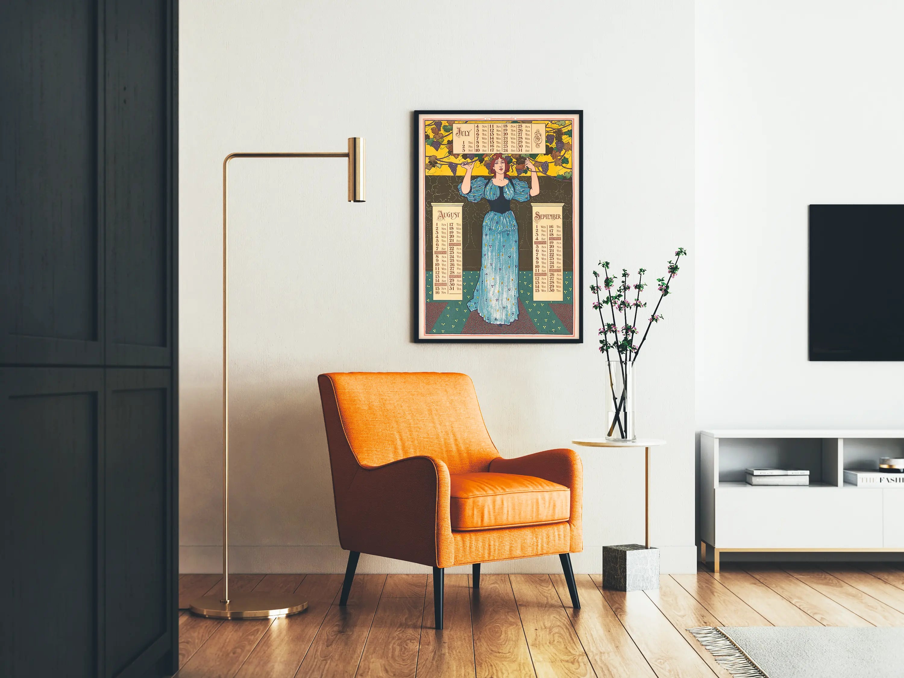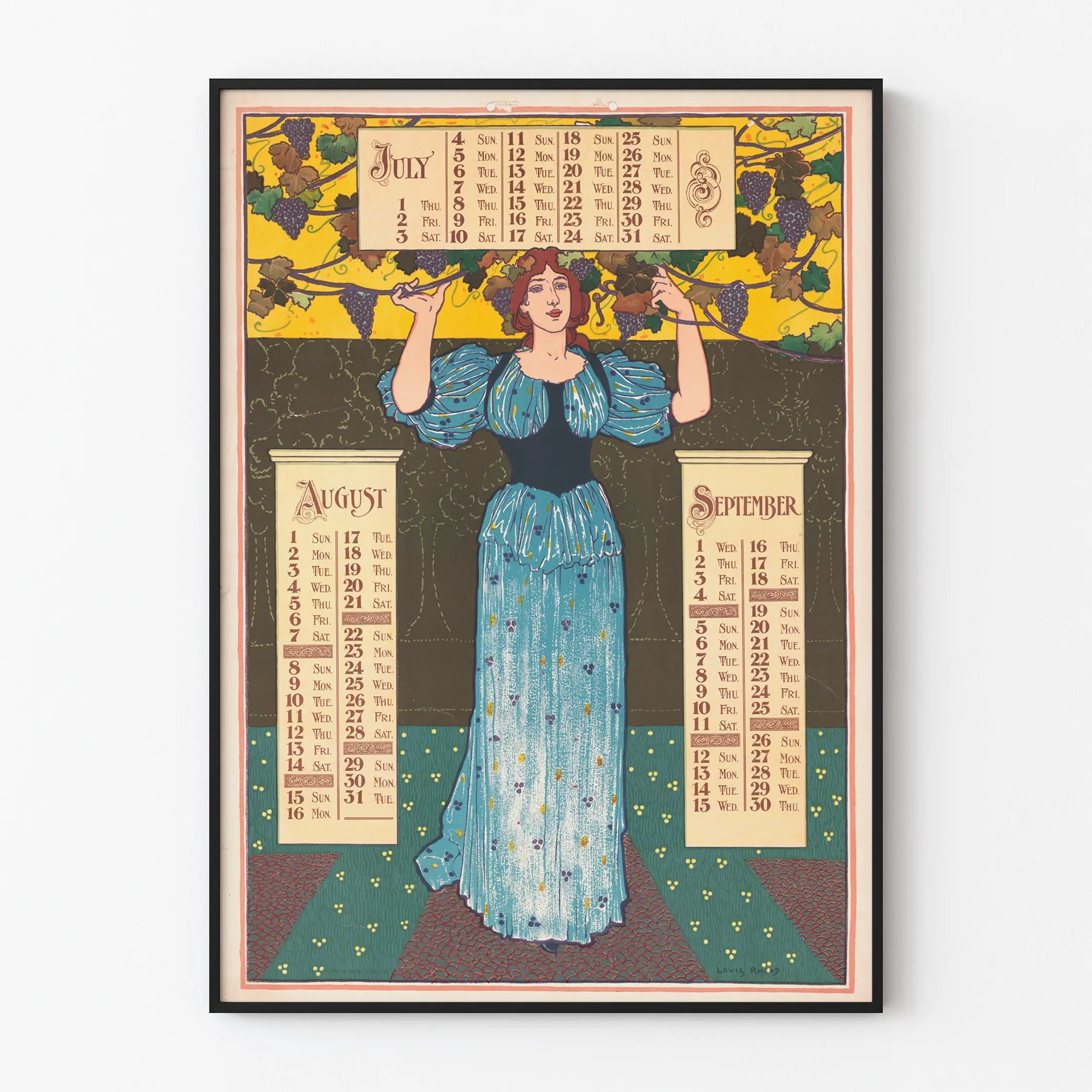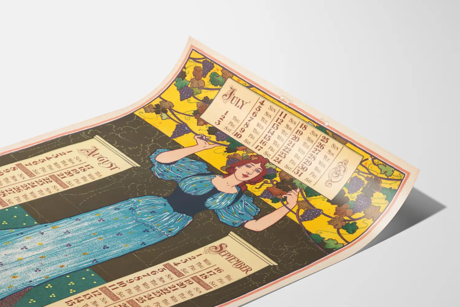 Tutustu tähän vintage- julisteeseen, joka esittää kalenterin heinäkuun, elokuun ja syyskuun kuukausille vuodelta 1897. Tämä seinäkoristejuliste yhdistää kalenterin käytännöllisyyden ja vanhan taideteoksen eleganssin. Keskellä on pitkässä sinisessä mekossa oleva naisfiguuri, jota ympäröivät viinirypäleterhyt, mikä antaa sille tyypillisen 1800-luvun lopun tyylin, maalaisromanttisen ja taiteellisen tunnelman. Kirkkaiden värien, kuten keltaisen, vihreän, sinisen ja violetin, valinta luo lämpimän ja dynaamisen ilmeen tälle seinäjulisteelle. Jokainen kuukausi on järjestetty sarakkeisiin vanhanaikaisella koristeellisella typografialla, mikä lisää aitouden ja retro- viehättävyyden tuntua. Tämä juliste on ihanteellinen rikastuttamaan vintage-henkistä sisustusta, erityisesti keittiössä, olohuoneessa tai toimistossa. Täydellinen aikakauden kalentereiden ja alkuperäisen seinäkoristeen ystäville, se on myös kaunis keräilyesine. Kuvituksen ja kalenterin käytännön toiminnon harmonia tekee tästä julisteesta sekä esteettisen että toiminnallisen koriste-elementin, joka lisää vanhan ajan charmia seinätilaasi. Ripustettuna kehykseen tai vain seinälle asetettuna, tämä painettu taulu vangitsee katseen retro-tyylillään ja huolellisella grafiikallaan. Se sopii täydellisesti klassisen ja nostalgisen sisustustrendin osaksi, muistuttaen vanhojen kaiverrusten ja julisteiden hienostuneisuudesta. Tämä kalenterijuliste on ainutlaatuinen kappale, joka kaunistaa seinäkoristustasi ja samalla kunnioittaa 1800-luvun lopun muotoilua.