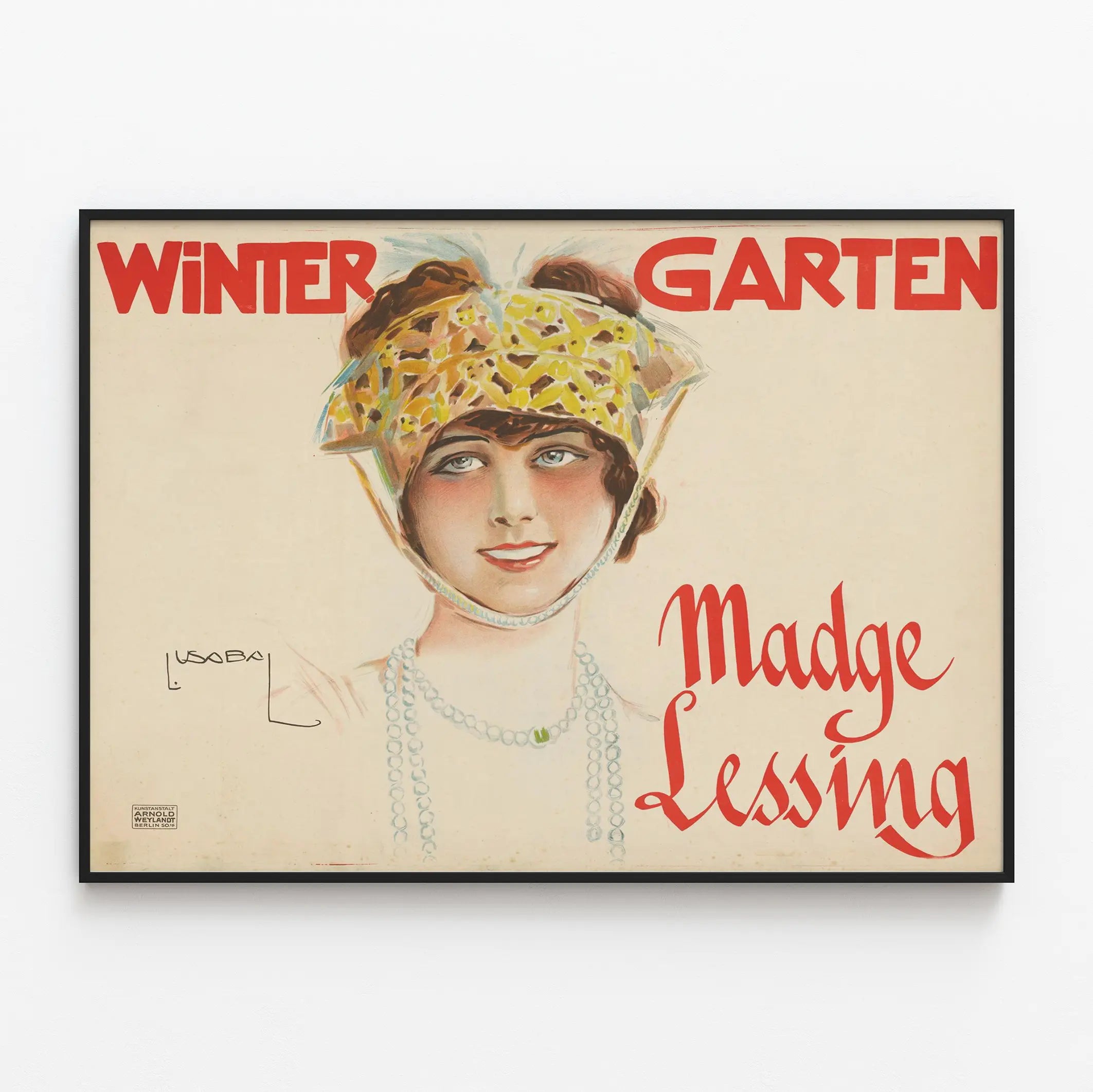 Tummanpunainen teksti "WINTER GARTEN" julisteen yläosassa kiinnittää huomion kohtaukseen, kun taas nimi "Madge Lessing" on kirjoitettu tyylitellyllä kirjaimella oikealla puolella, luoden täydellisen visuaalisen tasapainon kokonaisuuteen. Tämä juliste on painettu vaalean beigen taustalle, mikä luo harmonisen kontrastin graafisten elementtien kanssa ja vahvistaa sen vintage-efektiä.