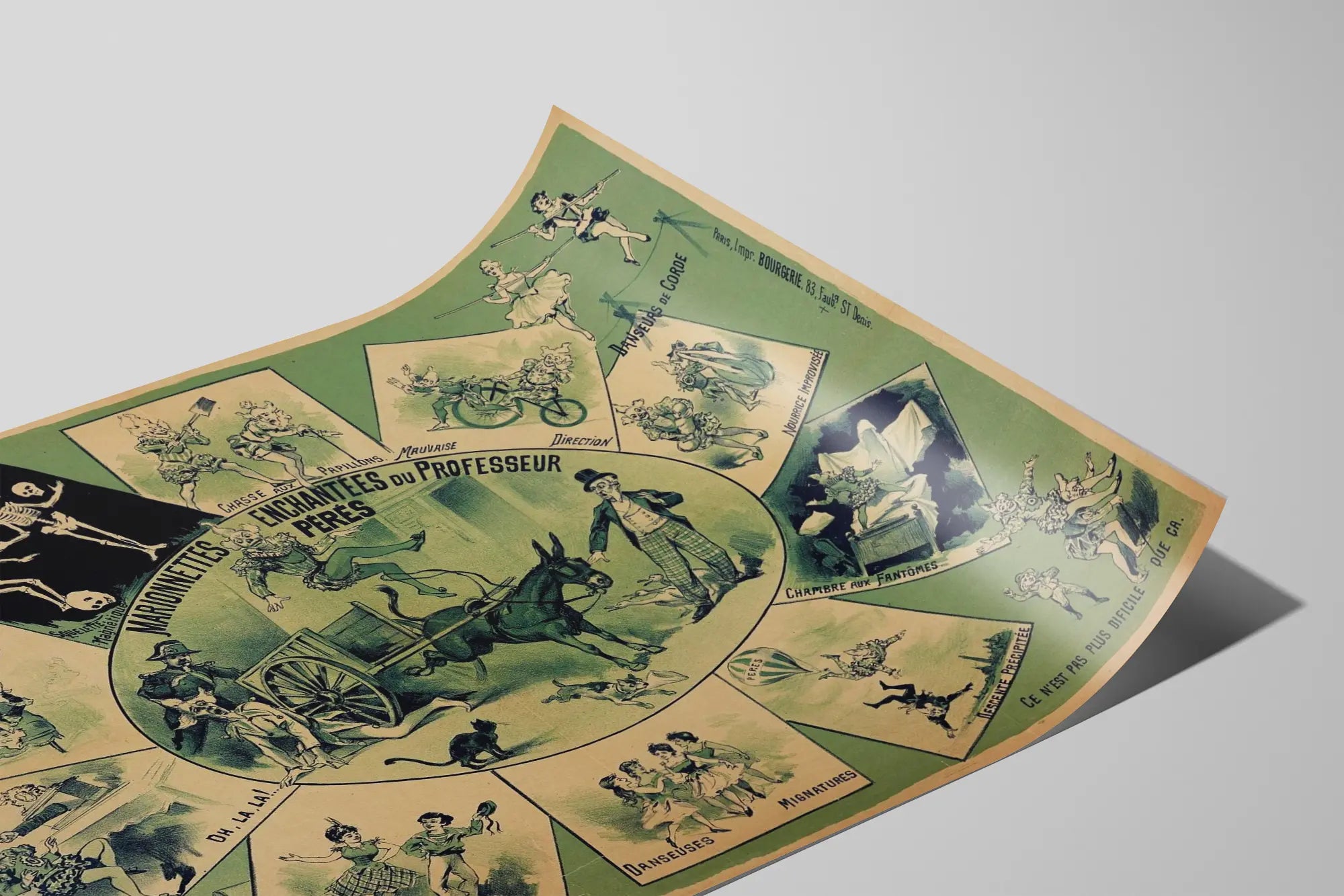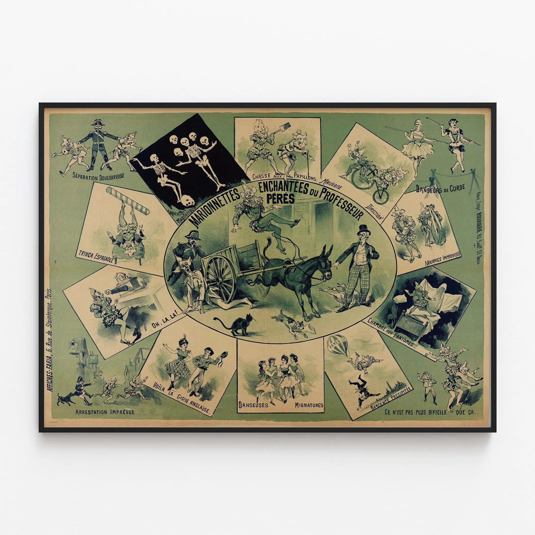 Tämä vintage juliste nimeltä « Marionettein Taikatemppuja Professori Péresin » on alkuperäinen seinäkoriste, joka viehättää marionettiteatterin ja vanhojen kuvittusten ystäviä. Se esittää keskitetyn koostumuksen, jota ympäröivät kuvitetut kohtaukset, joissa elävät erilaiset humoristiset ja mielikuvitukselliset marionettinäytökset. Piirrokset esittävät pukuihin pukeutuneita hahmoja eri tauluissa, joissa yhdistyvät mielikuvitus, huumori ja pukukuvat: tanssivat luurangot, narutanssijat, perhosenmetsästys ja "aavehuoneen" kohtaukset kuvaavat teatterimaista, runsaasti elävää maailmaa.