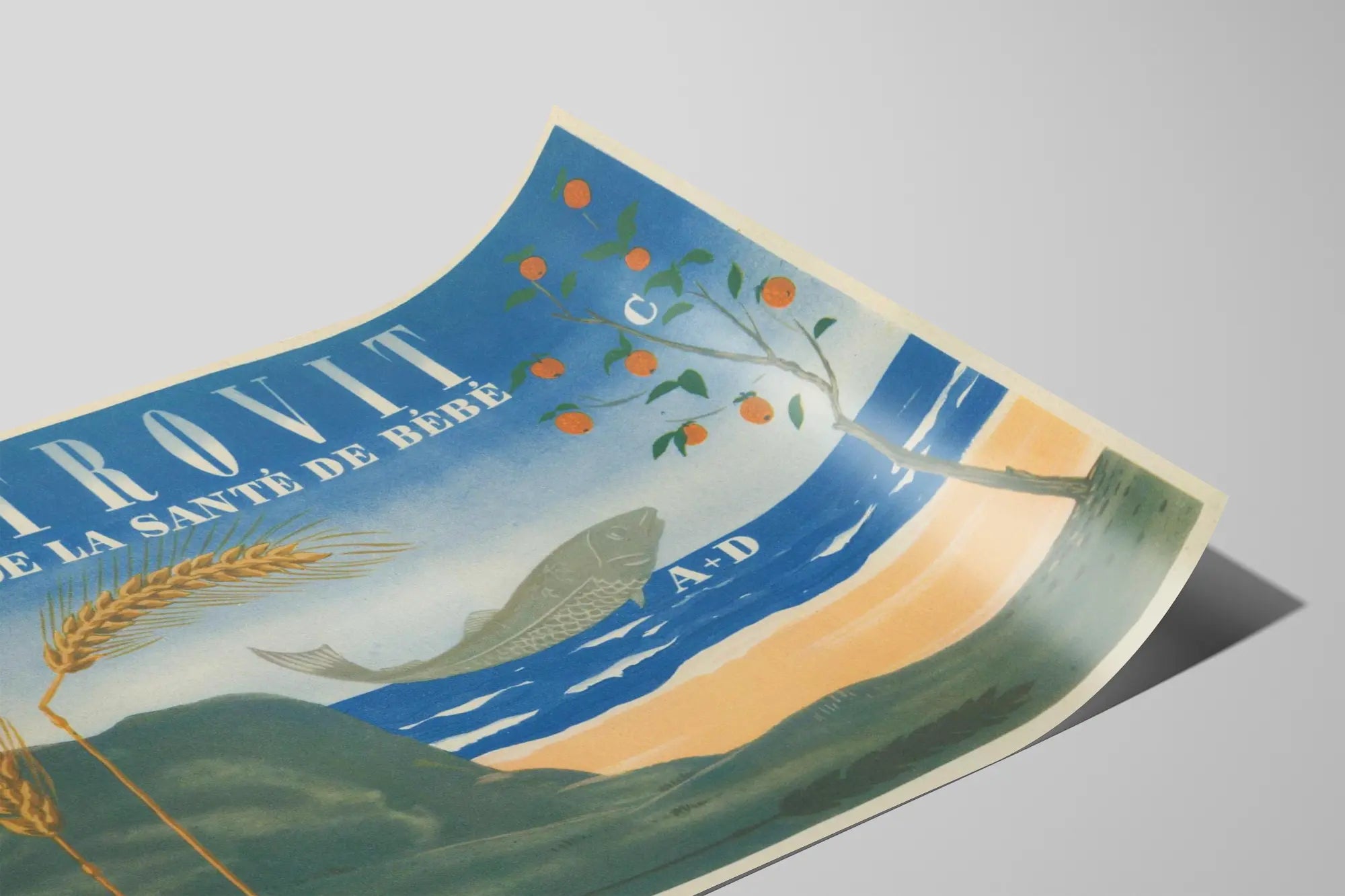 Tutustu tähän vintage- julisteeseen Nestrovit, joka korostaa vauvan terveyden ABC:tä, todellista seinäkoristeen osaa retro- ja opettavaiseen tyyliin. Tämä juliste esittää yksinkertaisesti ja värikkäästi välttämättömät vitamiinit lasten terveydelle, jotka on esitetty luonnollisina elementteinä. Taustalla, joka muuttuu taivaan sinisestä hiekkapohjan sävyyn, on viljan tähkä, joka liittyy B1-vitamiiniin, kala, symboloiden A- ja D-vitamiineja, sekä hedelmällinen puu, jonka oranssit hedelmät muistuttavat C-vitamiinista. Tämä visuaali välittää selkeän ja opettavaisen viestin vitamiinien hyödyistä pienille lapsille, hillityssä ja pehmeän sävyisessä suunnittelussa, joka luo lämpimän ja luonnollisen tunnelman lastenhuoneeseen tai hoitotilaan. Tämä koristejuliste on ihanteellinen vintage-seinäkoristeen ystäville tai niille, jotka haluavat tuoda sisustukseensa sekä esteettistä että informatiivista elementtiä lasten terveydestä. Sen yksinkertainen grafiikka ja rauhoittavat värit sopivat kaikenlaiseen sisustukseen, lisäten aitouden ja viehättävyyden tuntua seinillesi. Täydellinen käytettäväksi kehyksissä, seinätauluna tai osana teemallista seinäkompositiota, joka keskittyy lasten terveyteen tai hyvinvointiin, tämä seinäkoriste yhdistää viehätyn ja käytännöllisyyden. Anna tilallesi vintage-henkeä, joka muistuttaa vitamiinien merkityksestä kasvussa, samalla tuoden ainutlaatuisen taiteellisen kosketuksen. Tämä seinätaulu on erinomainen valinta niille, jotka haluavat yhdistää taiteen ja opetuksen sisustuksessaan.