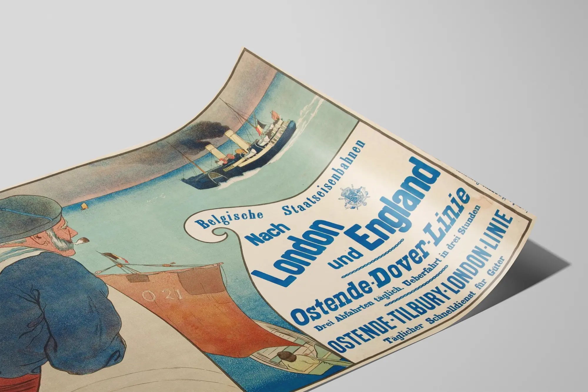 Löydä tämä ainutlaatuinen vintage- juliste, joka kuvaa matkaa Belgian rautatieverkon kautta Lontooseen ja Englantiin, keskittyen erityisesti Ostenden lähtöihin. Tämä seinäkoriste tallentaa historiallisia merimaisemia, joissa sinisessä univormussa oleva merimies ja matkustajajoukko katsovat Belgian höyrylaivaa, joka savuaa merellä. Juliste esittelee Ostende-Dover -linjaa ja Ostende-Tilbury-Lontoo -yhteyttä, korostaen päivittäisiä ja nopeita yhteyksiä Belgian ja Englannin välillä. Tämä juliste on täydellinen liikennehistorian harrastajille, vintage-seinäkoristeiden ystäville tai kaikille, jotka haluavat lisätä retrovivahteen sisustukseensa. Pehmeät värit ja graafiset yksityiskohdat antavat tälle julisteelle vaikuttavan koristeellisen estetiikan, joka sopii erinomaisesti luomaan nostalgisen tunnelman ja matkustamaan ajassa taaksepäin. Se tuo sisustukseesi kulttuurisen ja historiallisen ulottuvuuden, olipa kyseessä olohuone, toimisto tai käytävä. Tämä seinätaulu todistaa vanhojen eurooppalaisten meriliikenne- ja rautatieyhteyksien viehätystä, tarjoten tilallesi tyylikkään ja aidoan ilmeen. Valitse tämä alkuperäinen juliste, joka yhdistää taiteen ja liikenteen historian, rikastuttaen seinäkoristekokoelmaasi esineellä, joka on täynnä historiaa ja tyyliä.
