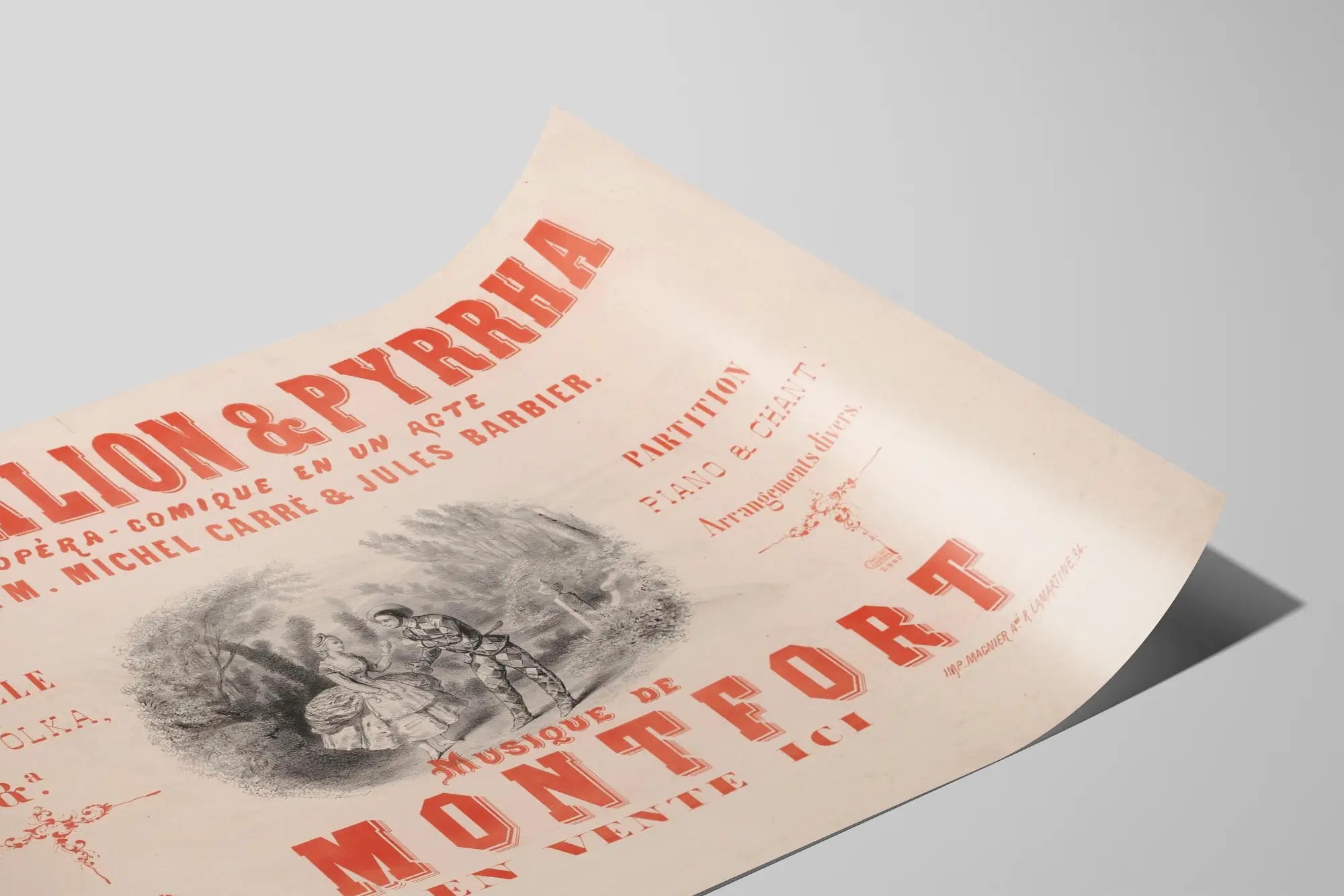 Lisää klassisen eleganssin kosketus seinäkoristeluusi tämän vintage- julisteen avulla, joka esittää oopperan "Deucalion & Pyrrha" komediallisen näytelmän, Michel Carrén ja Jules Barbierin yhden näytöksen teosta. Tämä seinätaide korostaa rohkeita typografisia kirjaimia ja herkkää keskiosaa, jossa on kaksi pukuloisteltua hahmoa maalaismaisemassa. Täydellinen oopperan ja ajattoman seinäkoristeen ystäville, tämä juliste viittaa 1800-luvun hienostuneeseen maailmaan, sisältäen viittauksia quadrilleen, valssiin ja polkkaan, ja siihen liittyy piano- ja laulukappaleen nuotit. Punaisen sävyt beigeä taustaa vasten takaavat helpon soveltuvuuden erilaisiin sisustustyyleihin, olohuoneesta kirjastoon ja toimistoon. Tämä seinätaulu on ihanteellinen rikastuttamaan kulttuuri- tai musiikkitilaa, luoden lämpimän ja taiteellisen ilmapiirin, joka viehättää klassisen musiikin ja oopperan harrastajia. Paljasta ainutlaatuinen osa kokoelmassasi tämän huolellisesti suunnitellun graafisen julisteen avulla, joka yhdistää musiikillisen historian retro-tyyliin, täydellinen korostamaan jokaisen tilan luonnetta ja omaleimaisuutta.