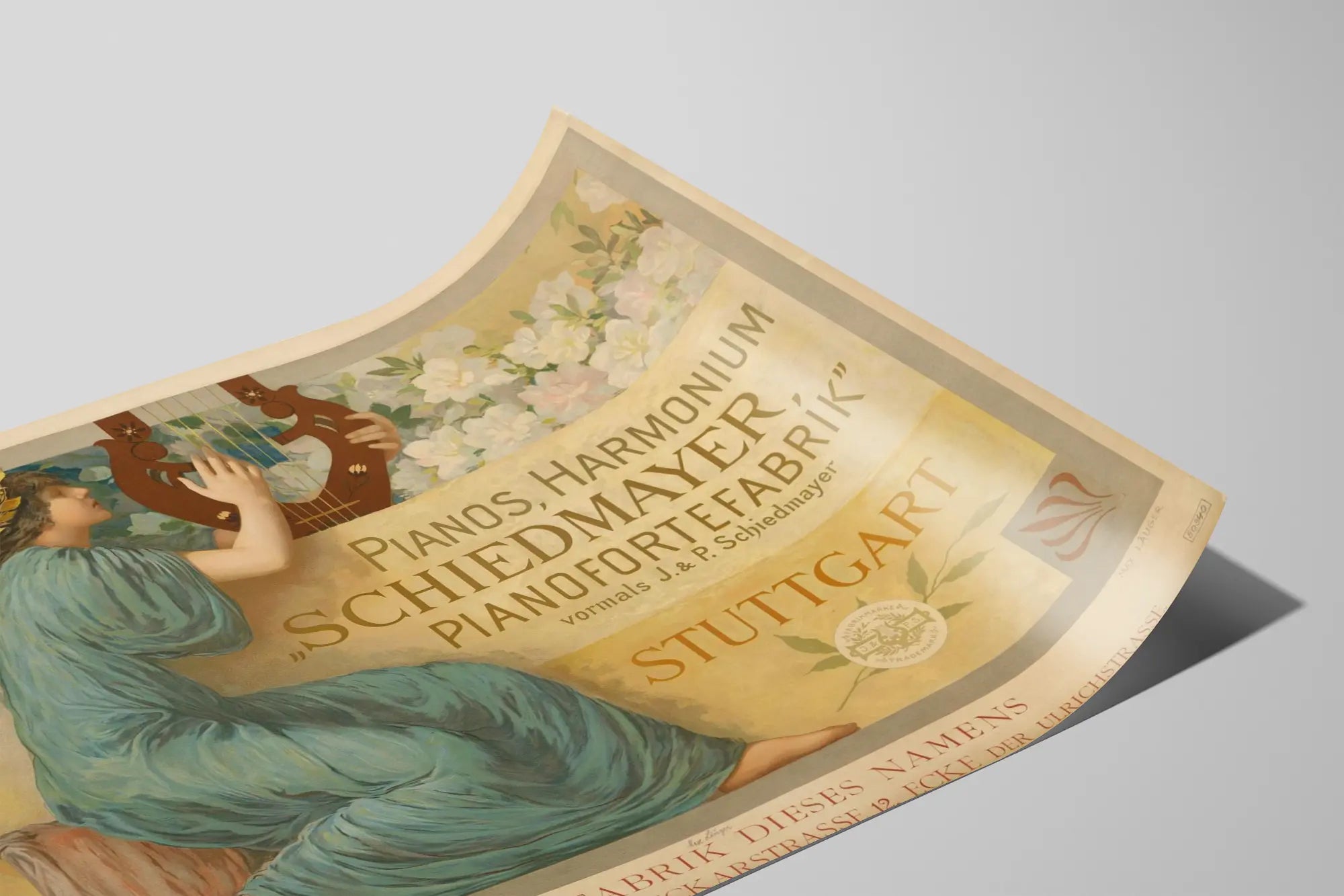 Lisää kodin sisustukseesi klassisen eleganssin kosketus tämän vintage- julisteen avulla, joka esittää Schiedmayerin, Stuttgartissa sijaitsevan kuuluisan flyygelivalmistajan, mainosta. Tämä seinäkoriste kuvaa hienovaraisesti nuorta naista pitkine hiuksineen, pukeutuneena kevyesti siniseen virtaavaan mekkoon, soittamassa koristeellista puista harppua, vanhan ja hienostuneen taiteellisen tyylin mukaisesti.