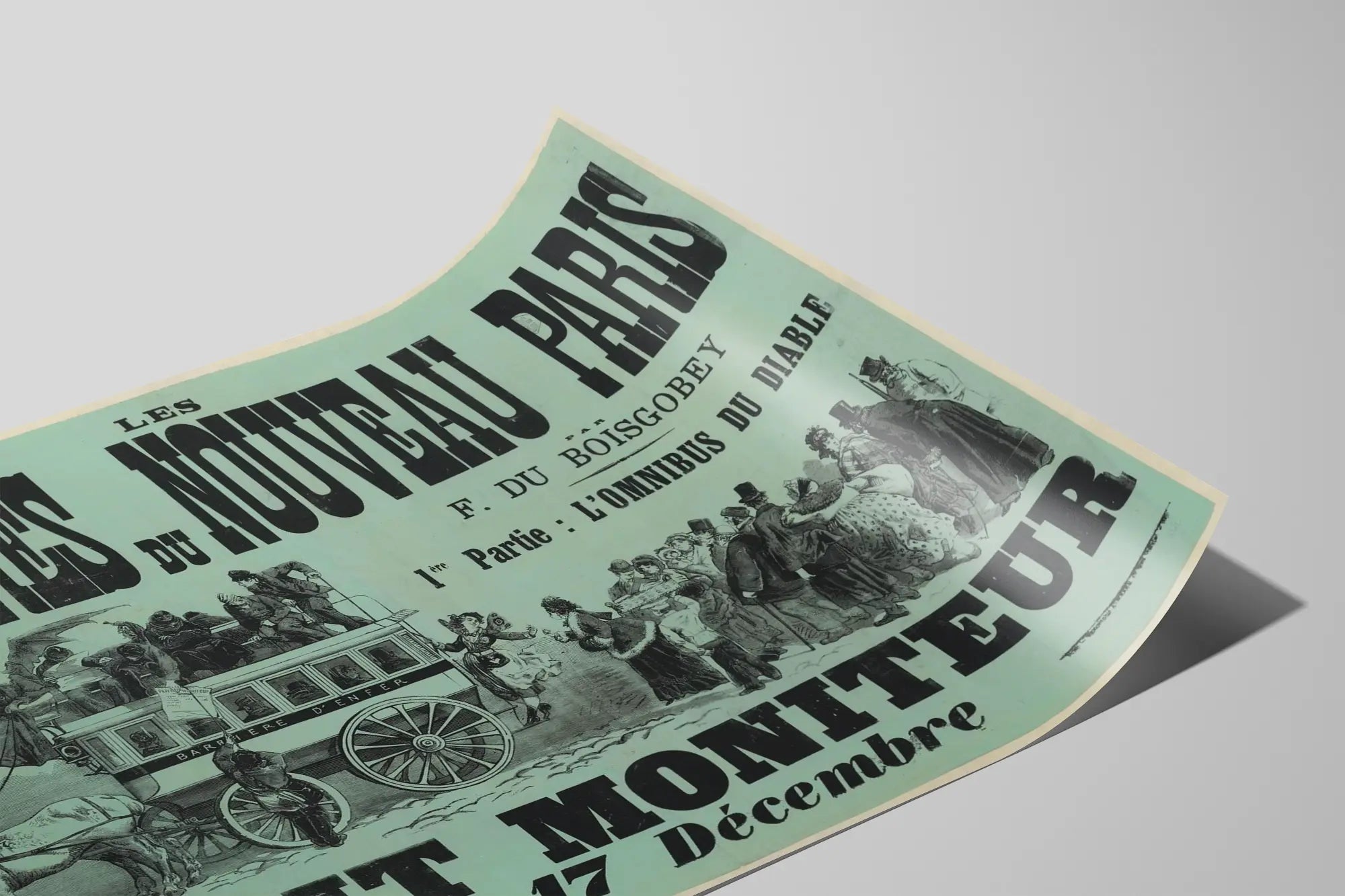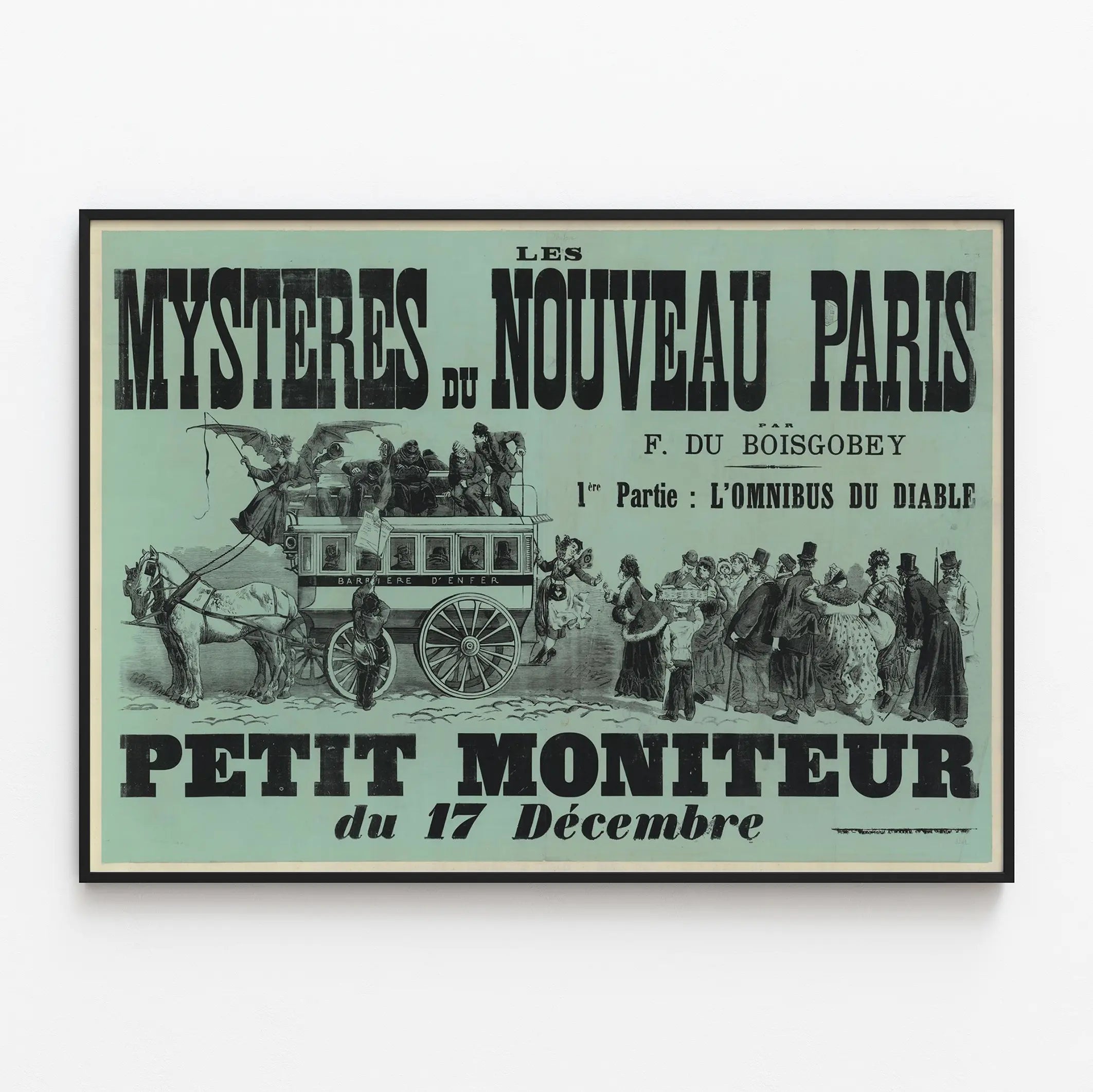 Tämä vintage juliste nimeltä "Les Mystères du Nouveau Paris", jonka on tehnyt F. du Boisgobey, on seinäkoriste, joka viehättää historiallisten taiteen ystäviä ja vanhan graafisen suunnittelun harrastajia. Esittäen vilkkaan kohtauksen "L'Omnibus du Diable" -nimisen omnibuksen ympärillä, tämä juliste yhdistää tekstiä ja kuvaa tyypilliseen 1800-luvun tyyliin, muistuttaen aikakauden julisteita ja kuvitetuimpia sanomalehtiä.