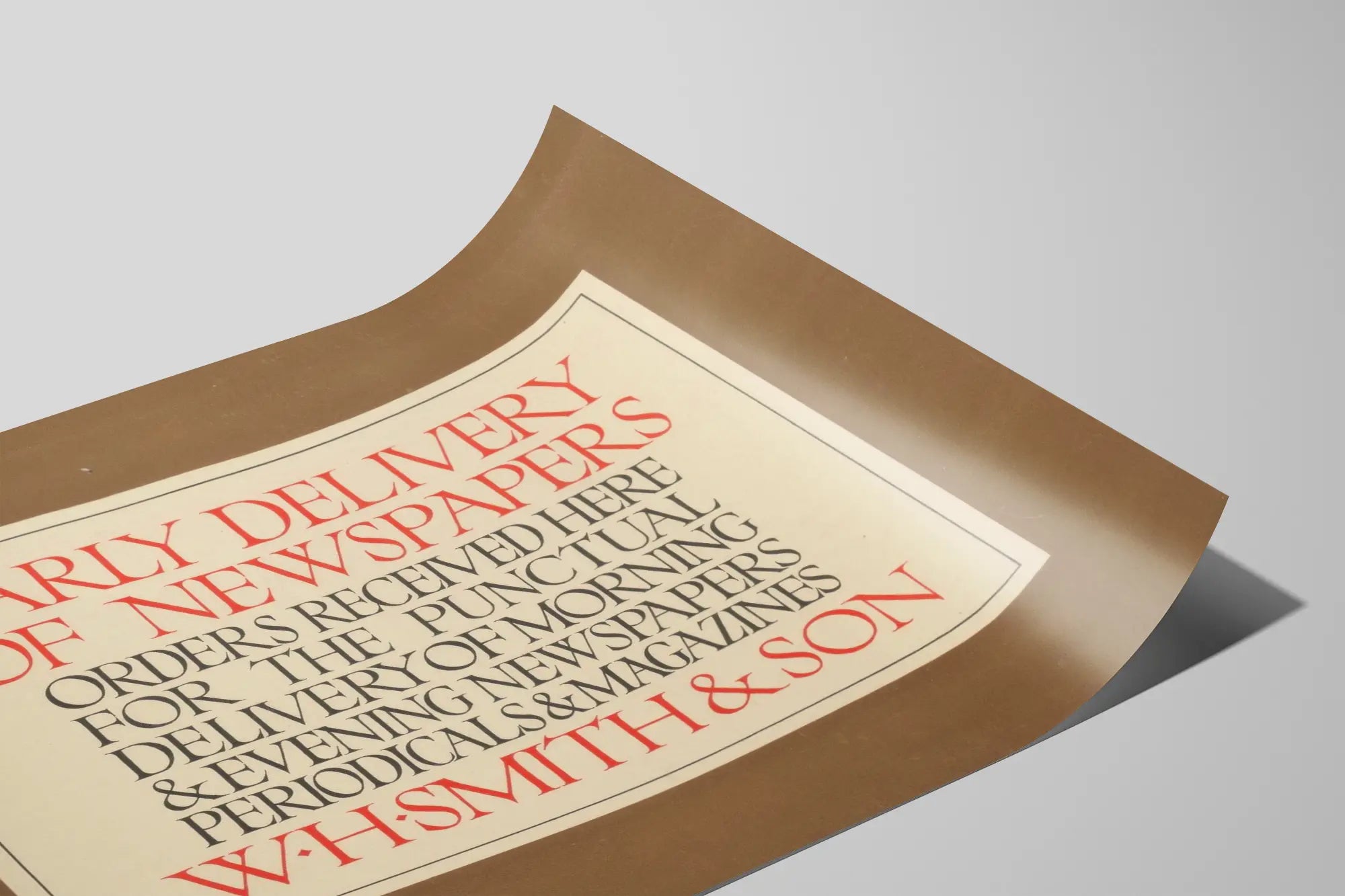 Tämä vintage- juliste korostaa W.H. Smith & Sonin tarjoamaa aamulähetyspalvelua. Sen erottuvan typografisen suunnittelun ansiosta se ilmoittaa tilausten vastaanottamisesta täsmälliseen aamu- ja iltapäivälehtien sekä aikakauslehtien ja lehtien toimitukseen. Tämä seinäkoriste, joka on ihanteellinen klassisen typografian ja retro-tyylisen muotoilun ystäville, tuo sisustukseesi aitoa ja nostalgista tunnelmaa. Olipa kyseessä toimistotila, kirjasto tai lukusali, tämä vanha juliste viittaa painetun sanan historialliseen merkitykseen ja kunnioittaa huolellista sanomalehtien jakelupalvelua. Sen hillitty värikäs kehys ja vaalea tausta korostavat tekstin luettavuutta, tarjoten kauniin graafisen tasapainon. Tämä juliste sopii täydellisesti vintage- seinäkoristeeksi, luoden aikakauden tunnelman kaikenlaisissa tiloissa. Tämä juliste on erinomainen valinta sisustettaessa viestintään tai kirjallisuuteen liittyviä tiloja, samalla korostaen typografian taidetta ja W.H. Smith & Sonin ammatillista perinnettä.
