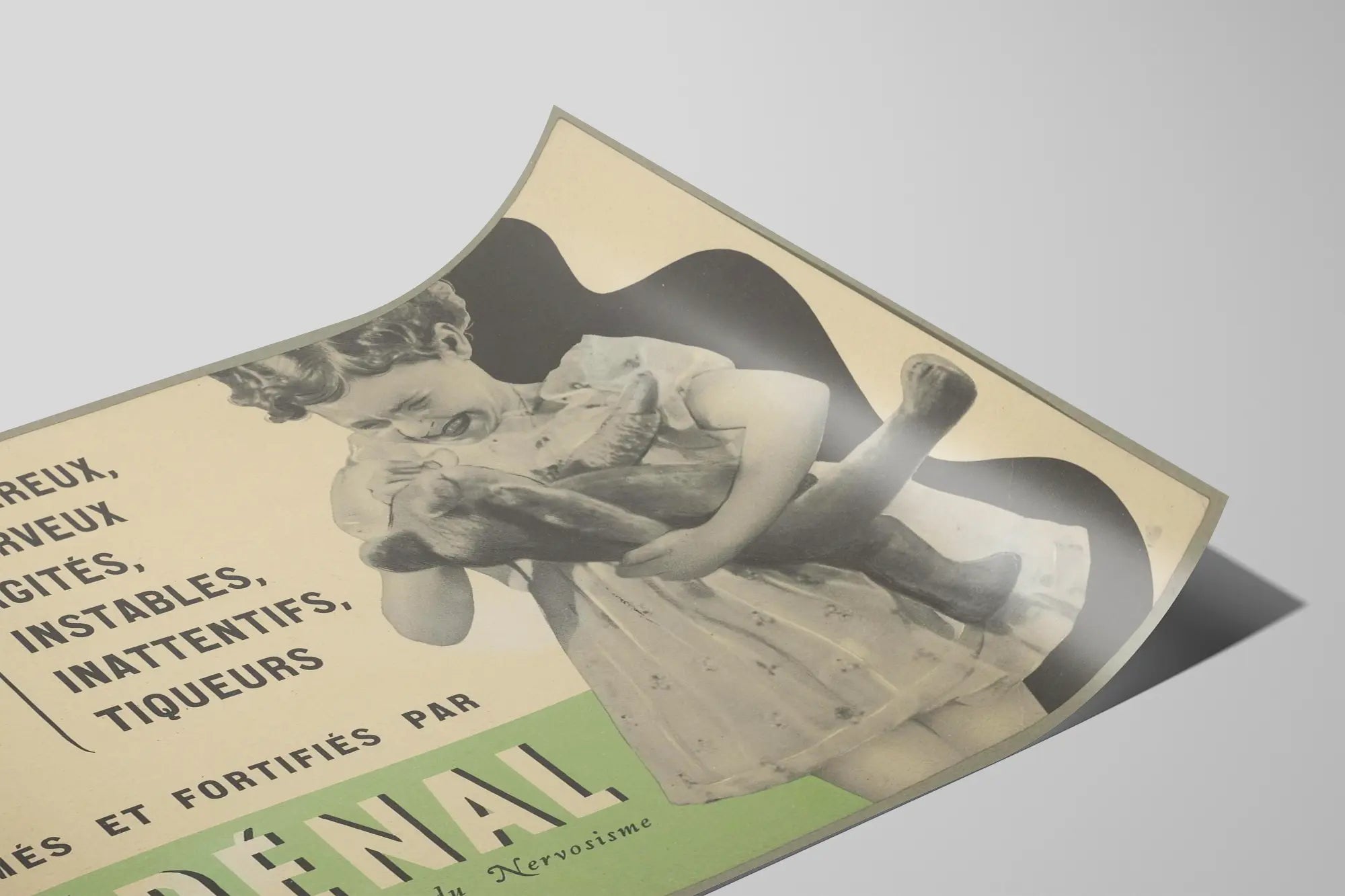 Tutustu tähän alkuperäiseen vintage-mainokseen, joka on omistettu seinäkoristeelle ja korostaa järkevää hoitoa hermostuneisuuteen lapsilla ja nuorilla Bédénal-tuotteen avulla. Tämä retro-tyylinen mainosjuliste esittää pienen tytön valkoisessa mekossa, joka puristaa isoa pehmolelua ja näyttää ahdistuneelta, vahvistaen ajatusta hermostuneisuushäiriöihin liittyvästä huolesta lapsilla. Visuaalinen kokonaisuus täydentyy vahvalla ja selkeällä typografisella viestillä, joka viittaa tämän hoidon kohdistamiin eri tunne-tiloihin: kiukkuinen, hermostunut, levoton, epävakaa, epähuomioinen ja nykiminen. Kaksivärisellä beige- ja pastellinvihreällä taustalla sanat on aseteltu huomiota herättävästi ja visuaalisesti vaikuttavasti, helposti ymmärrettävästi ja esteettisesti miellyttävästi. Tämä juliste on ainutlaatuinen seinäkoriste, joka sopii erityisesti retro-tyylin ystäville, vanhojen mainosjulisteiden keräilijöille tai niille, jotka haluavat tuoda vintage-tyyliä terveyteen tai lapsuuteen liittyvään tilaan. Ihanteellinen olohuoneisiin, lääkärin vastaanottoihin, odotustiloihin tai lastenhuoneisiin, ja sen omalaatuinen koristeellinen lähestymistapa tuo historiallista vivahdetta mihin tahansa seinään. Korosta tilojasi tällä painetulla julisteella, joka yhdistää taiteen ja viestinnän varjojen ja valojen kautta luoden tyypillisen retro-ilmapiirin. Seinäkoriste, joka yhdistää opetuksellisen sisällön ja estetiikan, korostaen sisätilojasi nostalgian vivahteella.