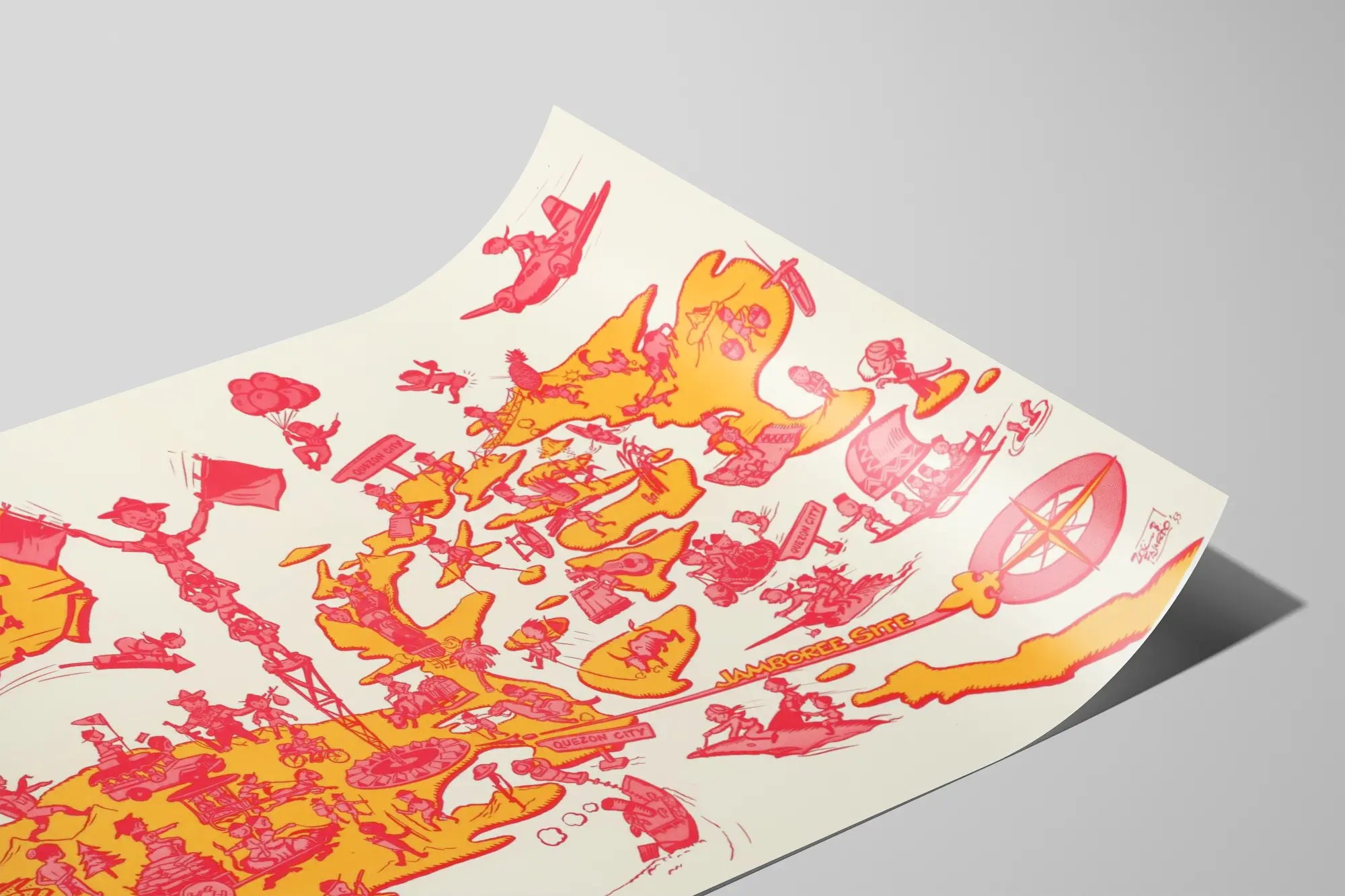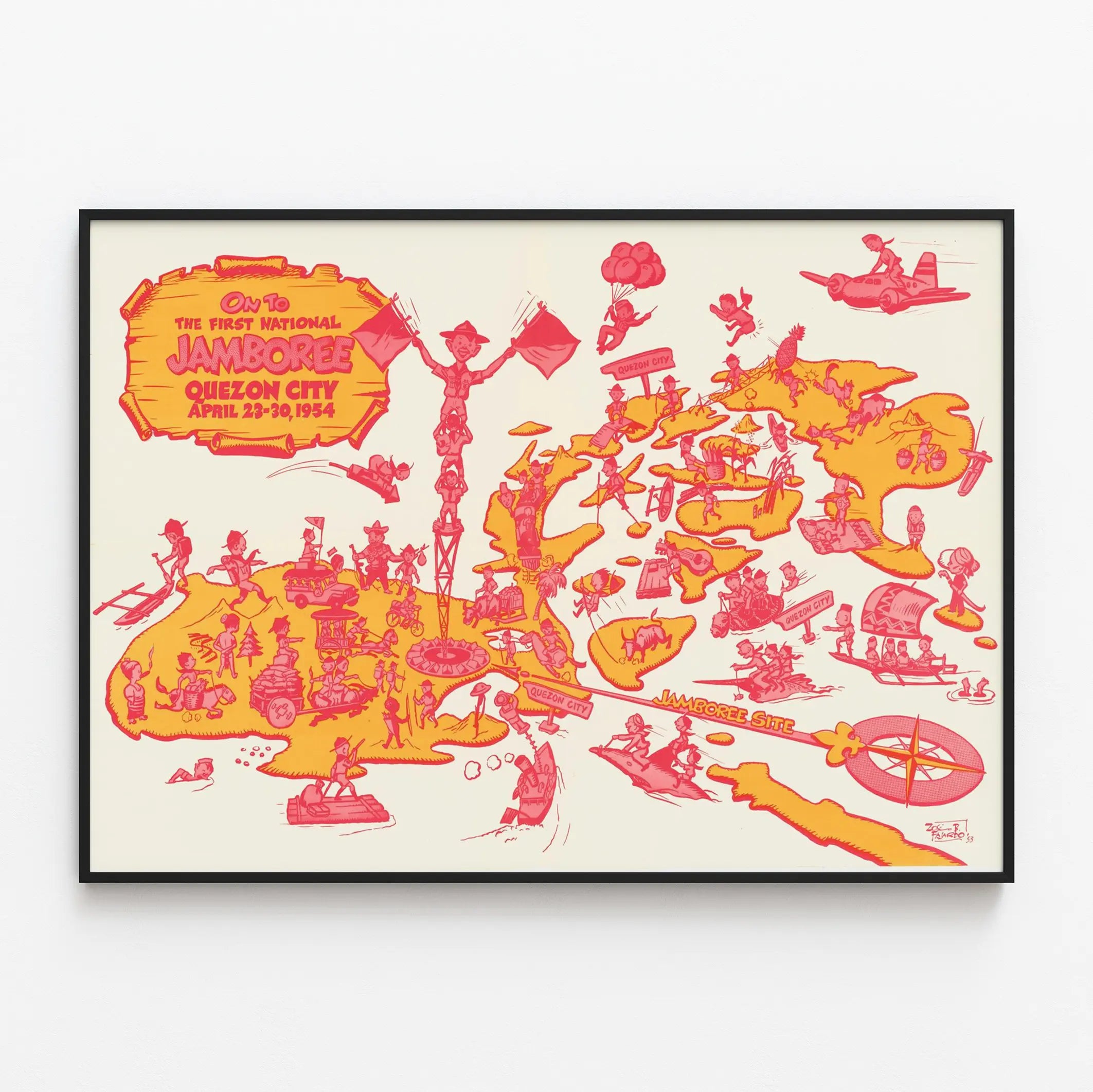 Lisää sisustukseesi ripaus omaperäisyyttä ja historiaa tämän vintage-plakaatin nimeltä "On To The First National Jamboree". Tämä juliste esittää värikkään ja elävän kartan, jossa on oransseja ja punaisia sävyjä, ja se kuvaa tapahtumaa, joka järjestettiin Quezon Cityssä 23. – 30. huhtikuuta 1954. Kartta piirtää tyylitellyn alueen, jossa on lukuisia pieniä kohtauksia elämästä ja toiminnasta, esittäen partiolaisia liikkeessä – kävellen, pyöräillen, laivalla, eläinten kanssa ja jopa lentokoneessa. Retro-tyylinen graafinen ilme, terävillä viivoilla ja lämpimillä väreillä, tekee siitä täydellisen seinäkoristeen vintage- ja leikkisän muotoilun ystäville.