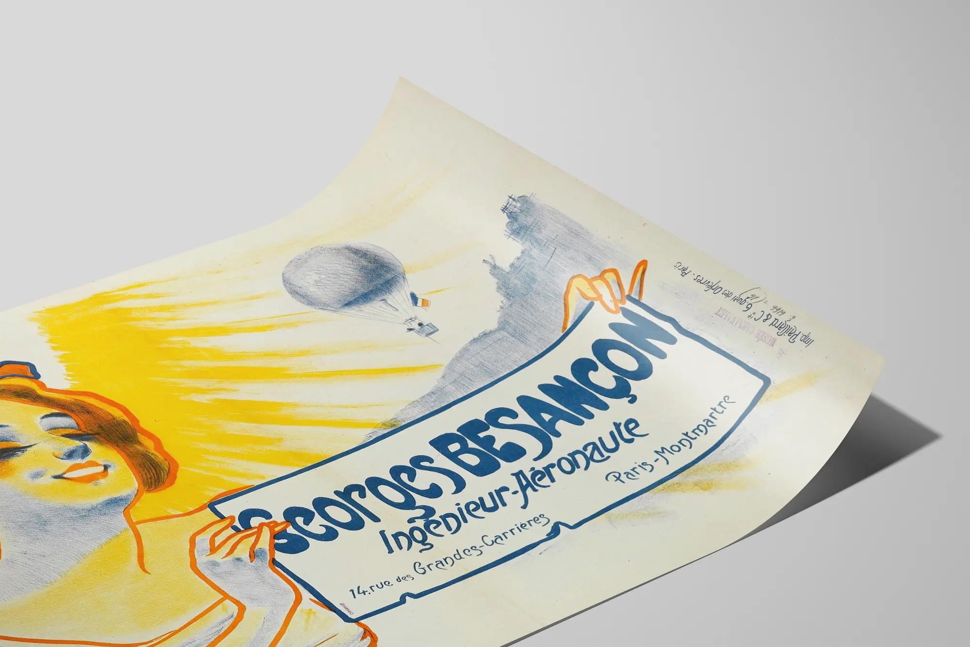 Tämä vintage-plakaatti esittelee Georges Besançonin, insinöörin ja ilmailun harrastajan, taiteellisesti ja omaperäisesti 1900-luvun alun tyyliin. Siinä nähdään hymyilevä naisfiguuri, pukeutuneena vanhanaikaiseen tyyliin, joka pitää kyltissä nimeä ja ammattia Georges Besançonille. Vaalean taustan elävöittää keltaiset säteet, jotka viittaavat aurinkoon, ja ne valaisevat myös lentopallon ilmassa, symbolina aikakauden ilmailusta. Oikealla erottuu arkkitehtoninen siluetti, todennäköisesti näkymä Montmartresta Pariisissa, muistuttaen alareunassa mainittua osoitetta: 14 rue des Grandes-Carrières, Paris-Montmartre.