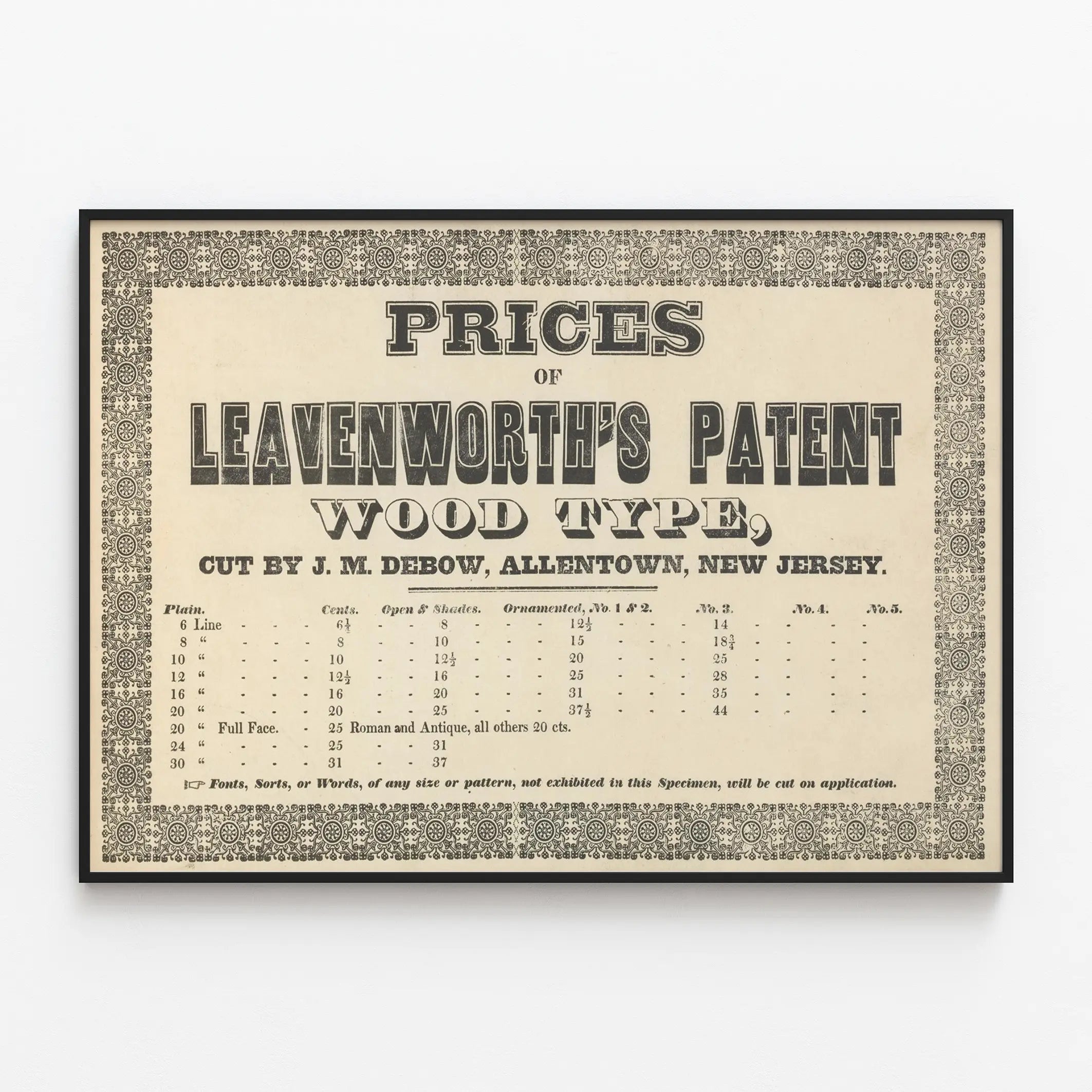 Tutustu tähän alkuperäiseen vintage-plakaattiin, joka esittelee kuuluisan Leavenworth’s Patent Wood Type -puutyyppikirjasintyypin hinnat. Tämä vanha typografinen kappale on ympäröity hienovaraisella kukkakoristeisella kehyksellä, joka on tyypillinen aikakauden muotoilulle, tehden siitä sekä esteettisen että historiaa huokuvan seinäkoristeen. Tämä harvinainen juliste esittelee erilaisten puutyyppien tyylejä ja kokoja, sisältäen tarkat hintatiedot eri leveyksistä ja koristeista, vaihdellen yksinkertaisesta tasaisesta puusta koristeellisiin versioihin. Se kuvaa niin painokoneiden erityispiirteitä kuin aikakauden graafista ilmettä, tehden siitä täydellisen sisustuselementin, joka on omistautunut typografialle, painohistorialle tai vintage-tyyliselle suunnittelulle. Tämä seinätaulu sopii erinomaisesti toimistoon, kirjastoon tai luovaan tilaan, jossa se tuo persoonallisuutta ja inspiraatiota. Sisustuksessa juliste luo retro-efektin vaalean kermanvärisellä hieman kuluneella taustalla ja eri typografioilla varustetuilla mustilla kirjaimilla, jotka kiinnittävät huomion. Vanha typografia ja koristeellinen reunus vahvistavat sen aitouden ja klassisen viehätyksen. Tämä typografinen juliste on ainutlaatuinen teos graafisen suunnittelun ja painohistorian harrastajille, tarjoten alkuperäisen ja opettavaisen koriste-elementin. Olipa se kehystetty tai pelkästään seinälle ripustettu, tämä vintage-seinäkoriste erottuu poikkeuksellisena design-esineenä, jonka voi esitellä ylpeänä.