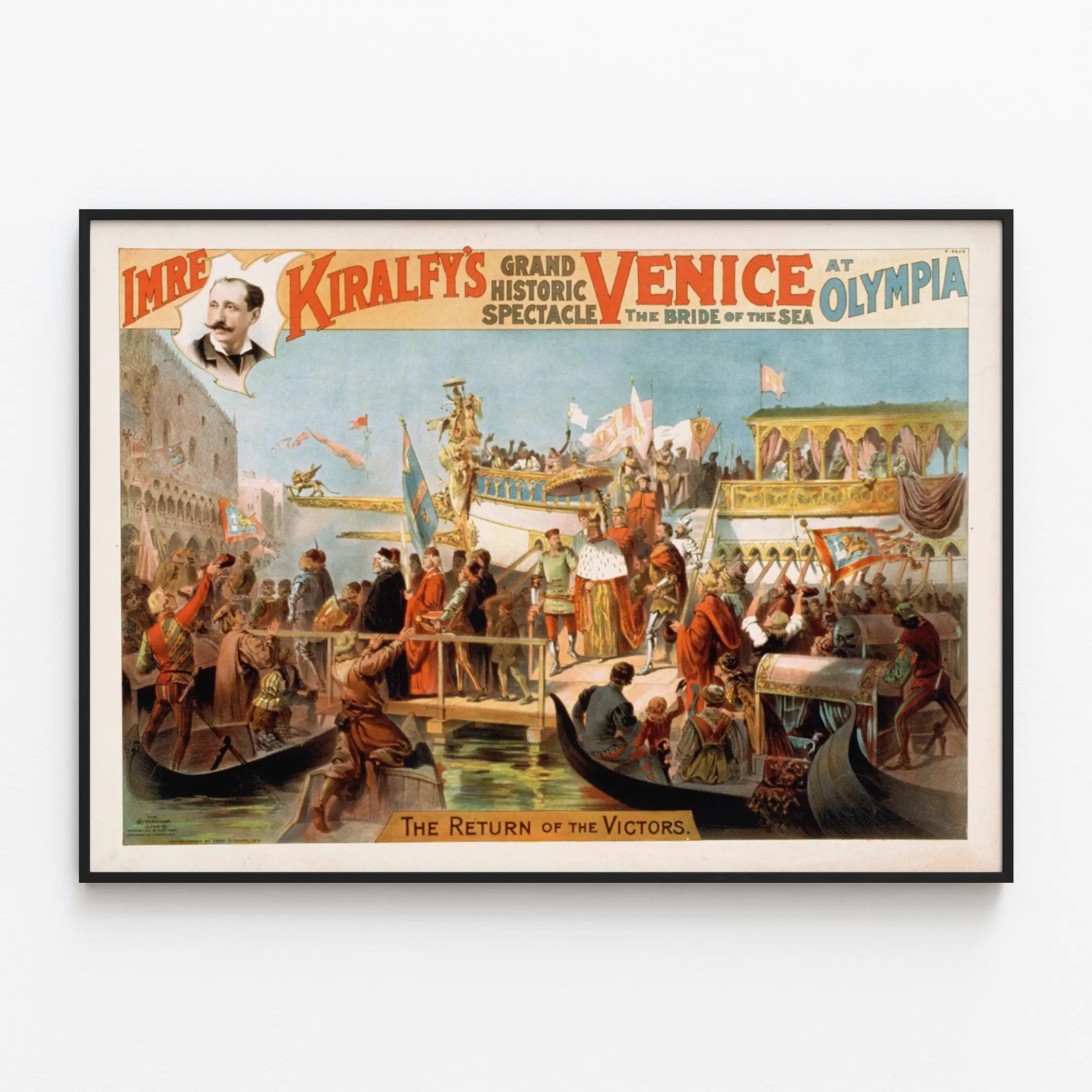 Tutustu tähän vintage-tyyliseen julisteeseen suuresta historiallisesta näytelmästä nimeltä «Venetsia, meren morsian Olympia», joka esittää voittoisaa paluuta Venetsian kanaaleille. Tämä värikäs taidegrafiikka kuvaa yksityiskohtaisen kohtauksen, jossa on aikakauden pukuihin pukeutuneita hahmoja, koristeltuja veneitä ja liput liehumassa, luoden juhlavan ja majesteettisen tunnelman. Täydellinen vanhan ajan inspiroimaan seinäkoristukseen, tämä taidegrafiikka herättää esiin venetsialaisen eleganssin ja kulttuurin huolellisesti toteutetun taiteellisen esityksen kautta. Tämä seinätaulu tuo kotiisi historian ja aitouden vivahteen, klassisilla sävyillään ja dynaamisella koostumuksellaan. Ihanteellinen taide-esineiden harrastajille ja kulttuuriperinnön ystäville, tämä vintage-tyylinen juliste on ainutlaatuinen kappale, jolla voit personoida asuintilasi tai työtilasi.